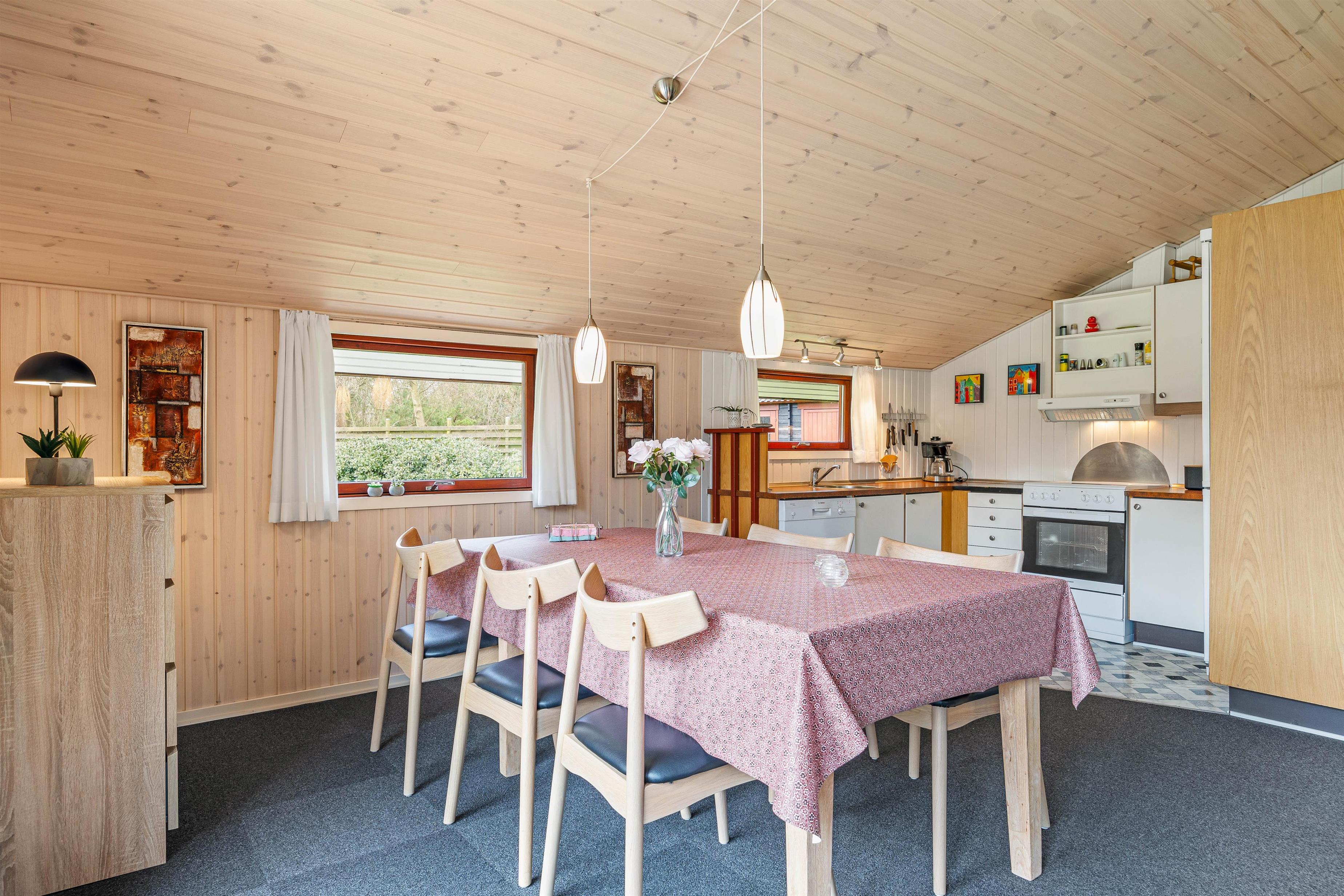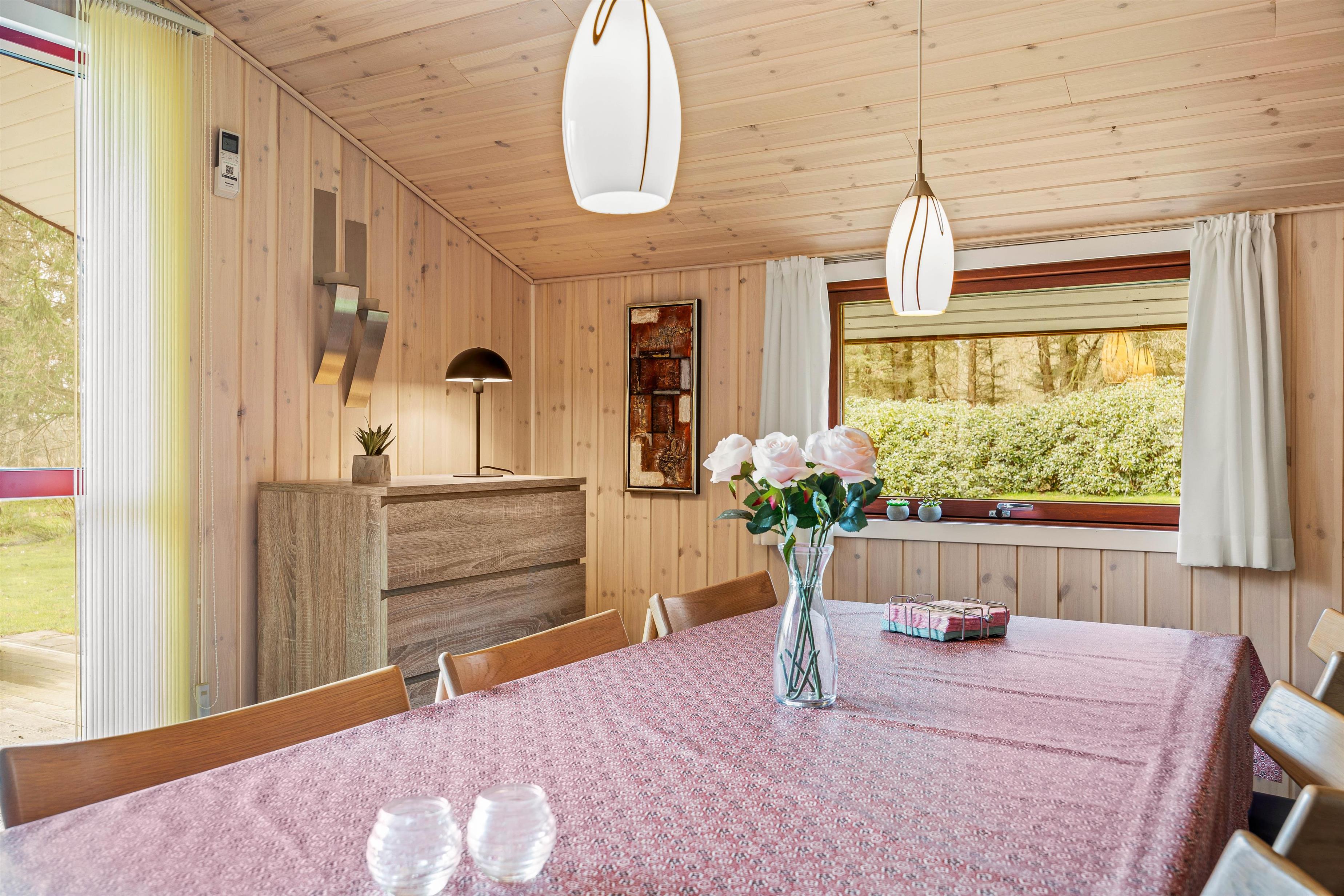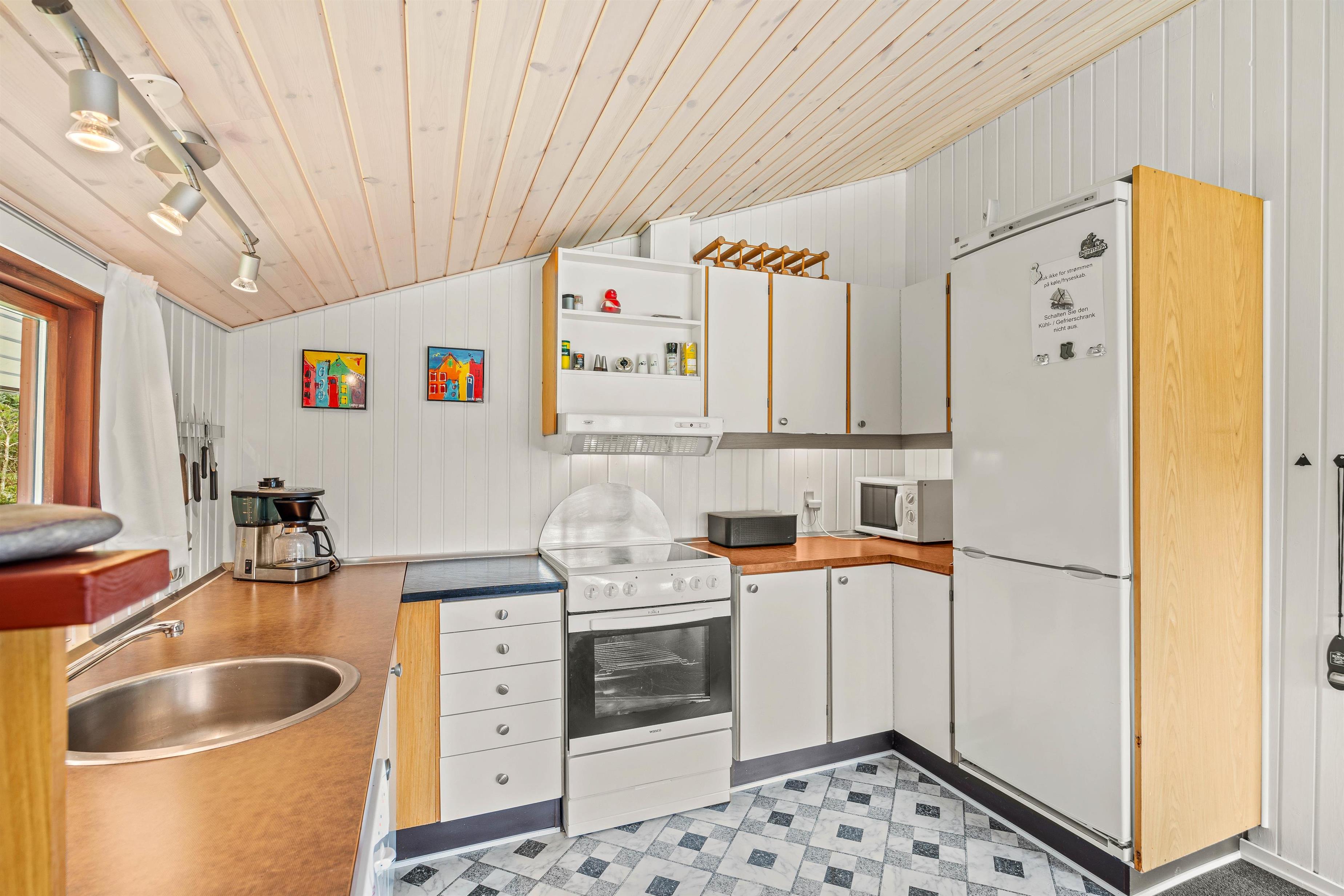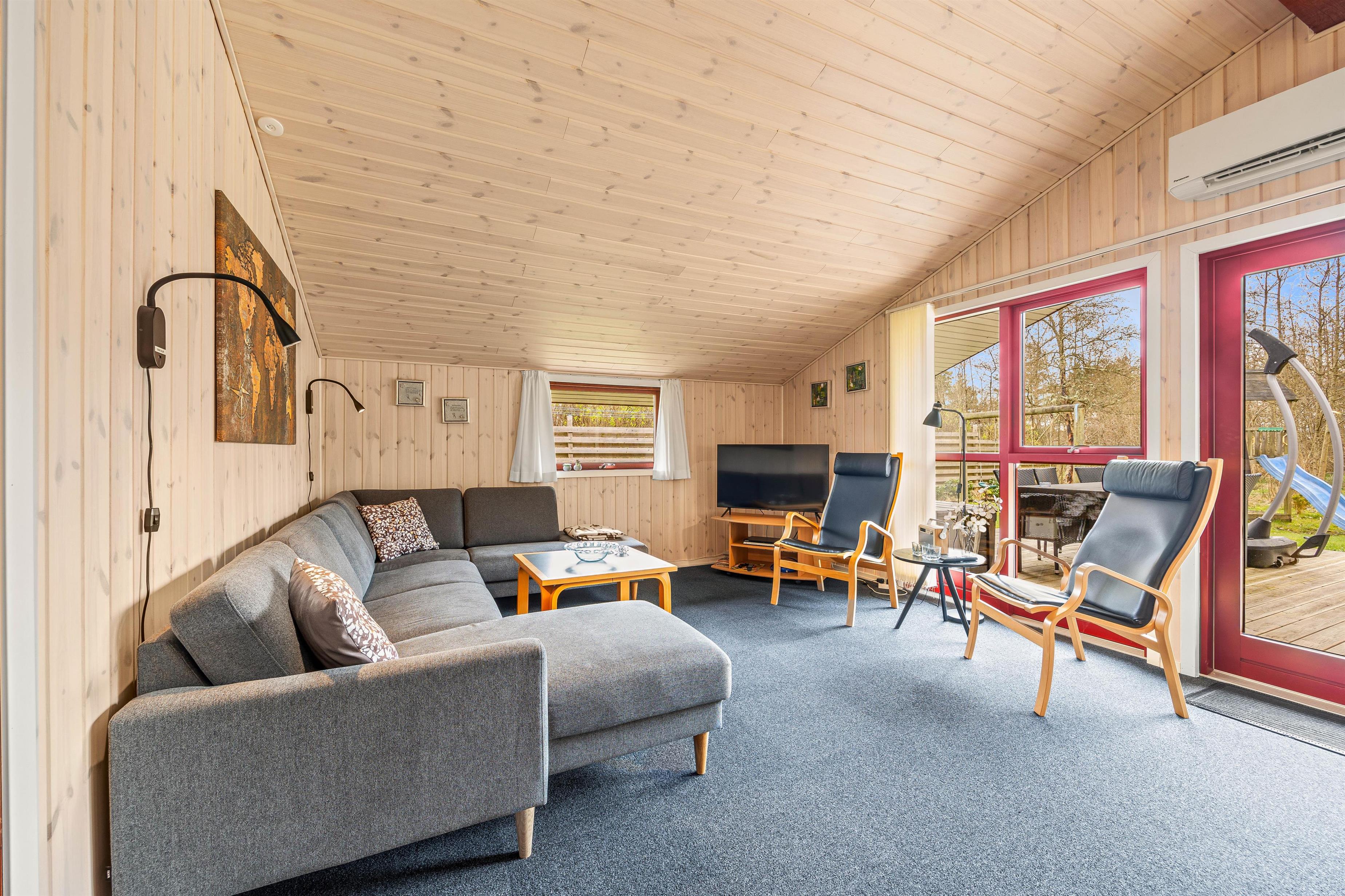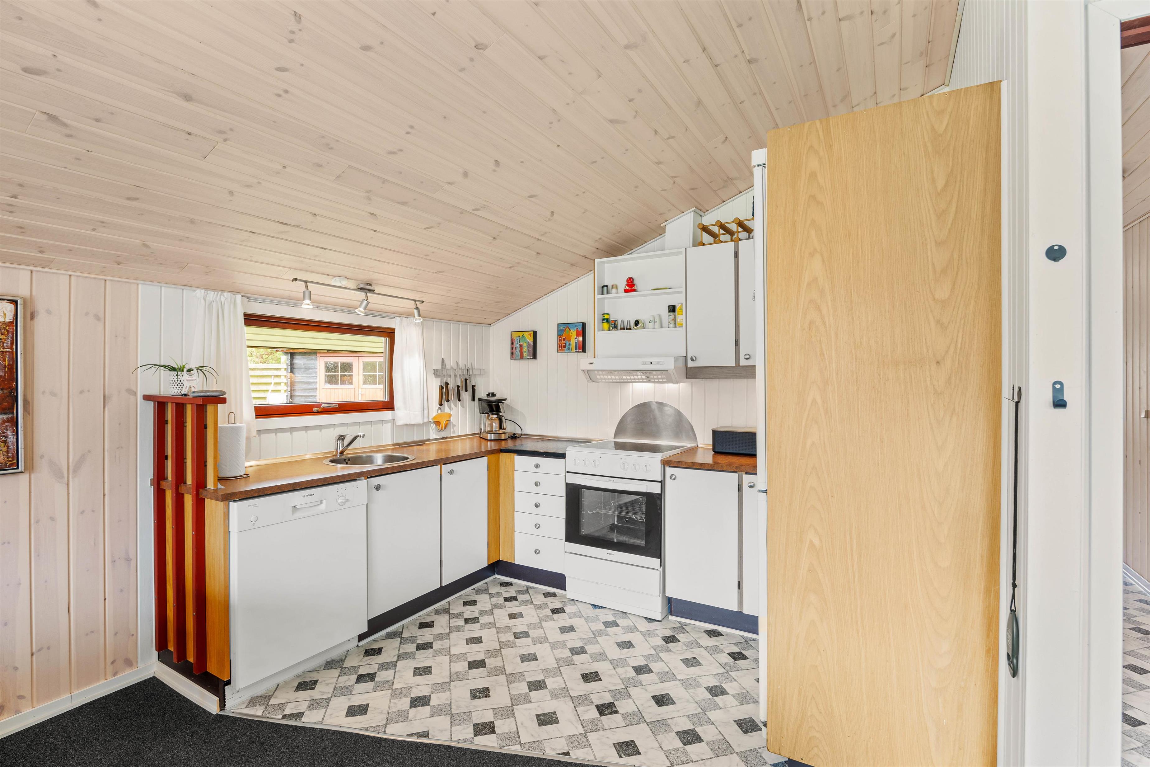 Ferien begynder, så snart I har parkeret bilen foran feriehuset. Feriehusets hjerte er det åbne køkkenalrum, der kombinerer stue og køkken i ét. Takket være den energibesparende varmepumpe er I sikret et behageligt indeklima. Det velfungerende køkken er udstyret med både opvaskemaskine og mikroovn, hvor I hurtigt kan poppe popcornene til filmaftnen. Saml familien og sæt jer godt til rette i hjørnesofaen.