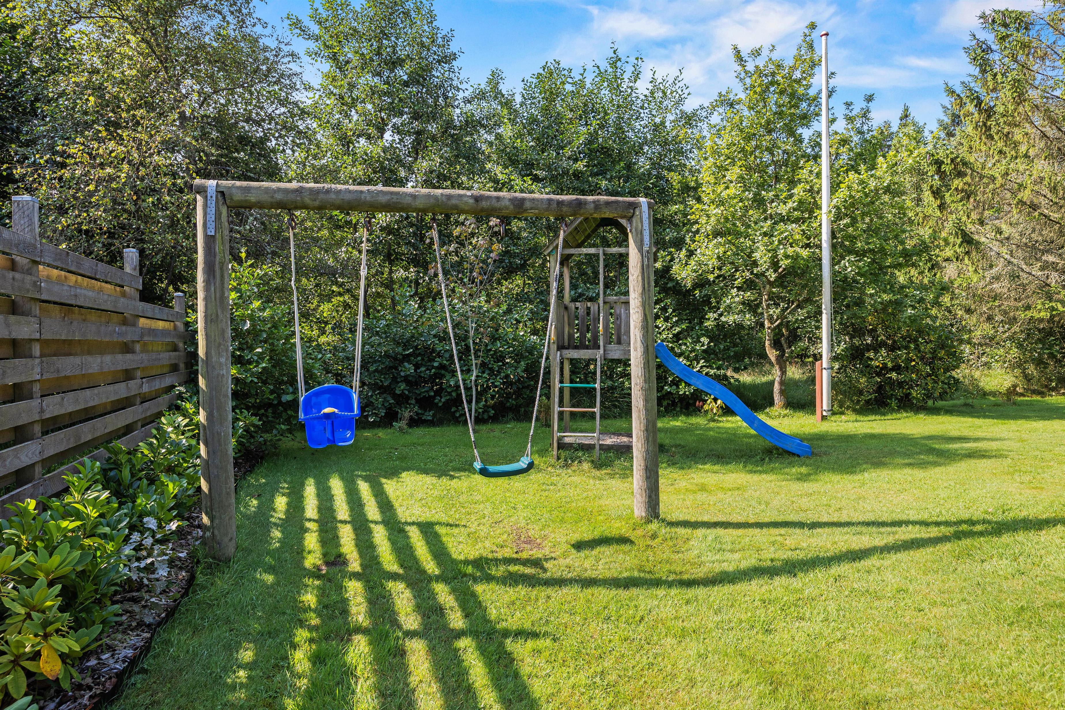 Feriehuset har en superdejlig have, hvor I virkelig kan nyde den danske sommer. Grunden er ca. 1350 m2, så her har i plads til at boltre jer med alt fra boldspil til kongespil. Her vil børnene helt sikkert elske at lege, ligesom familiens mindste kan bygge flotte sandslotte i sandkassen eller gynge. Begge dele er at finde lige overfor træterrassen, så I trygt kan lade børnene lege, mens I selv slapper af på terrassen