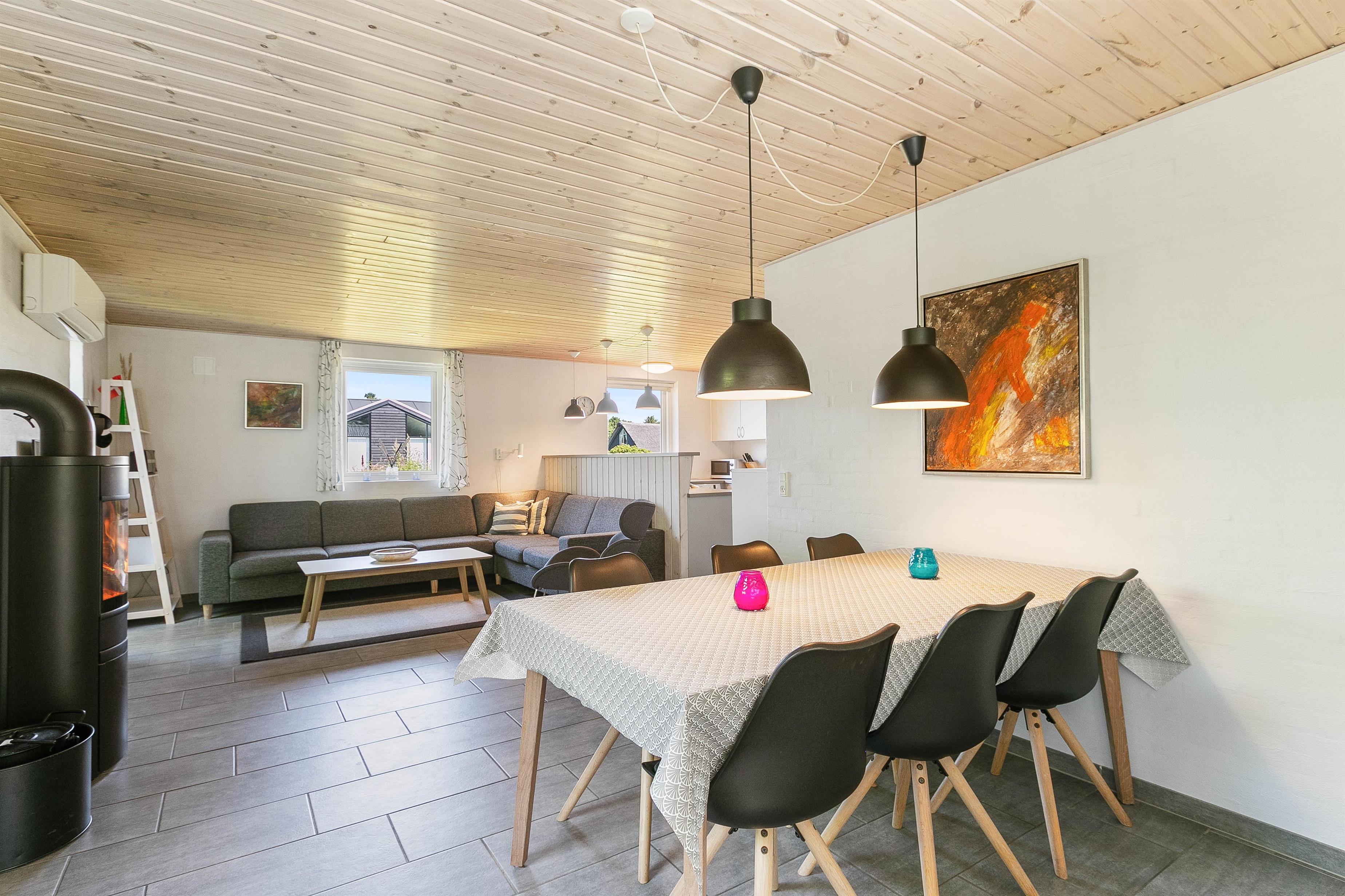Ikke blot er sommerhuset udstyret med en brændeovn, der skaber en varm og hyggelig stemning, men også en luft til luft varmepumpe samt gulvvarme på badeværelset sørger for behagelig indendørs temperatur året rundt.