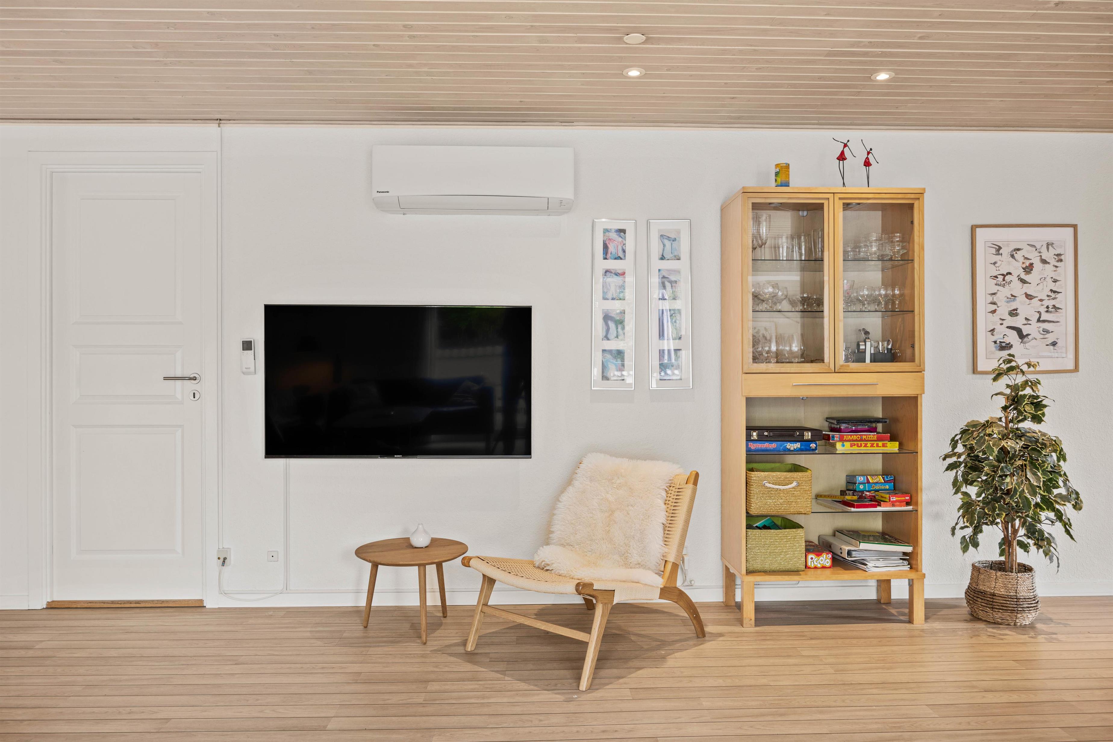 I stuen er der mulighed for at nyde en god film: slå benene op, medbring popcorn og komme helt væk fra den travle hverdag, imens brændeovnen knitrer livligt i baggrunden.