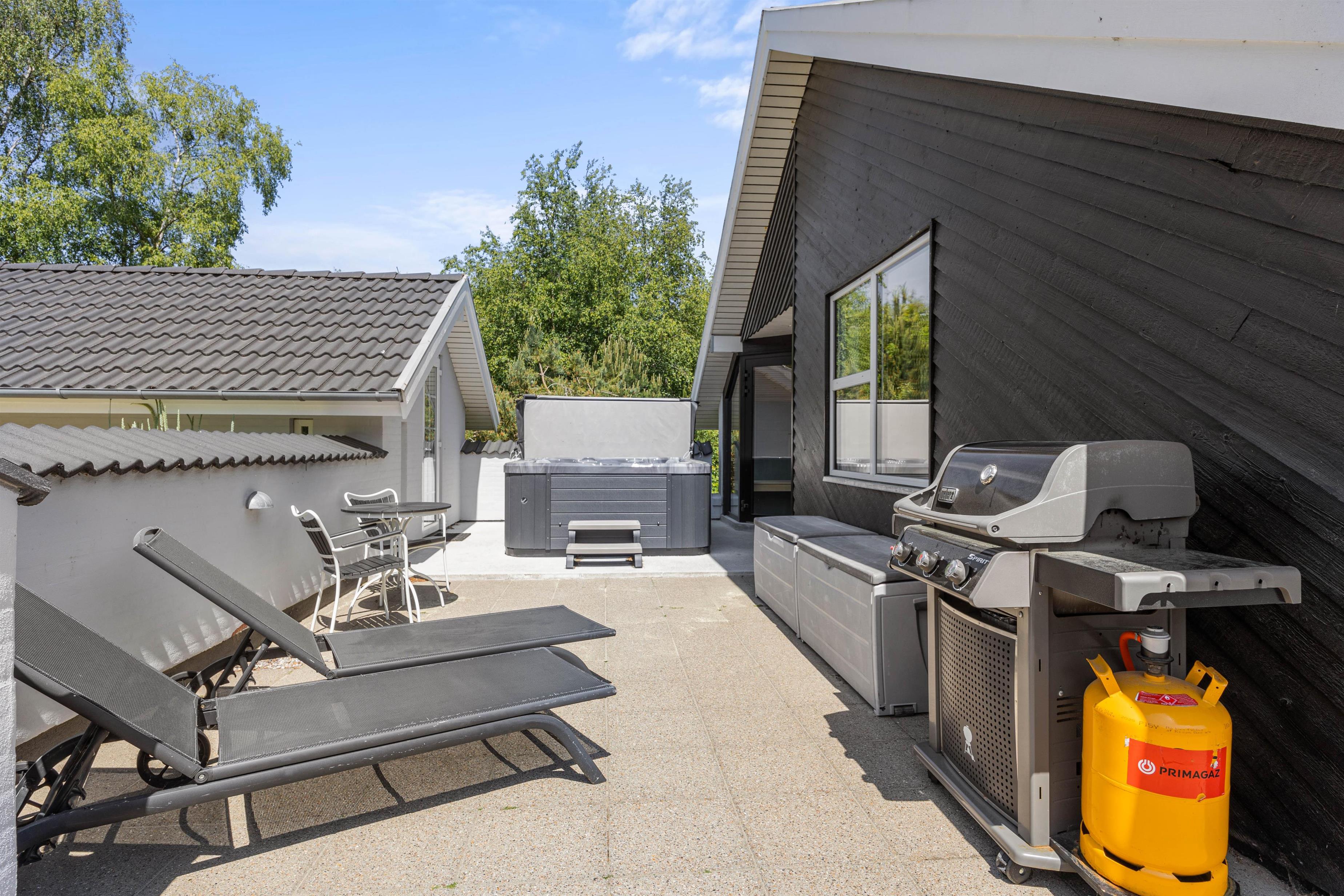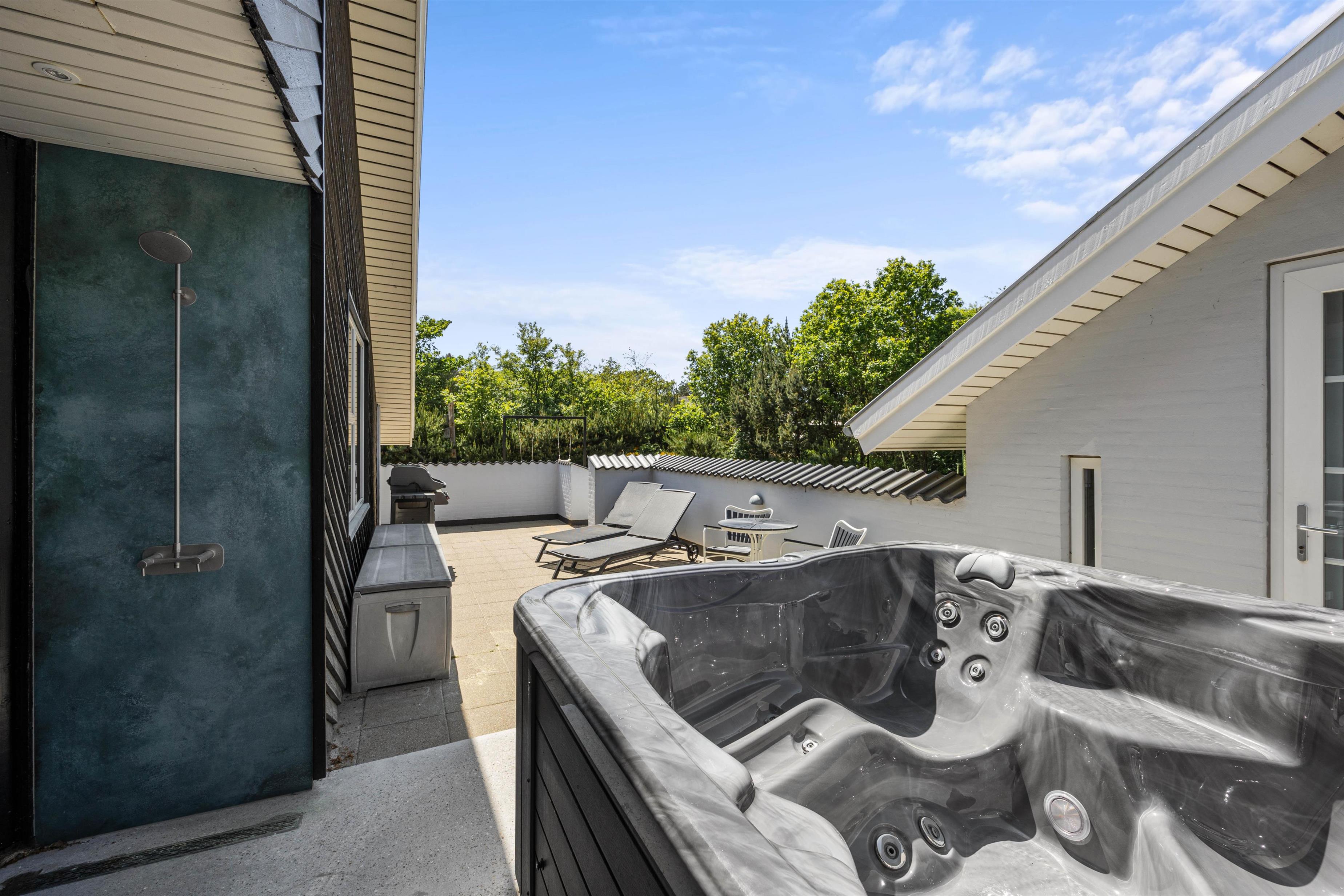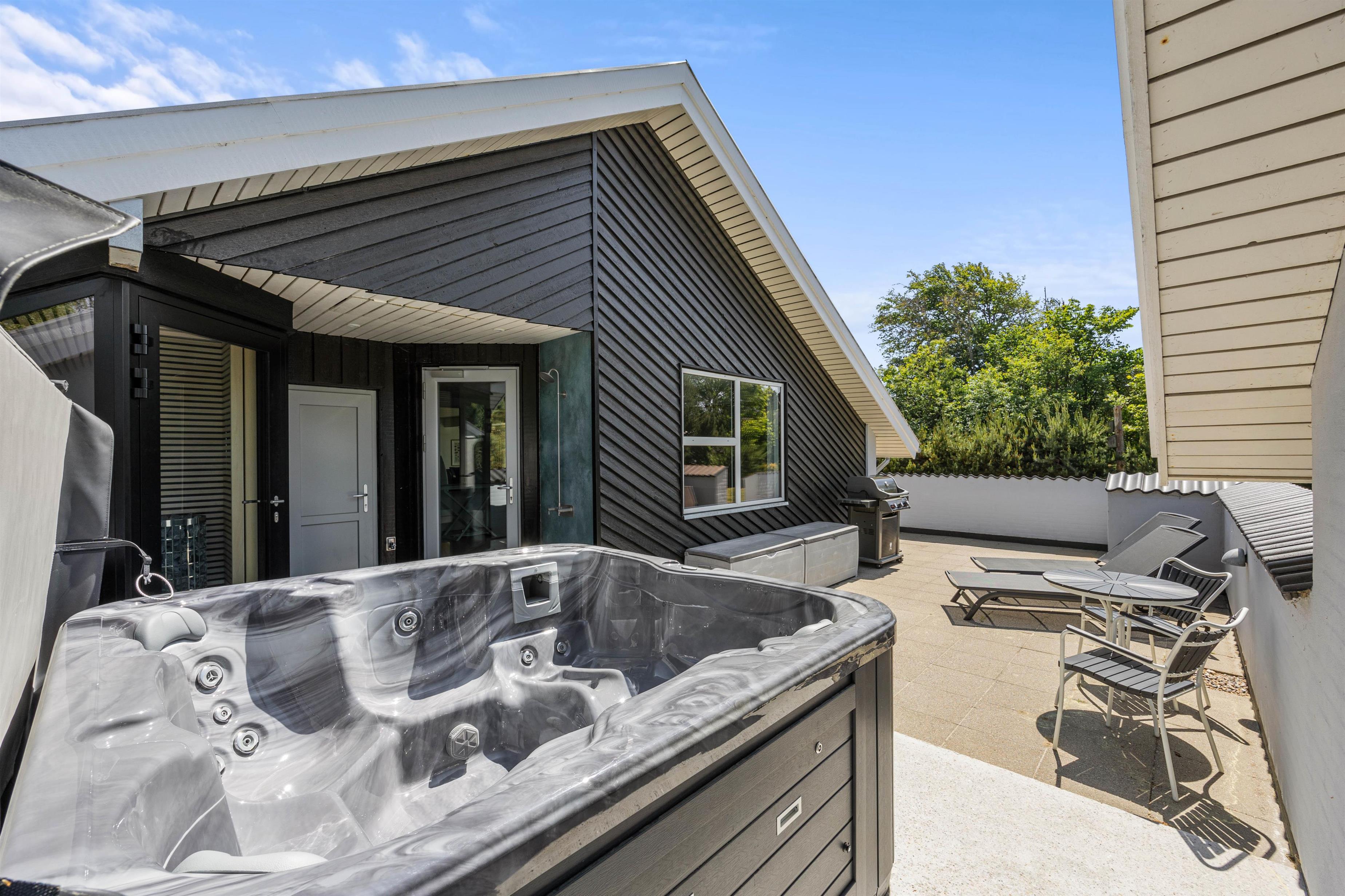 Og skulle I trænge til endnu mere wellnes, står sommerhusets dejlige udespa (til 5 personer), udesauna og udebruser til jeres rådighed på den ene af sommerhusets mange hyggelige terrasser.