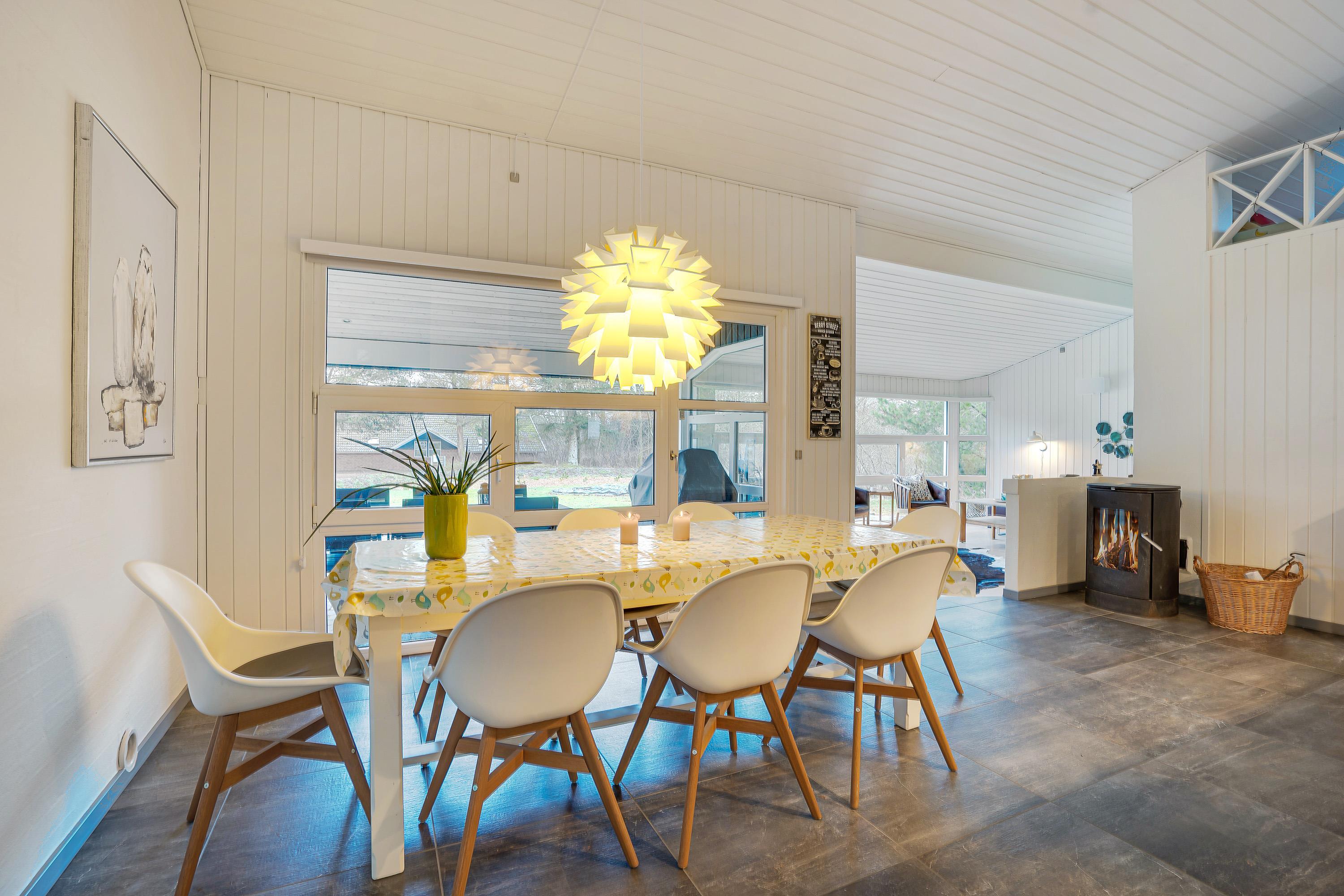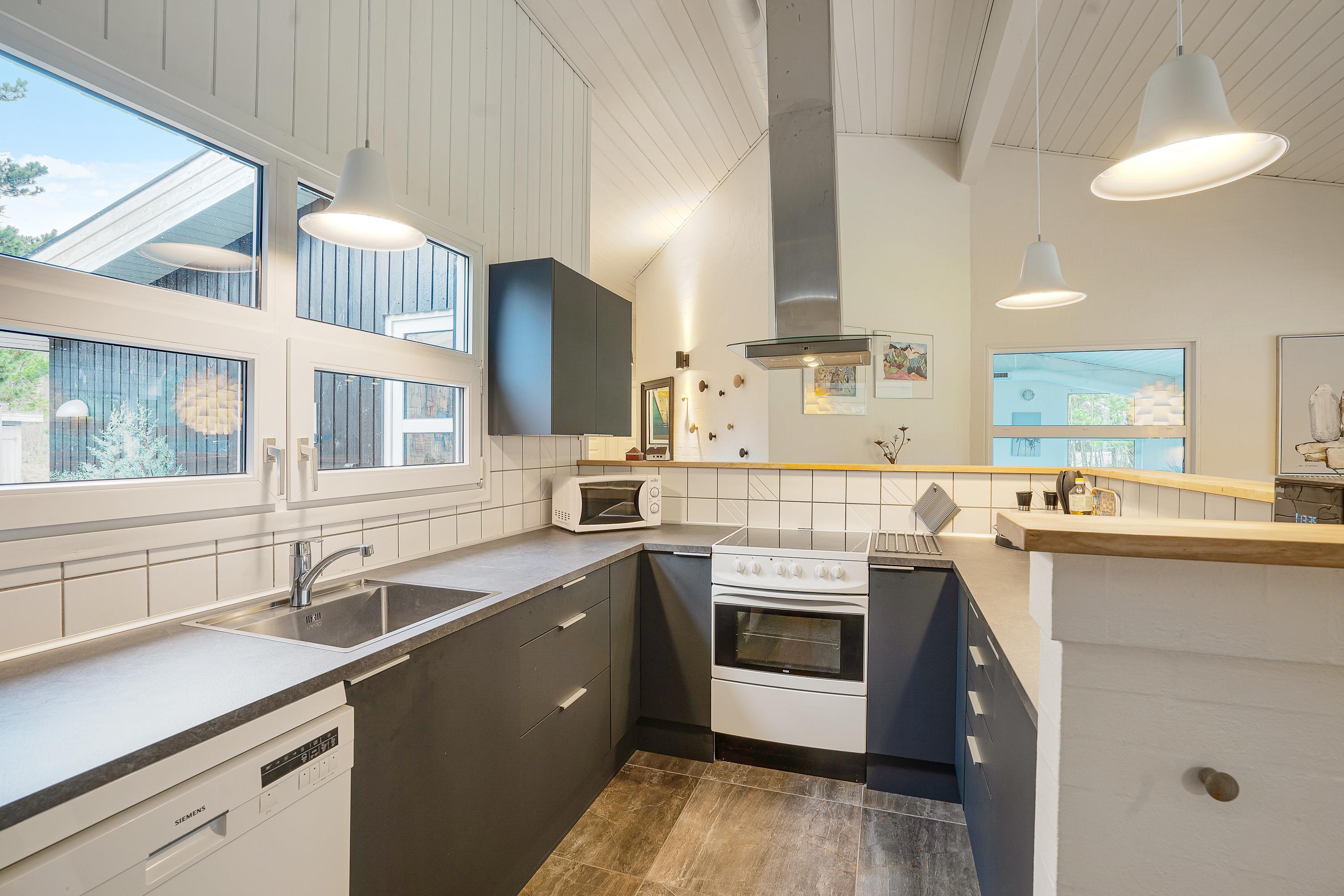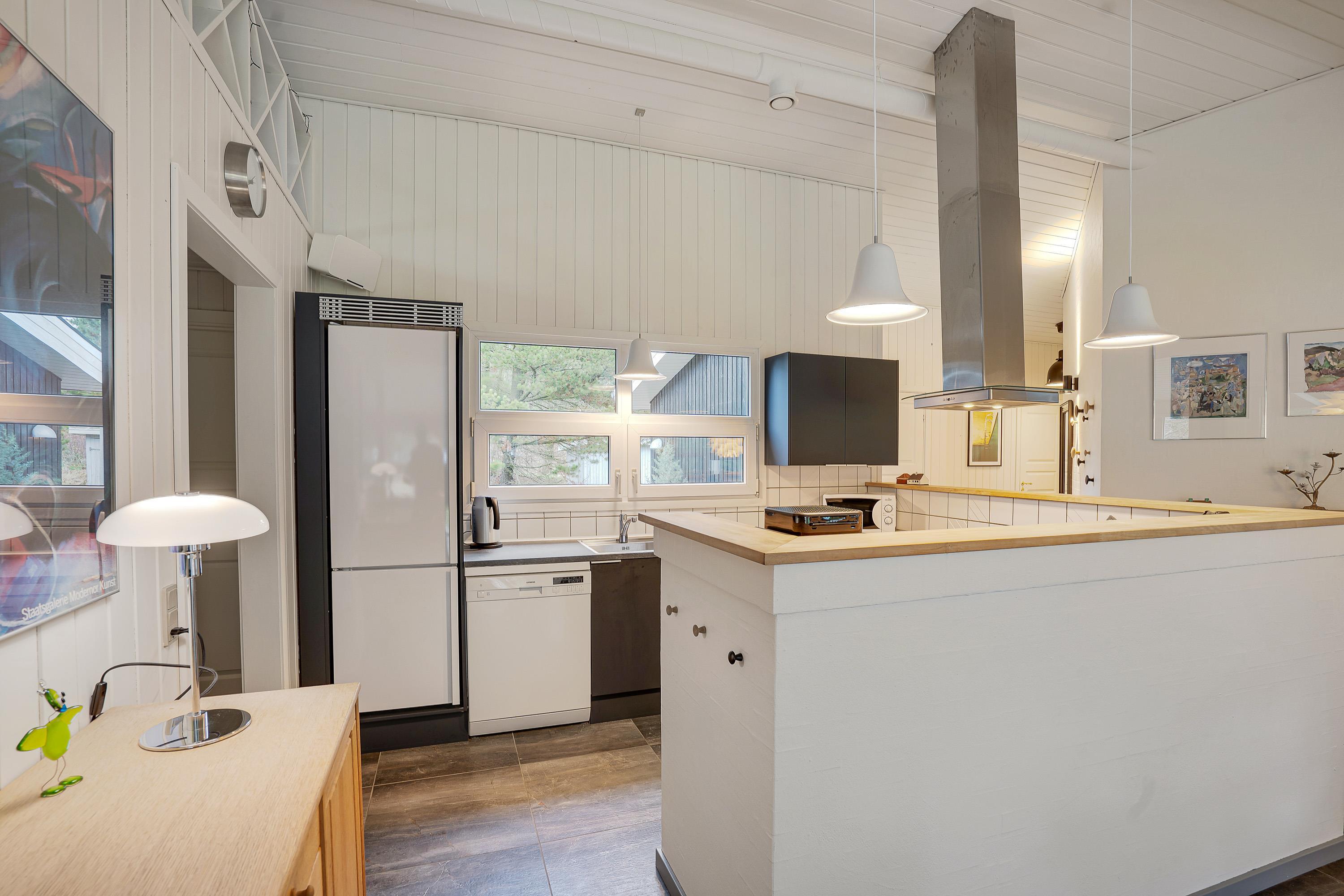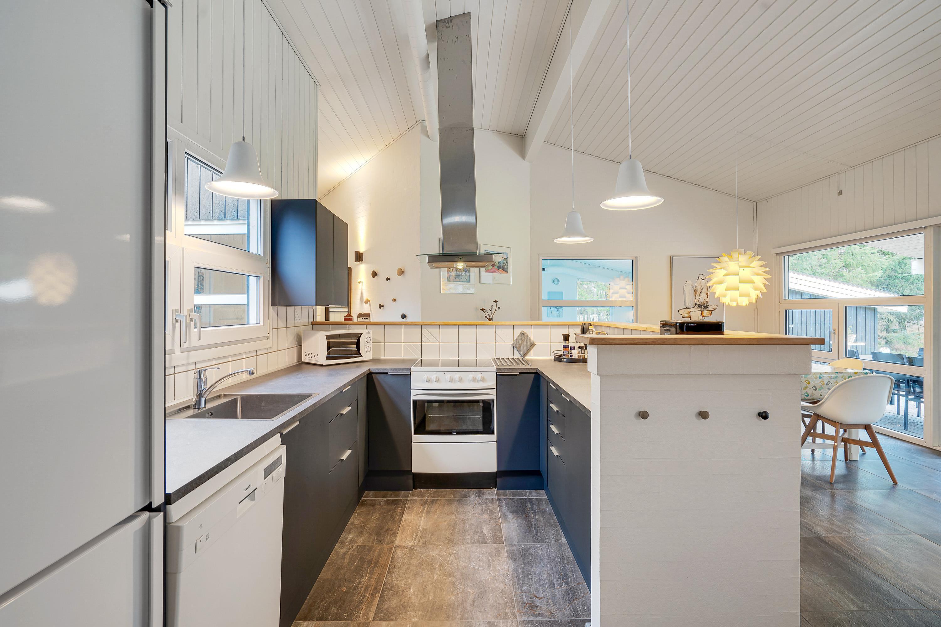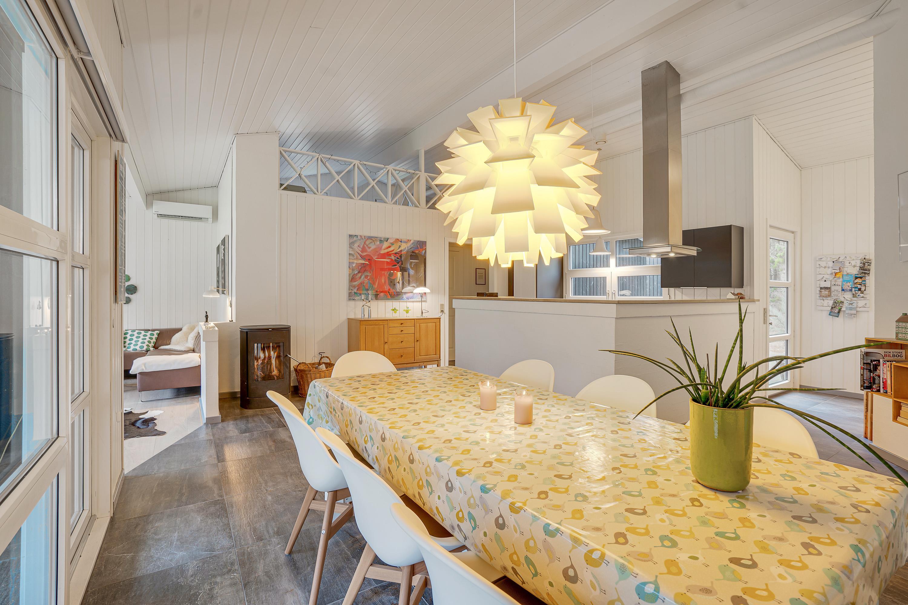 Den velindrettede og lyse stue med åbent køkken er husets midtpunkt, og her er der god plads til afslapning og hygge for alle feriegæster. Det veludstyrede og tidssvarende køkken har alt, hvad feriekokken behøver, og her kan I samles om at tilberede en masse lækre måltider både morgen, middag og aften. På de kolde dage vil brændeovnen stå for hyggen og give jer lidt ekstra varme. Der er gulvvarme i køkkenafdeling med fliser.