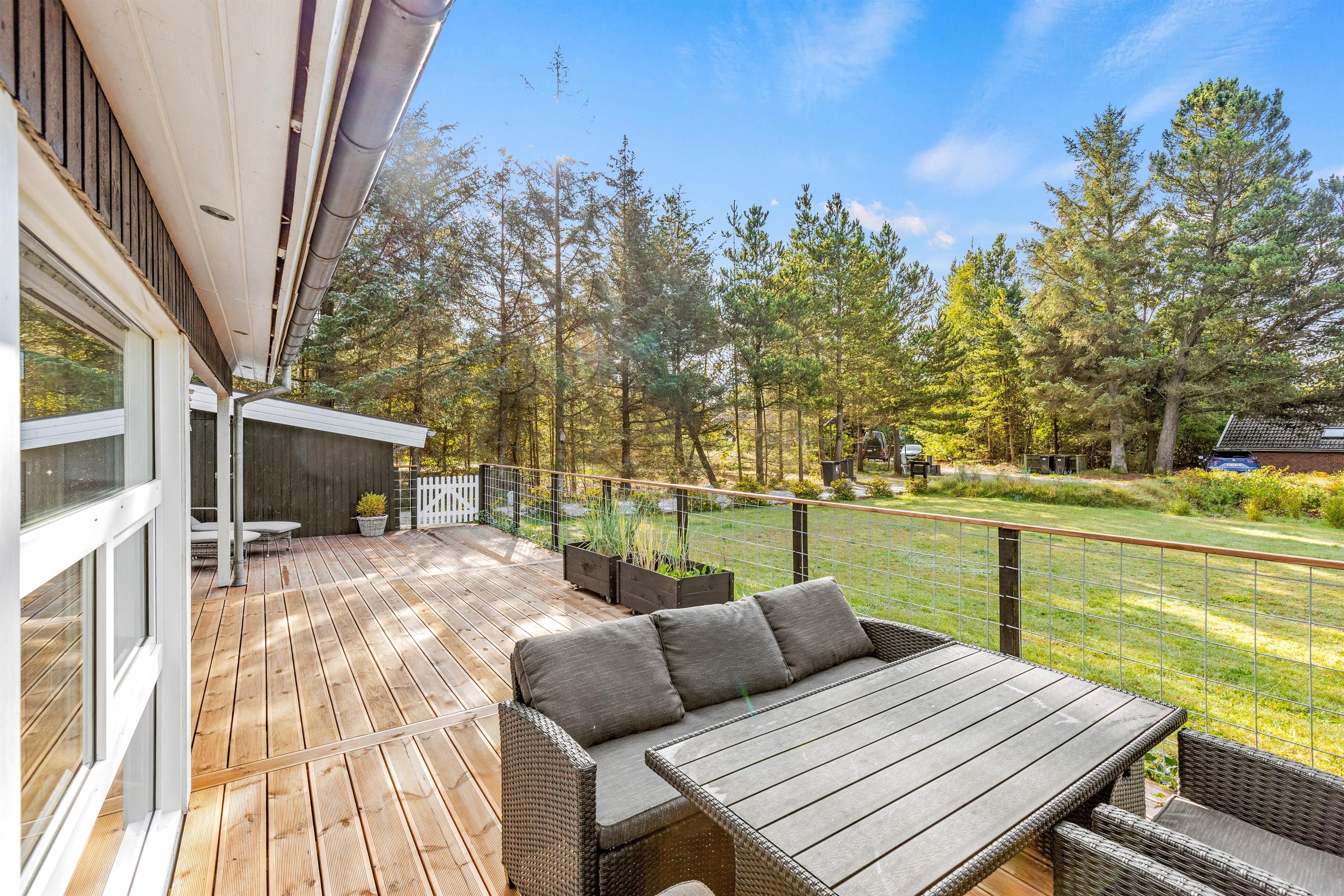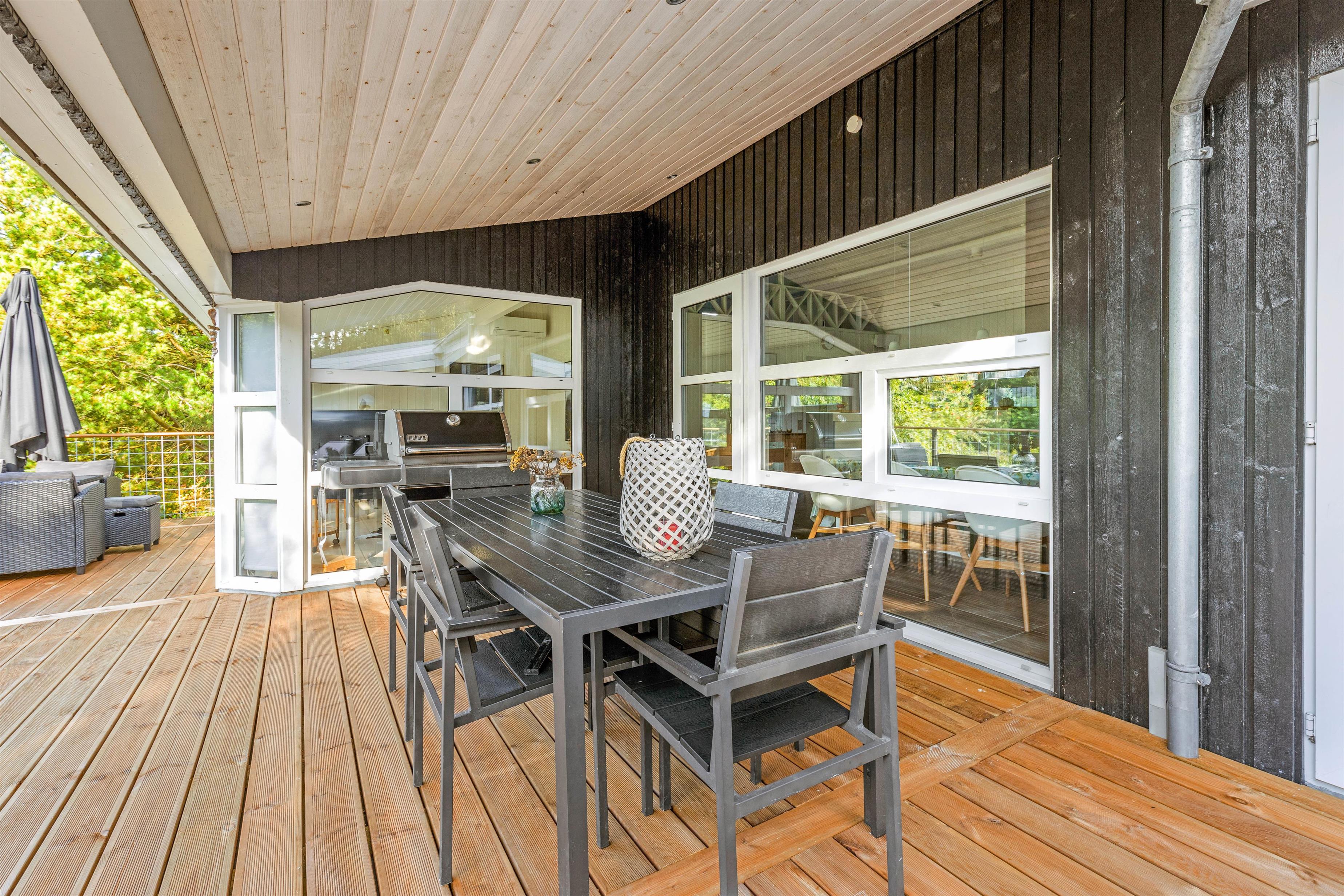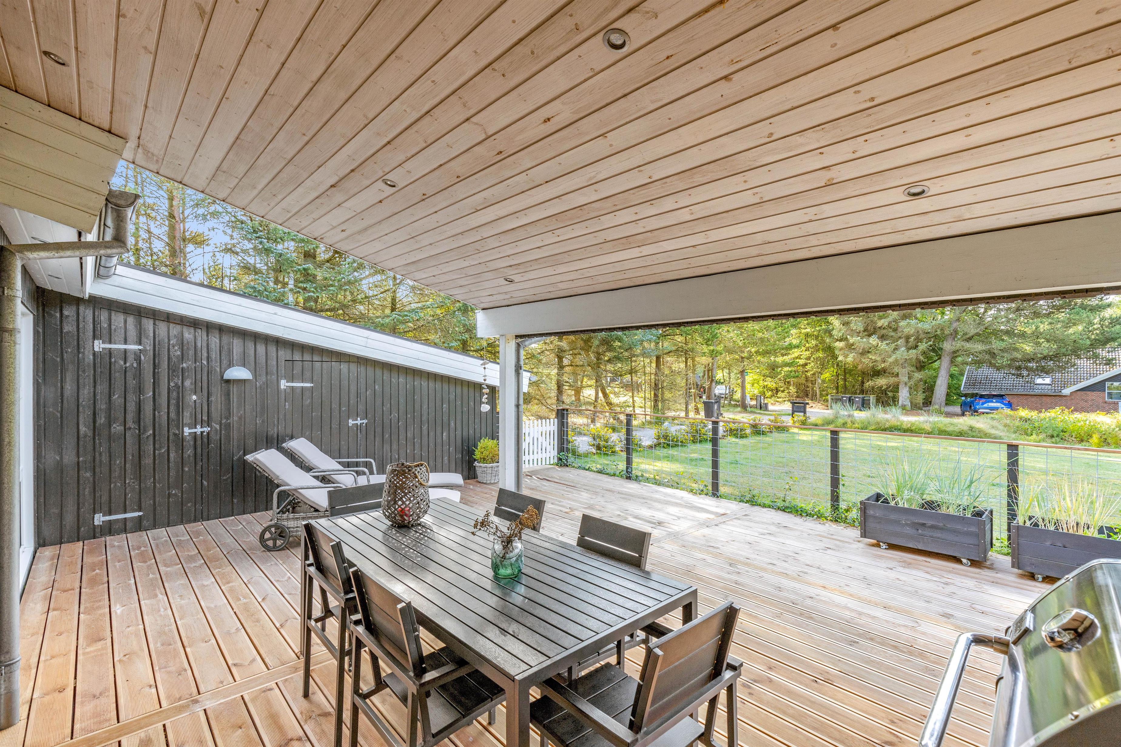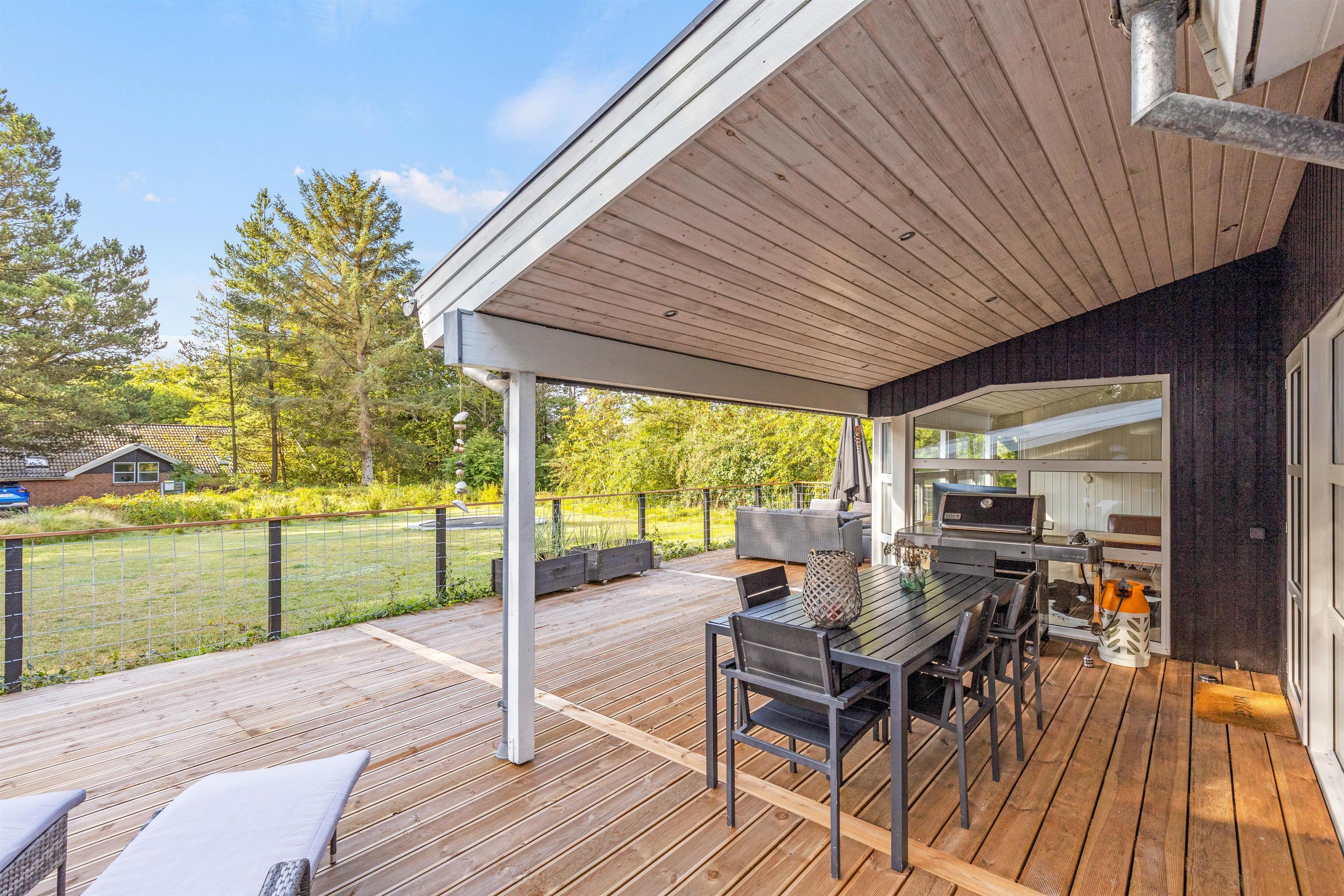 På den delvist overdækkede terrasse kan I slappe af i al slags vejr. Her kan I sammen grille eller spise en god morgenmad i solen, mens fuglene synger i trætoppene.