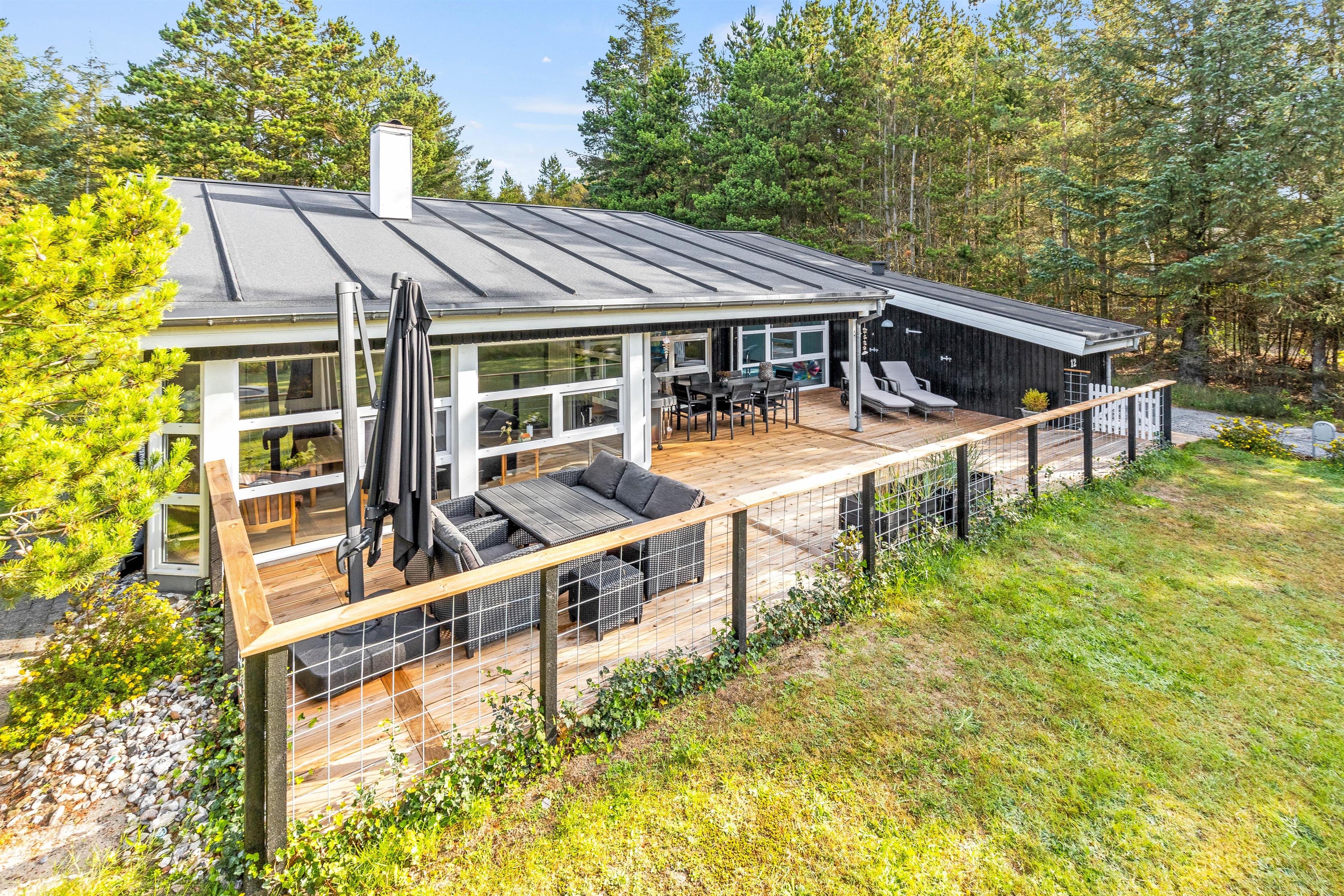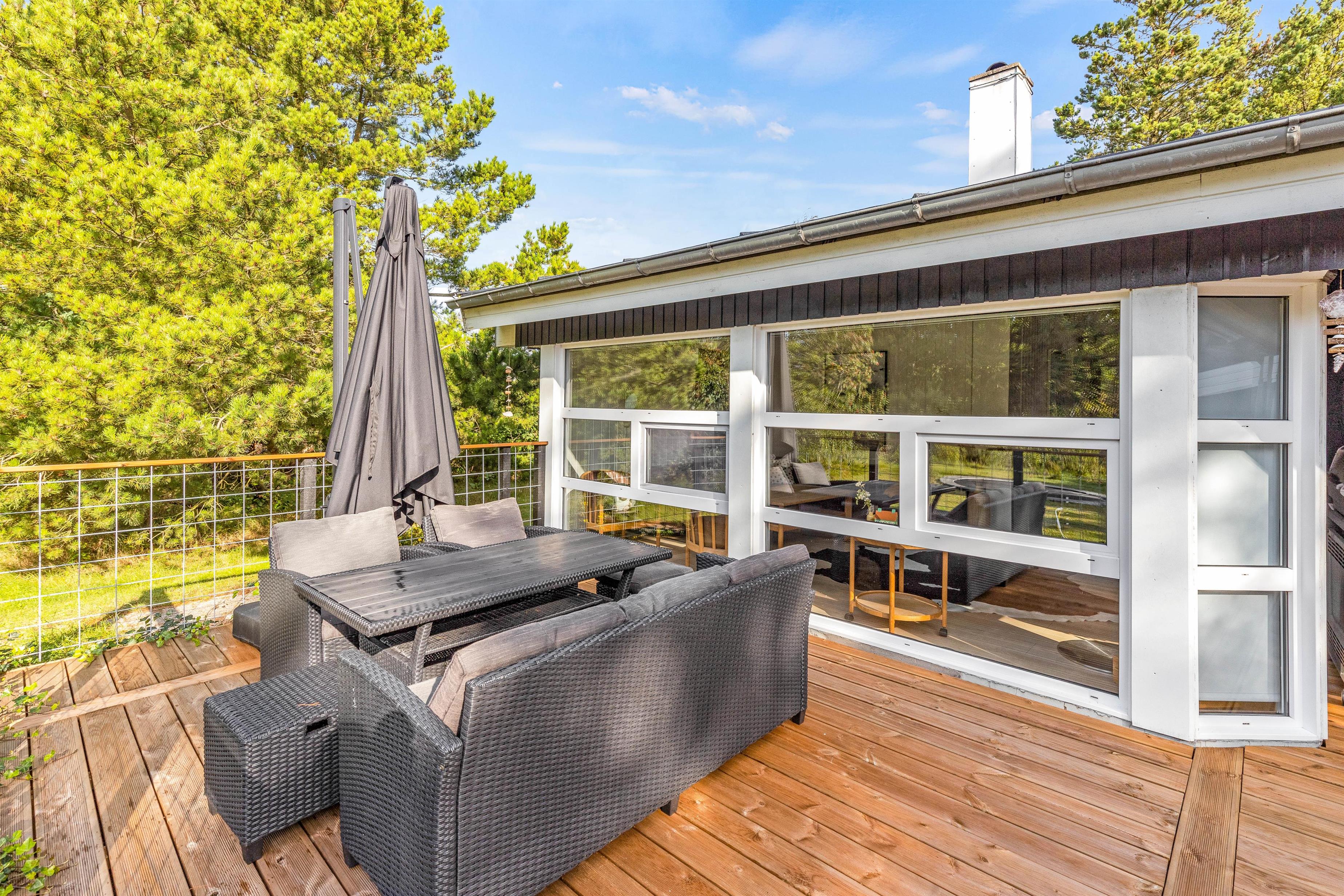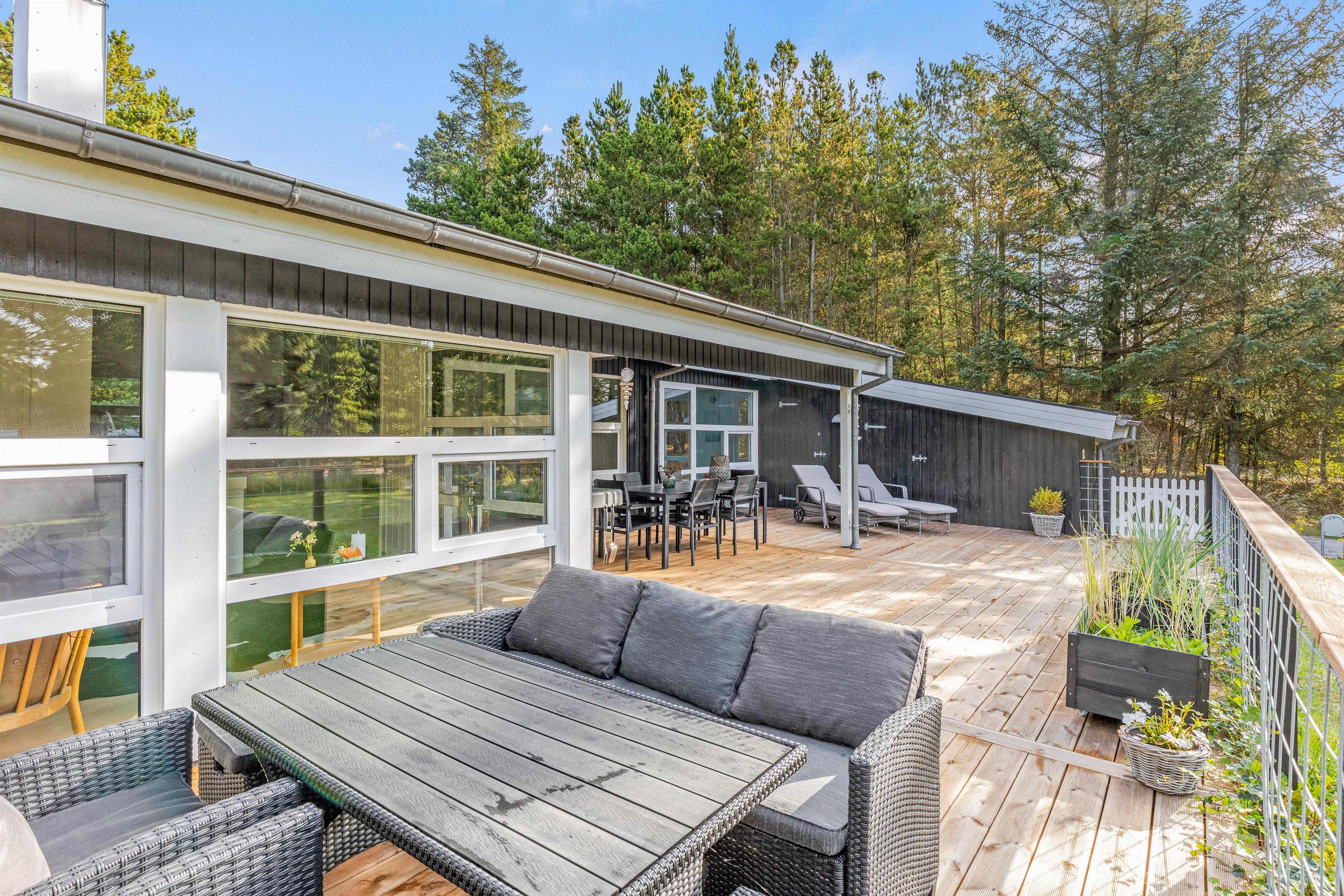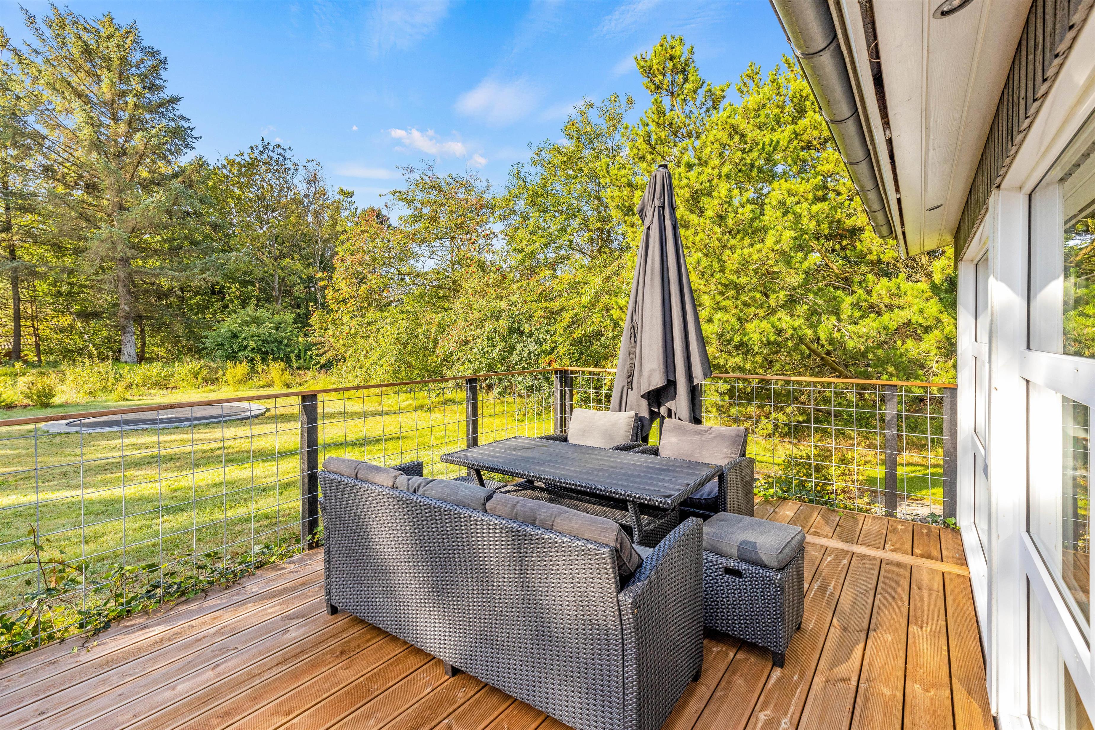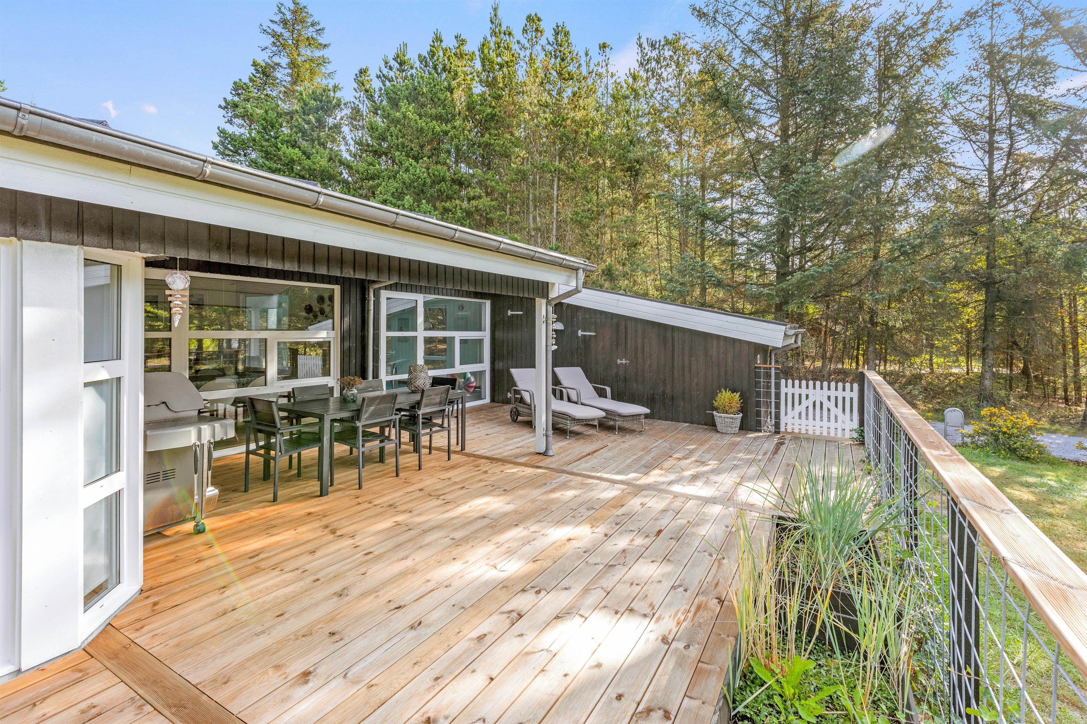 På den delvist overdækkede terrasse kan I slappe af i al slags vejr. Her kan I sammen grille eller spise en god morgenmad i solen, mens fuglene synger i trætoppene.