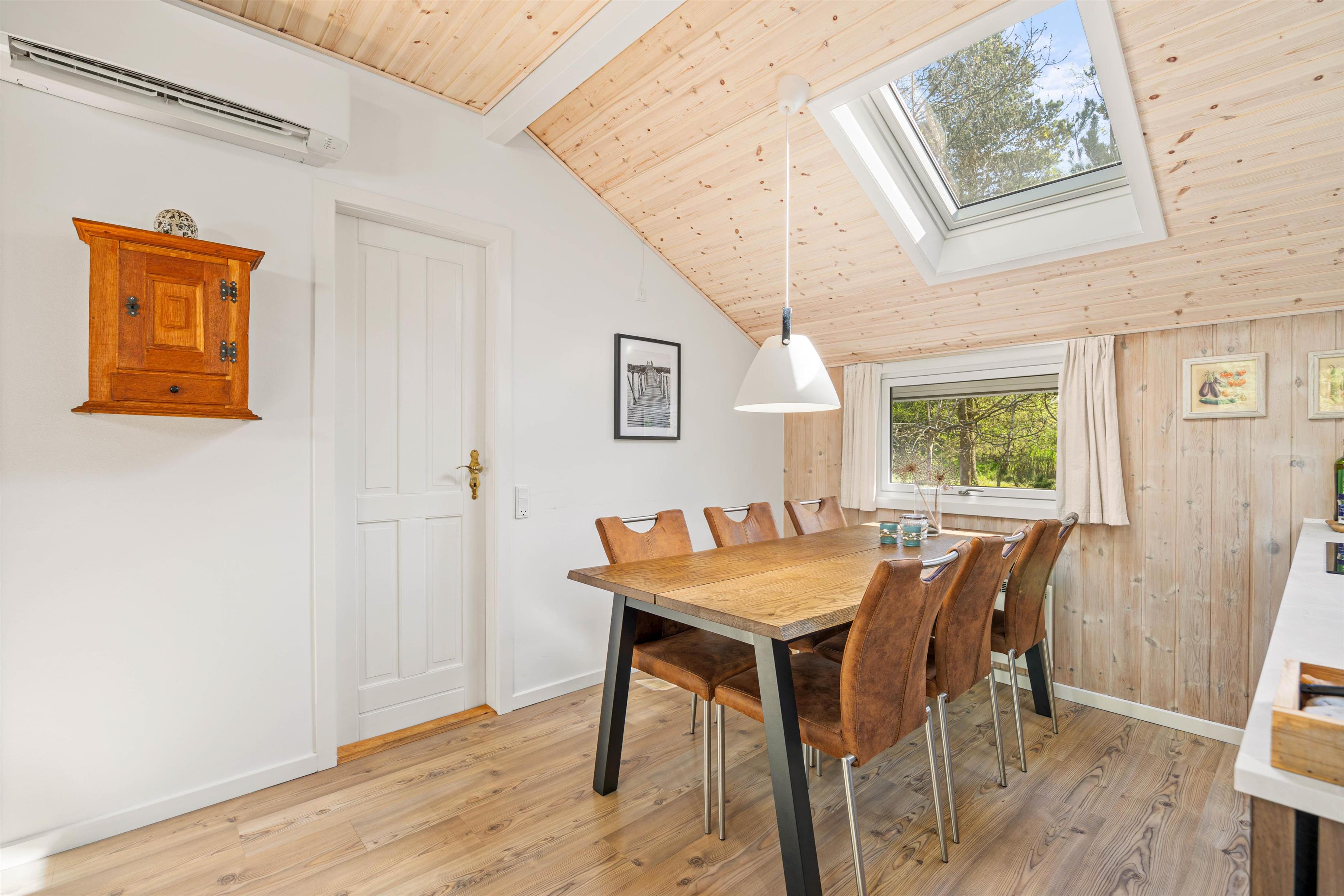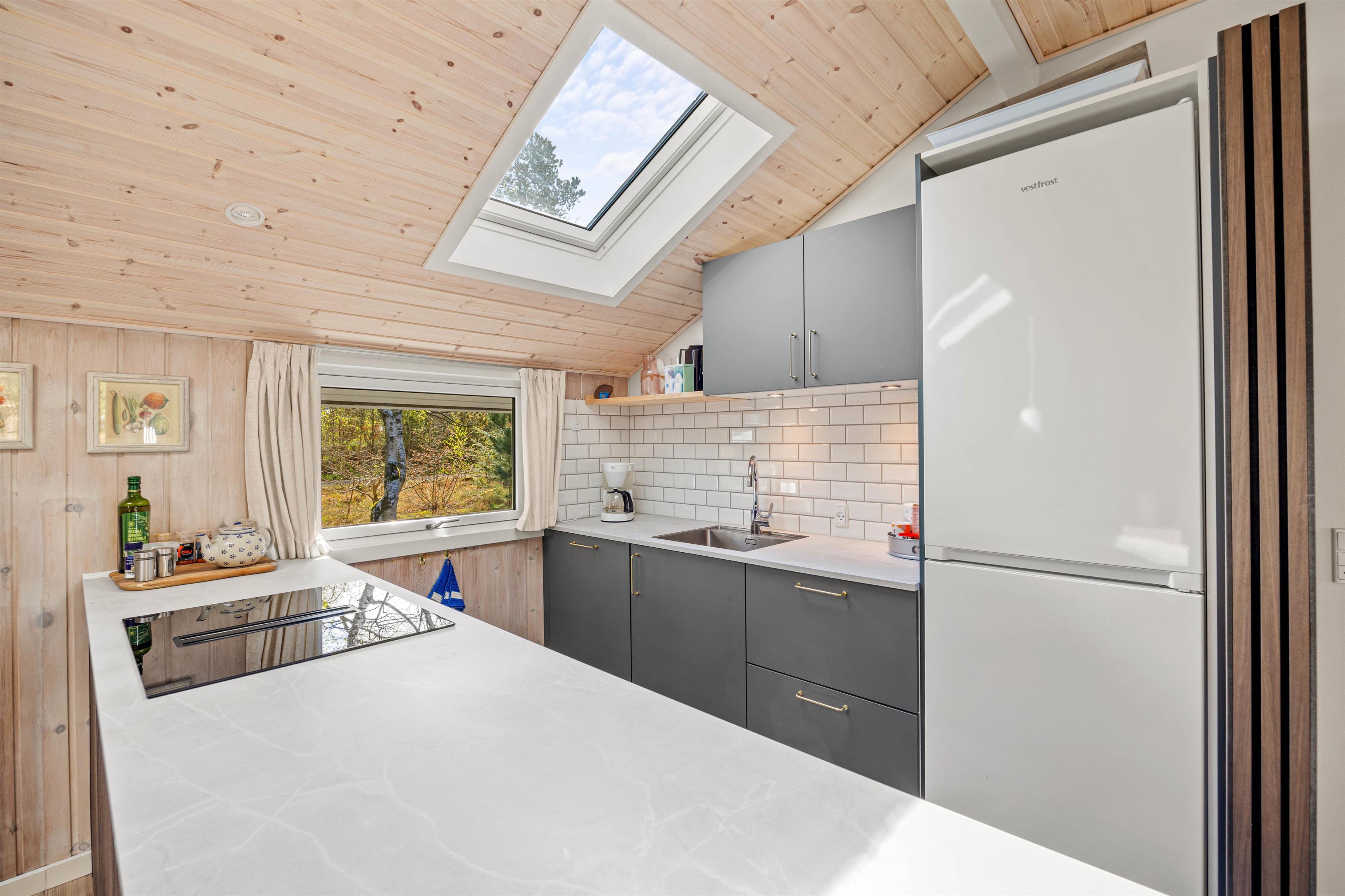 Midtpunktet i dette hus er køkken-alrummmet med stuen. Hele huset er gennemført smukt indrettet, så man virkeligt kan føle sig godt tilpas. Køkkenet er godt udstyret, så man her nemt kan trylle lækker mad til sig selv og familien, som så kan nydes ved det smarte ovale spisebord, der naturligvis også egner sig til lange spilleaftener. På kølige aftener kan I tænde op i brændeovnen og nyde den hyggelige stemning, imens I gennem de store panoramavinduer kan observere grundens dyreliv.