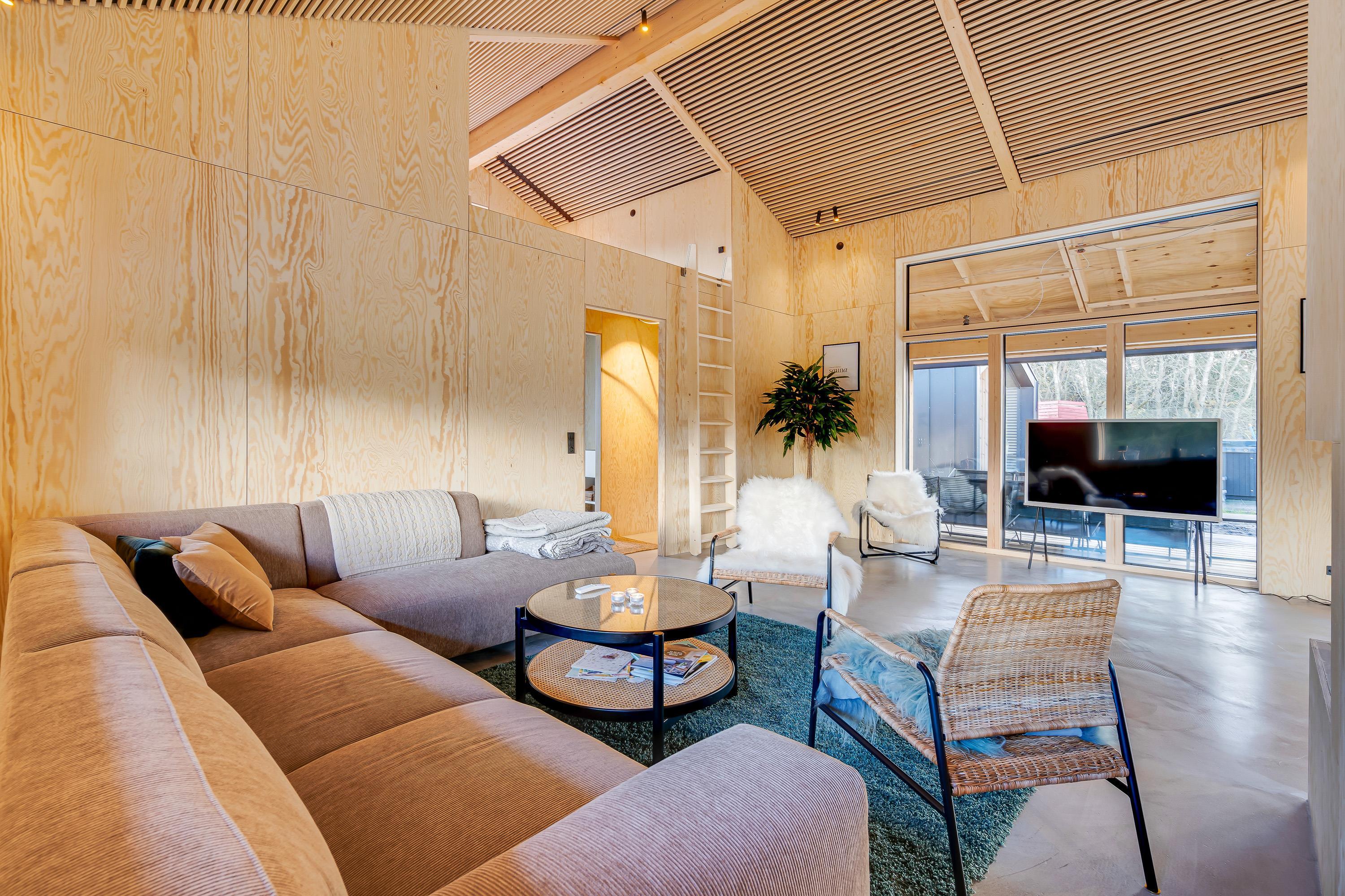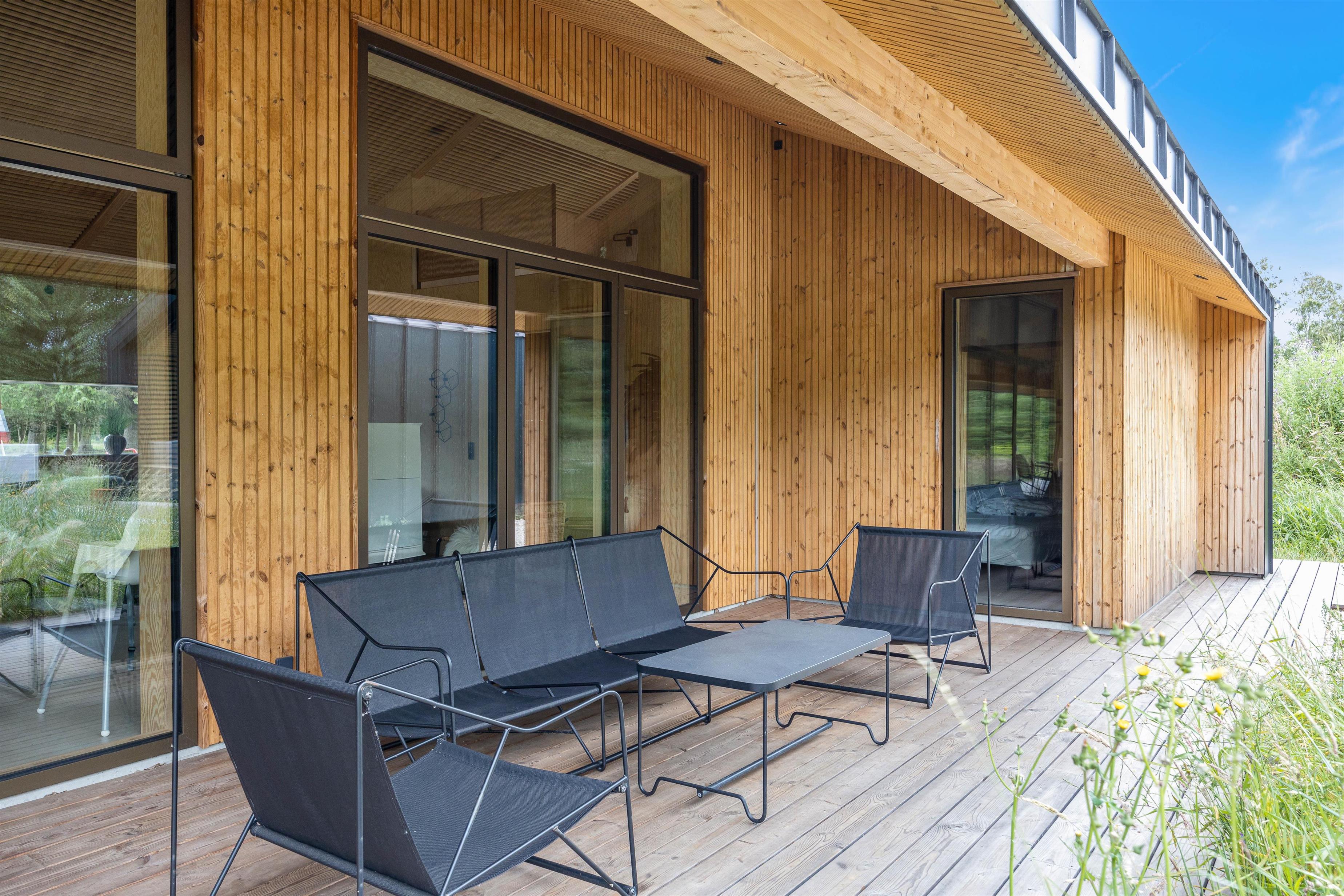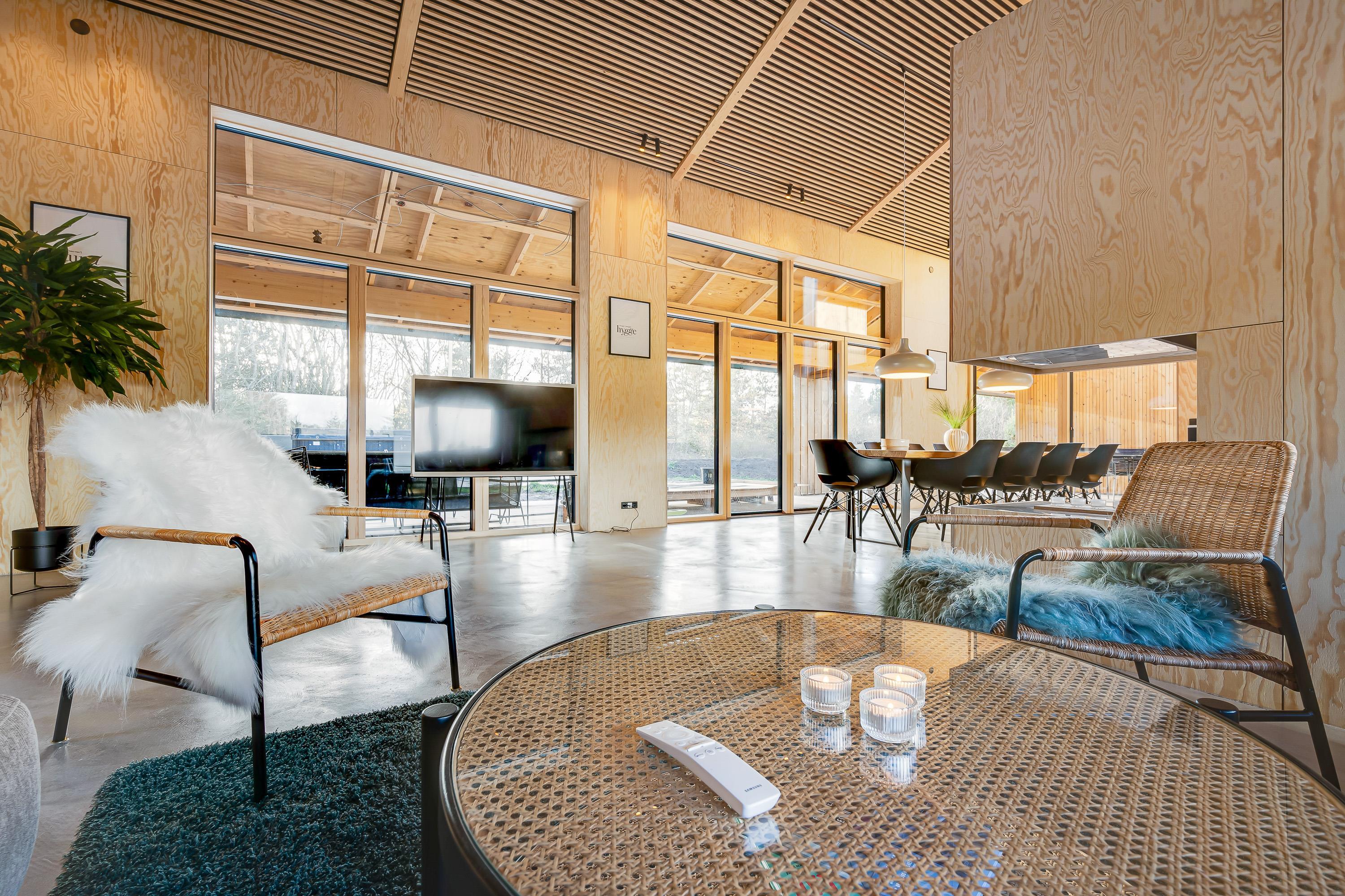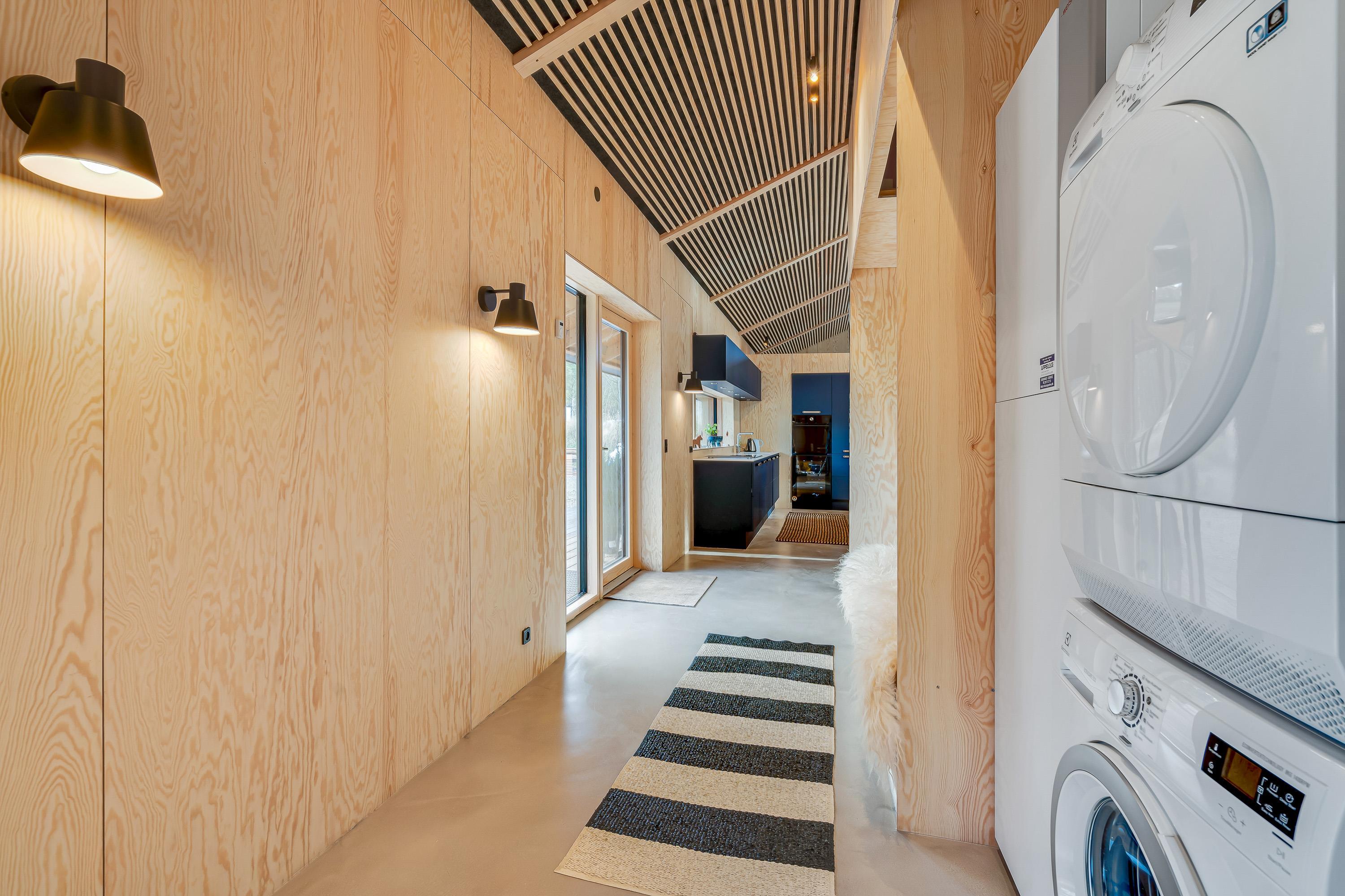 Sommerhuset er indrettet med komfortable og moderne møbler. Desuden er der også gode praktiske faciliteter – vaskemaskine, opvaskemaskine og tørretumbler i sommerhuset, som letter husarbejdet for jer på ferien.