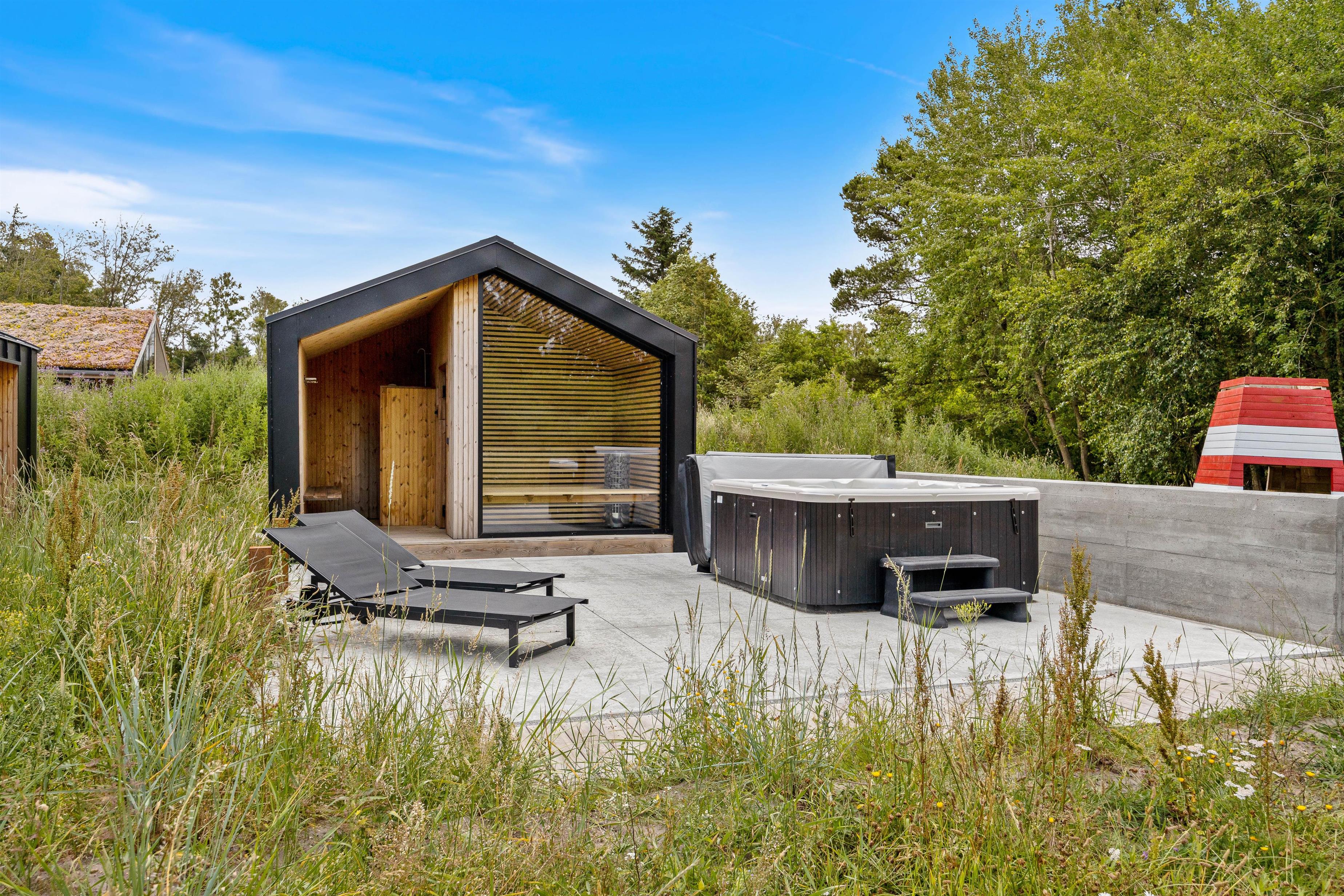 Når I holder ferie i sommerhuset på Strandgodsvej 17, vil der være masser af afslapning på programmet. Udenfor finder I en sauna (både infrarød og alm. saunaovn), hvor I kan sætte jer til rette i den dejlige varme og slappe fuldstændig af. Der er også flere lækre wellnessfaciliteter. Her står der nemlig også en udespa og en udebruser klar til jer, så her er der rig mulighed for skønne, afslappende stunder. Udebruseren er desuden oplagt at blive skyllet under efter en tur ved stranden.