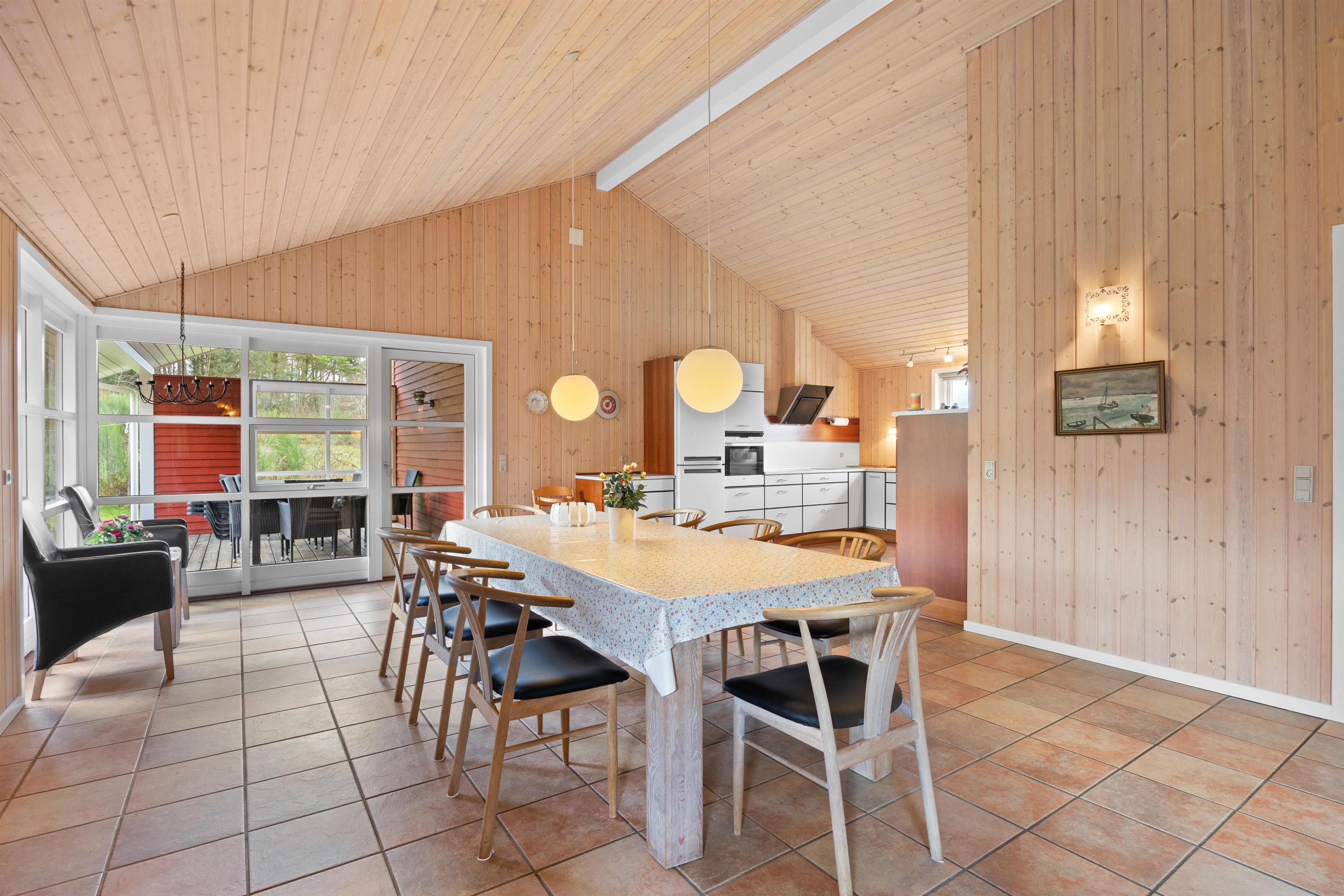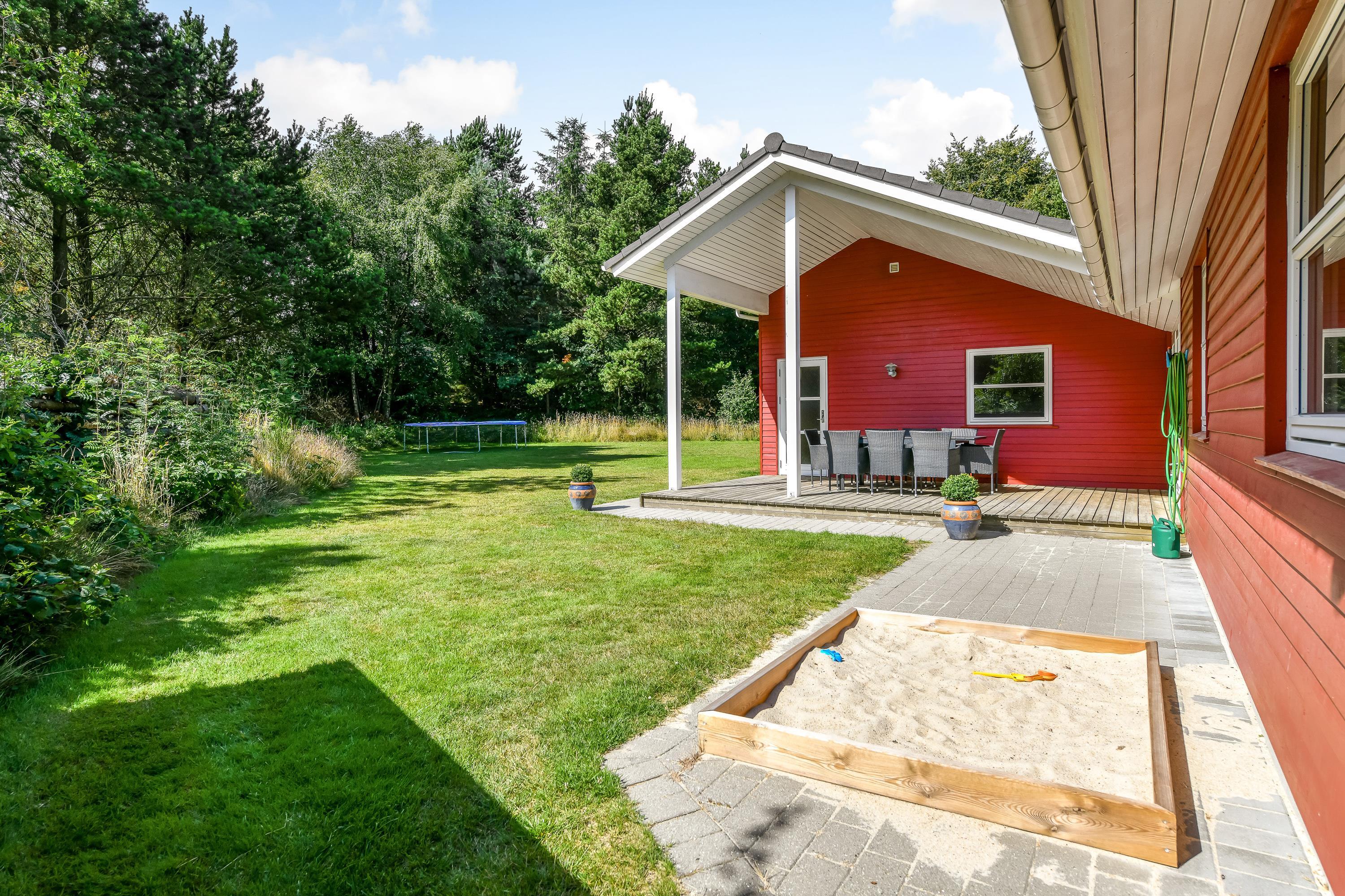 Fra stuen er der direkte adgang til den delvist overdækkede terrasse. Nyd de varme solskinsdage fra liggestolene, mens børnene og hunden leger på græsplænen eller hopper på trampolin. Til de mindste feriegæster er der tilmed sørget for en sandkasse.