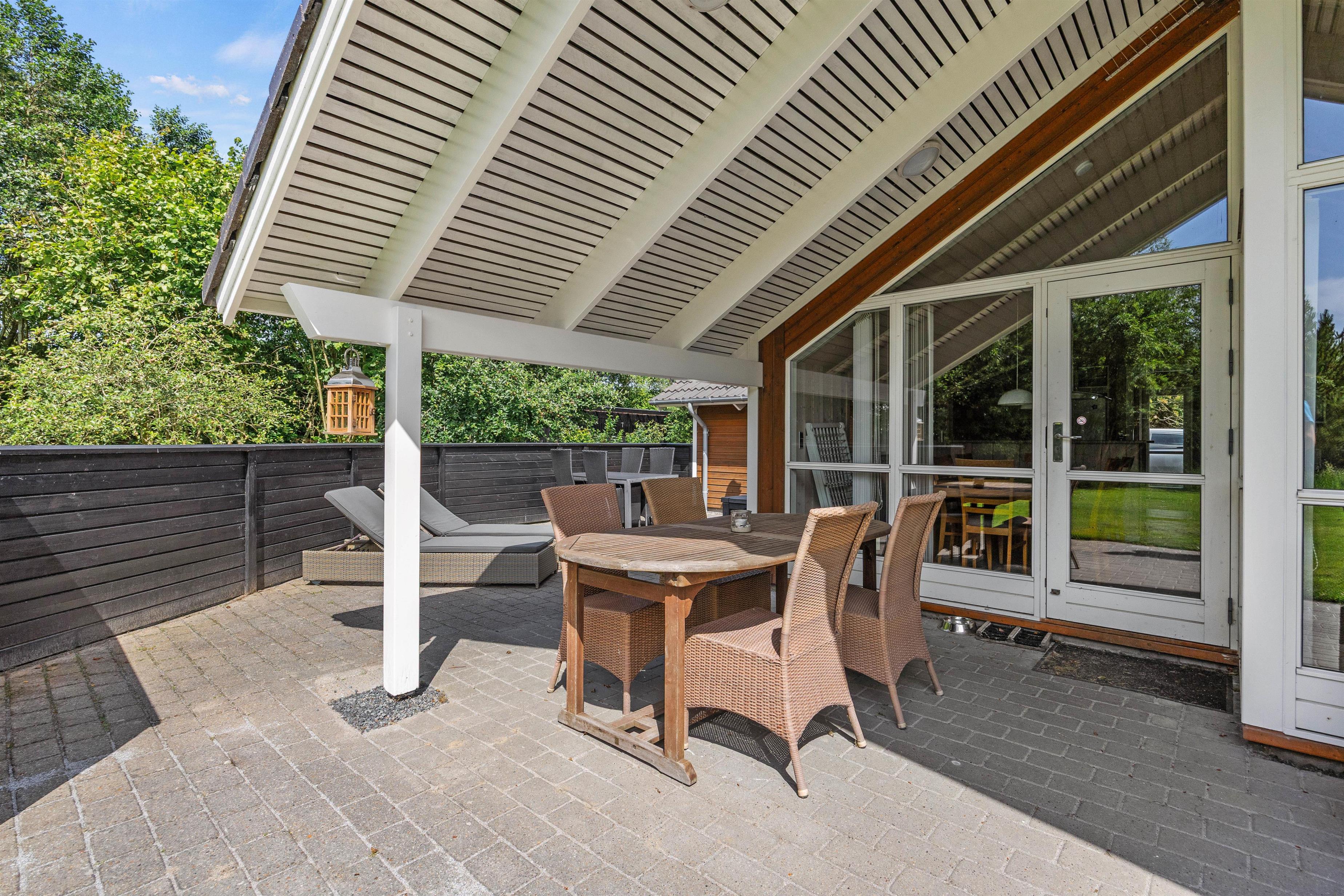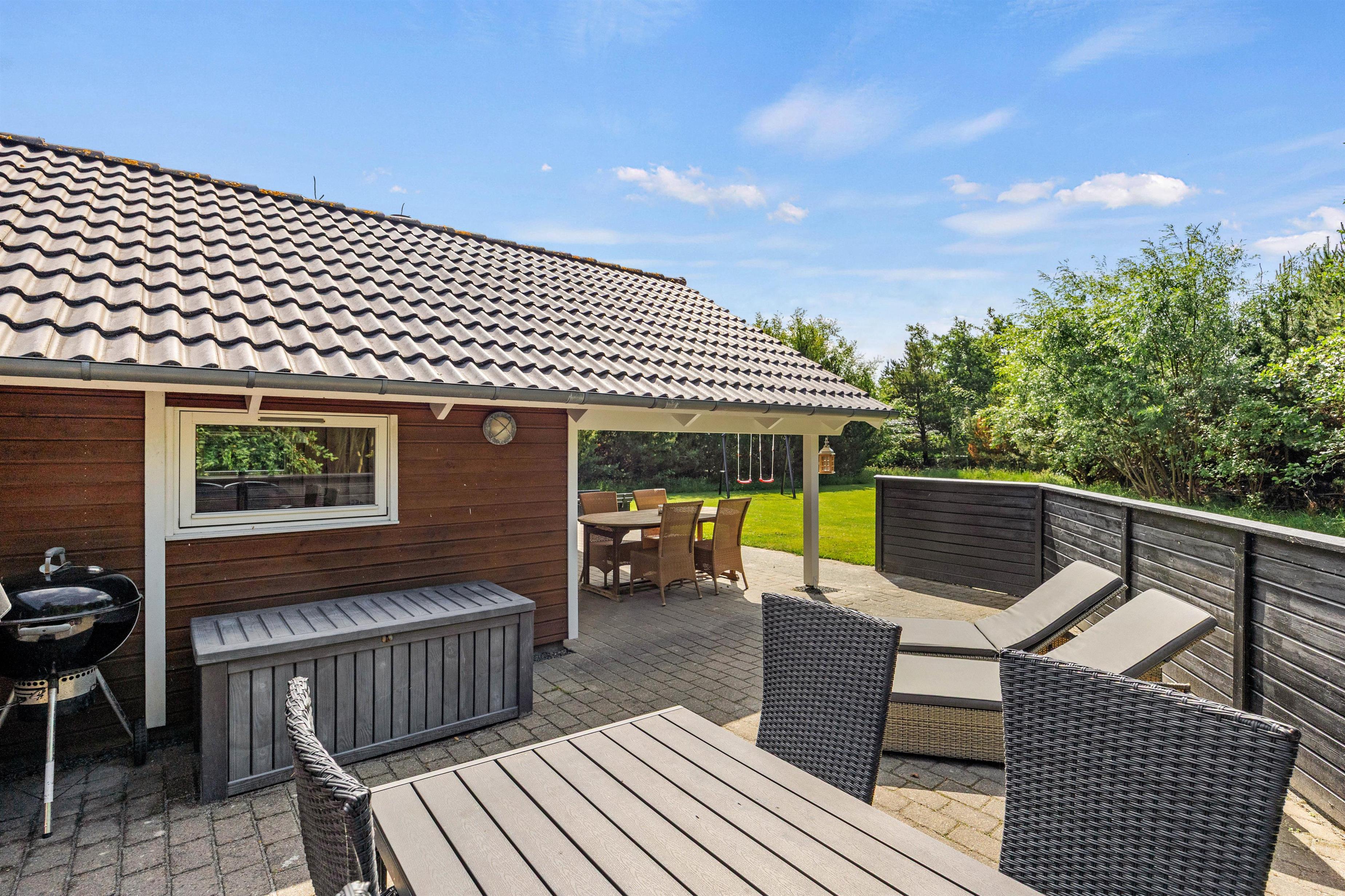 Den dejlige grund med den delvist overdækkede terrasse, gode havemøbler og god læ er et sandt paradis. Her kan I nyde de varme solskinsdage fra liggestolene og betragte børnene, mens de leger på græsplænen. Sandkassen og gyngestativet gør fuldender feriepakken, og de mange træer, der omgiver grunden, giver jer god ro og fred.