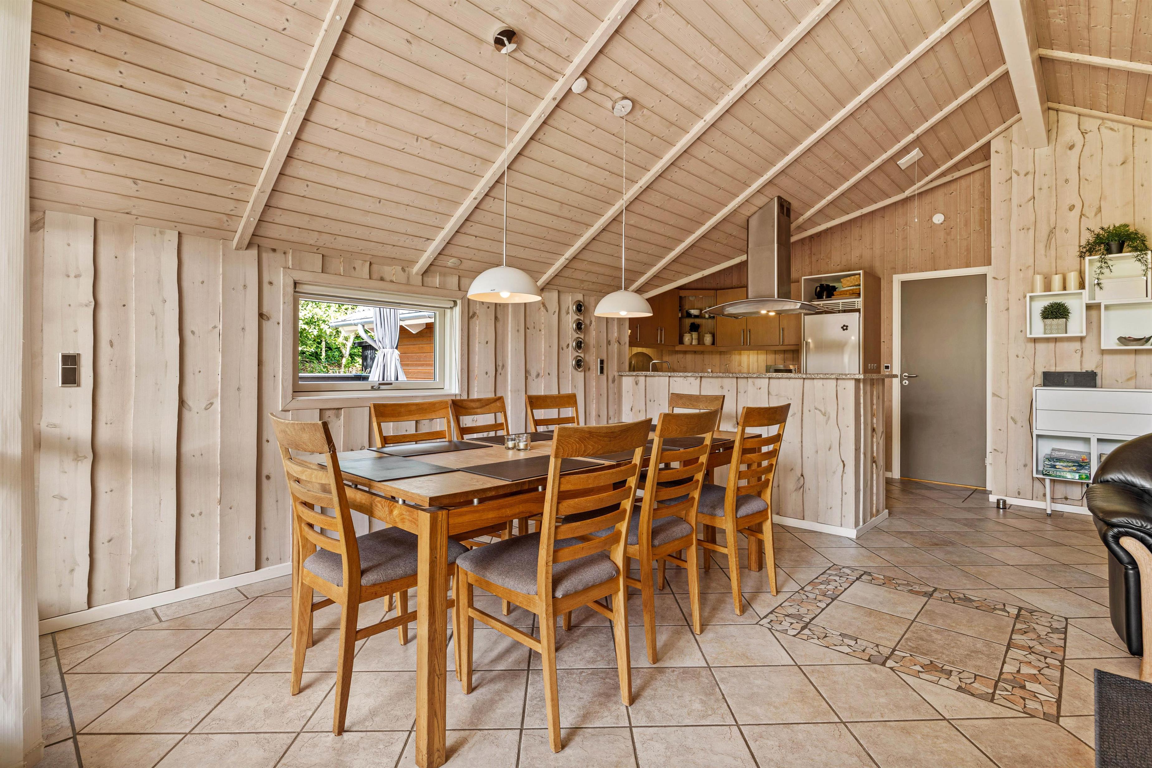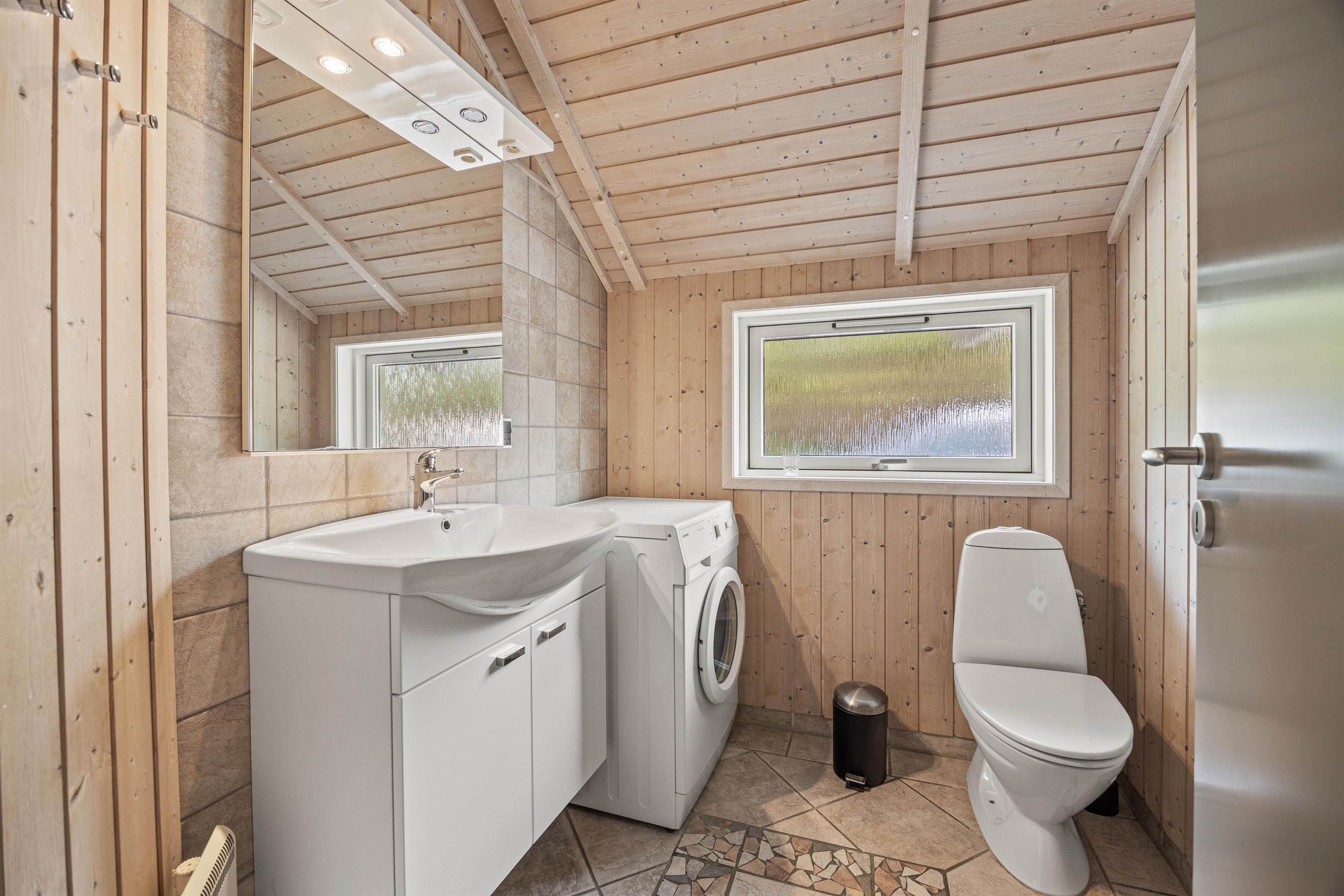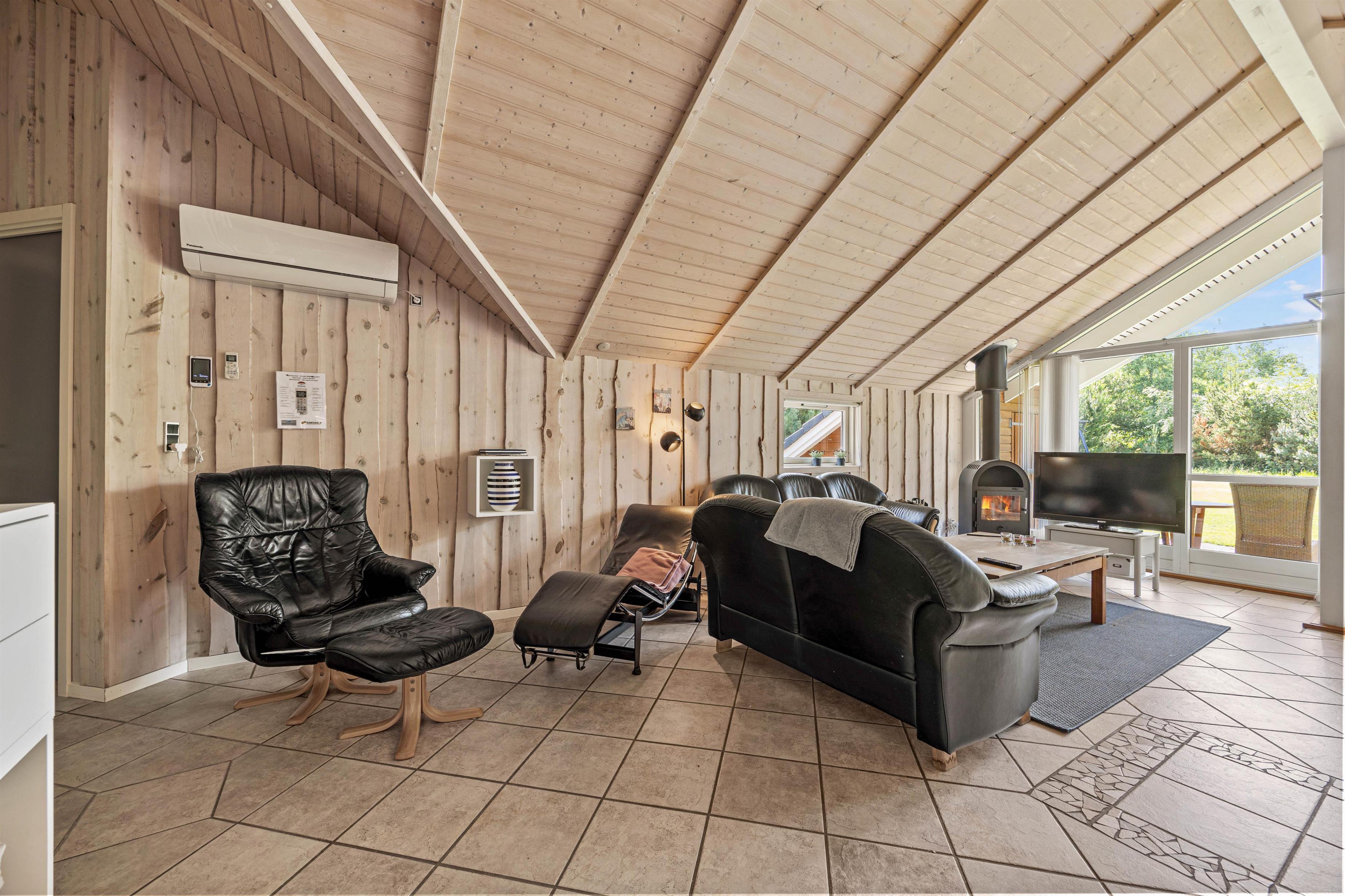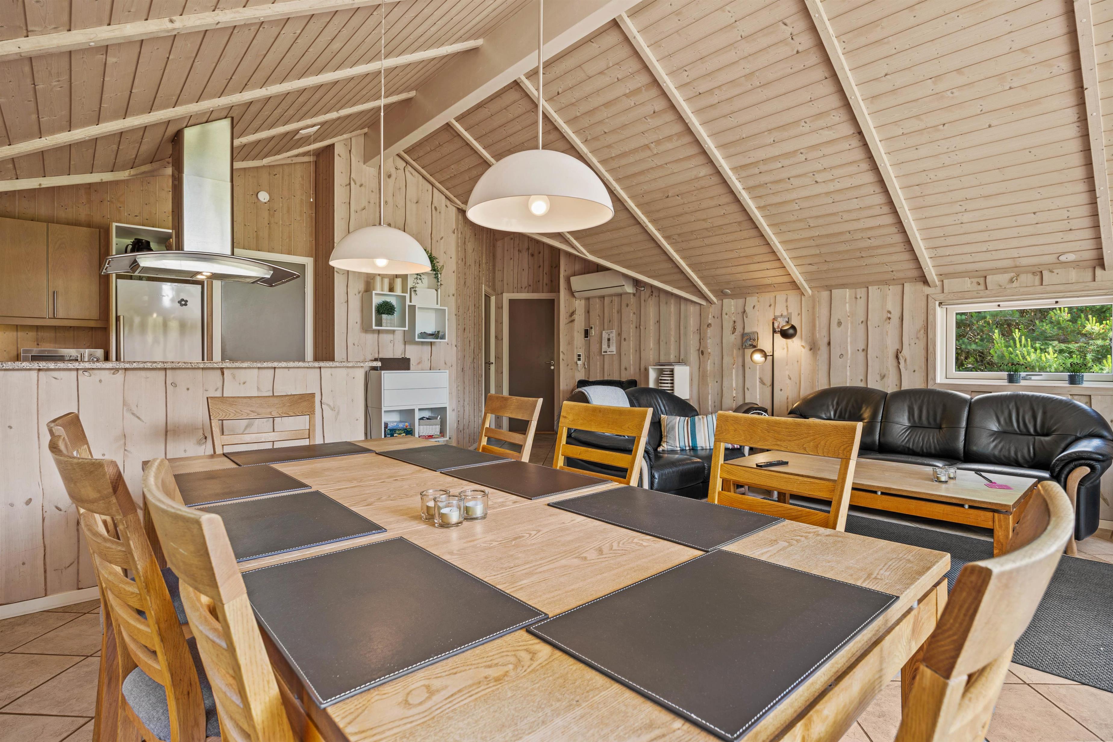 Det åbne stue- og køkkenområde er moderne og veludstyret med flere praktiske goder som for eksempel opvaskemaskine. Alt i alt får I her en lys og venlig indretning, og de store panoramavinduer sørger for, at I samtidig har en flot udsigt ud over de naturskønne omgivelser.