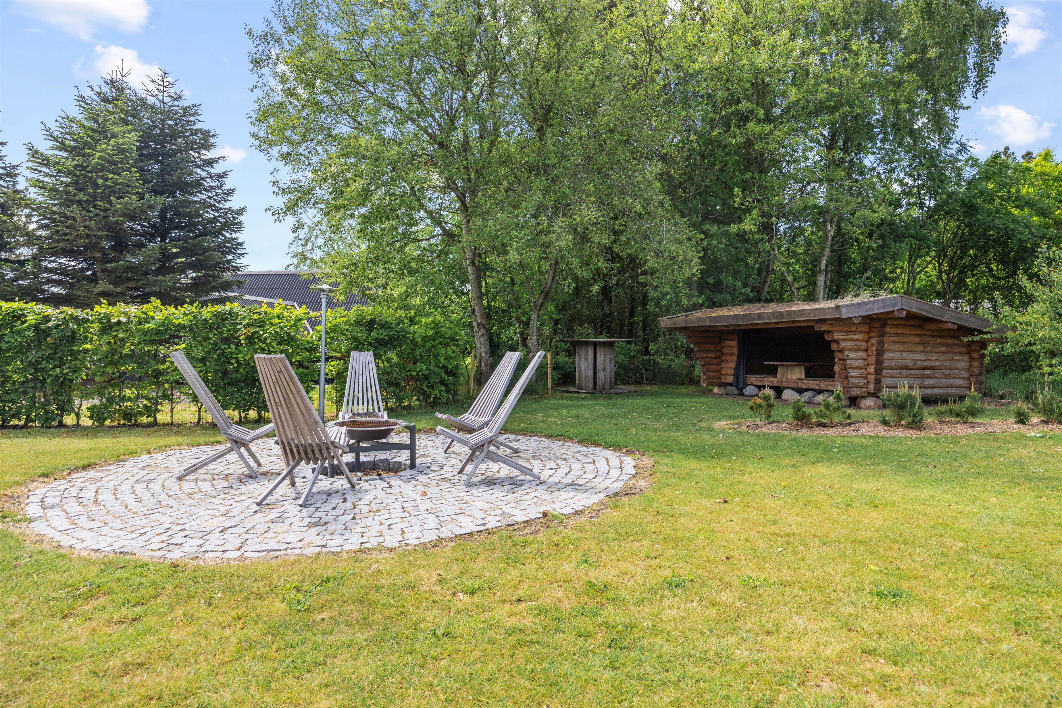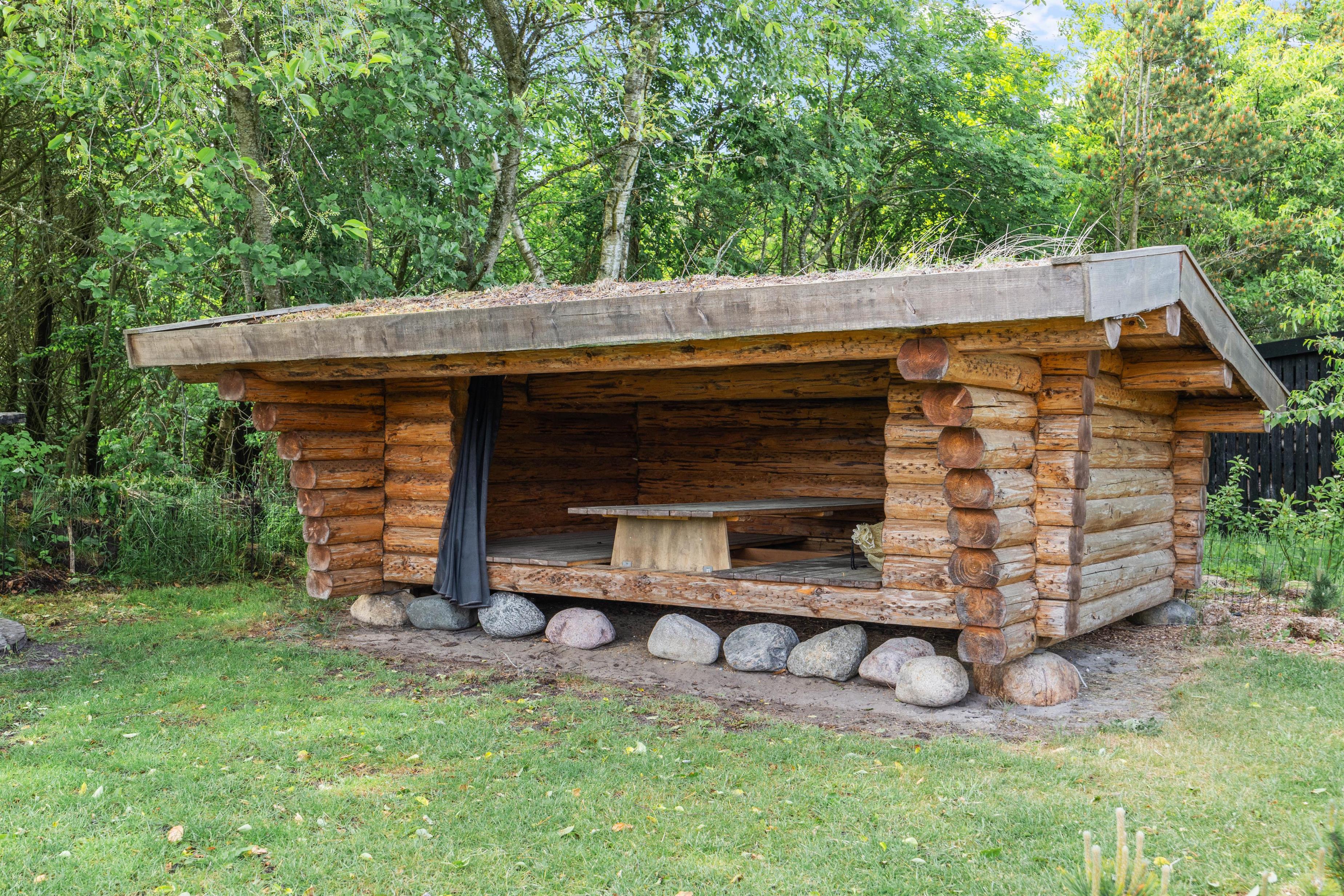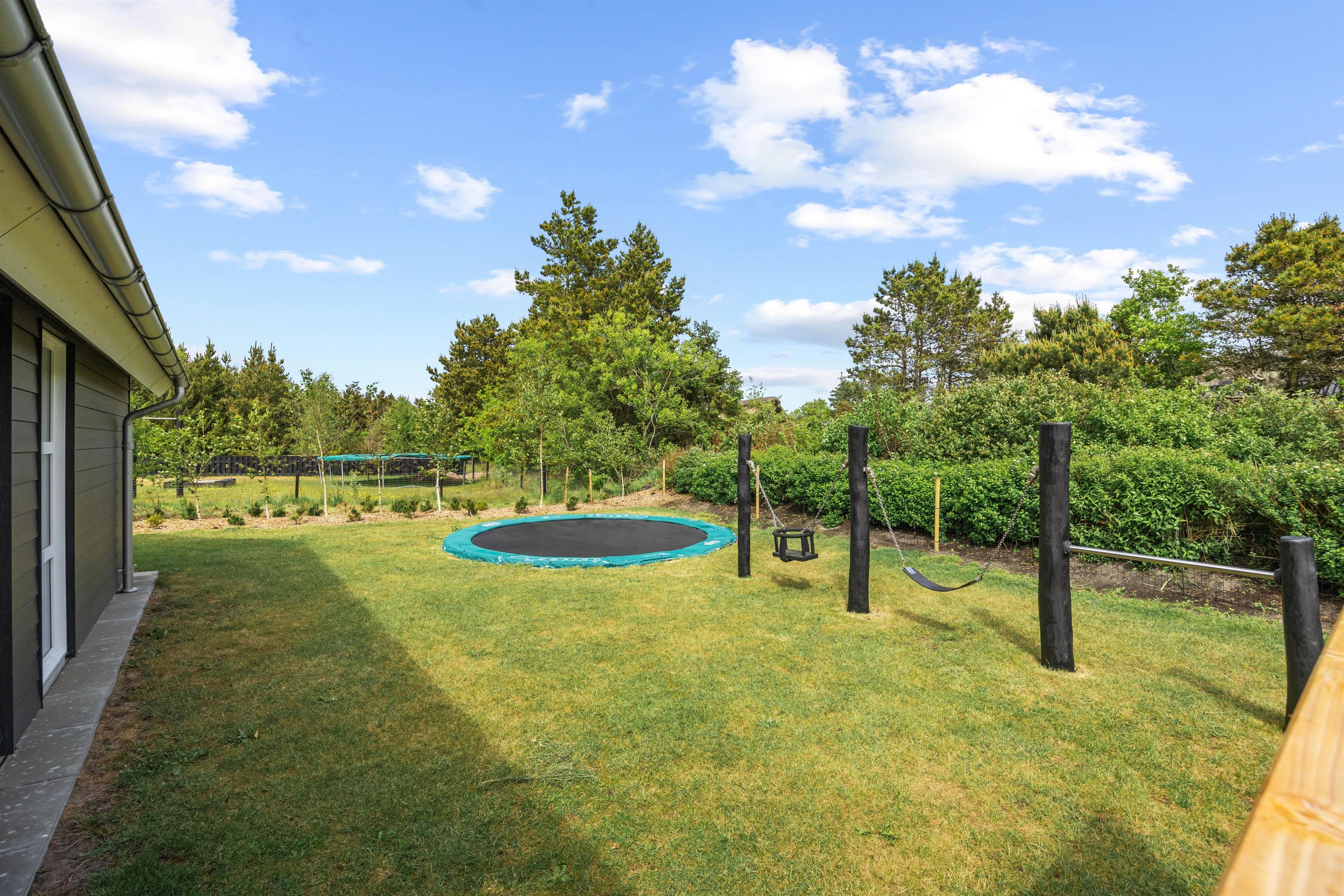 Feriehusets terrasse byder på havemøbler og liggestole, som I kan finde jer godt til rette i, mens I slapper af i solen. Og skulle I få brug for en pause fra solen, kan I rykke ind under den overdækkede del af terrassen. Om aftenen kan aftensmaden tilberedes på feriehusets gasgrill, mens børnene gynger eller tager en sidste hoppetur på trampolinen. På den store naturgrund, som er indhegnet med et 60 cm højt hegn, findes der ydermere en flot bålplads samt en rummelig shelter, hvor I kan prøve at sove udendørs.