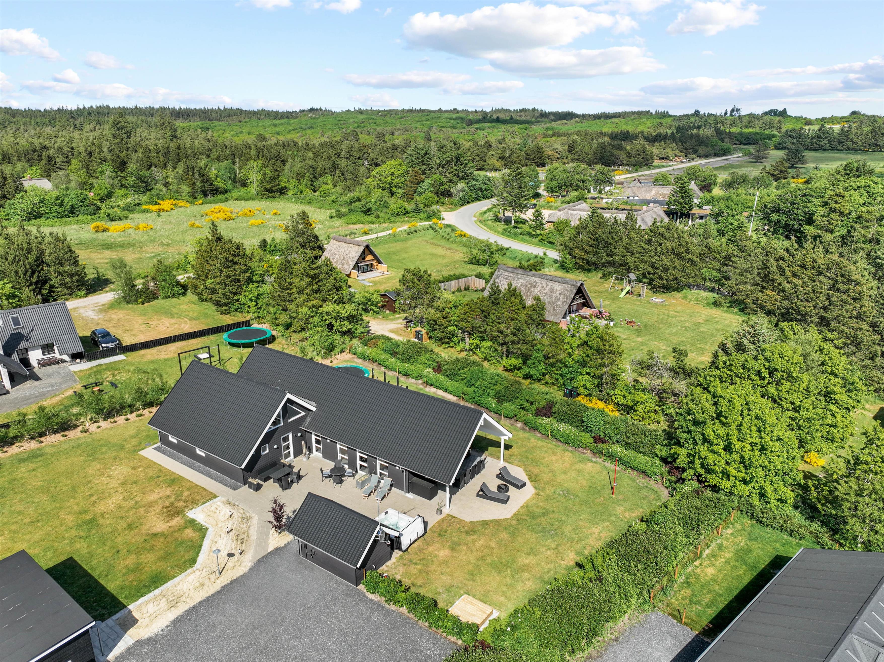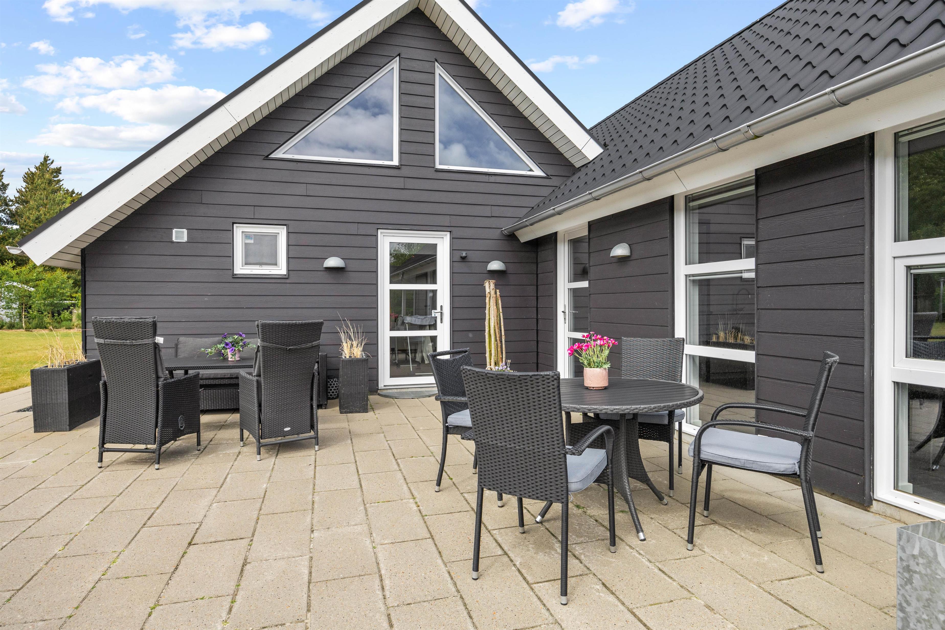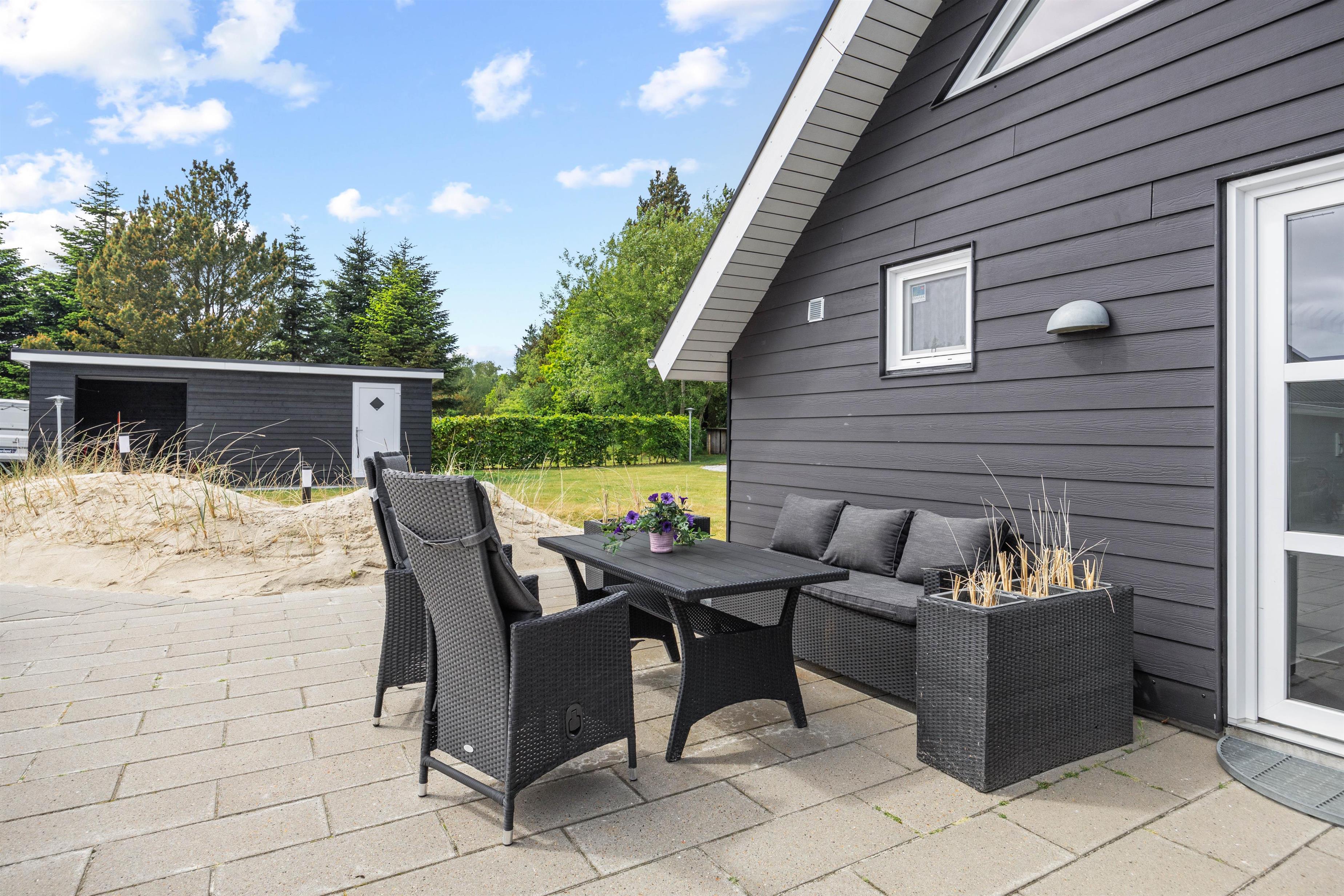 Feriehusets terrasse byder på havemøbler og liggestole, som I kan finde jer godt til rette i, mens I slapper af i solen. Og skulle I få brug for en pause fra solen, kan I rykke ind under den overdækkede del af terrassen. Om aftenen kan aftensmaden tilberedes på feriehusets gasgrill, mens børnene gynger eller tager en sidste hoppetur på trampolinen. På den store naturgrund, som er indhegnet med et 60 cm højt hegn, findes der ydermere en flot bålplads samt en rummelig shelter, hvor I kan prøve at sove udendørs.
