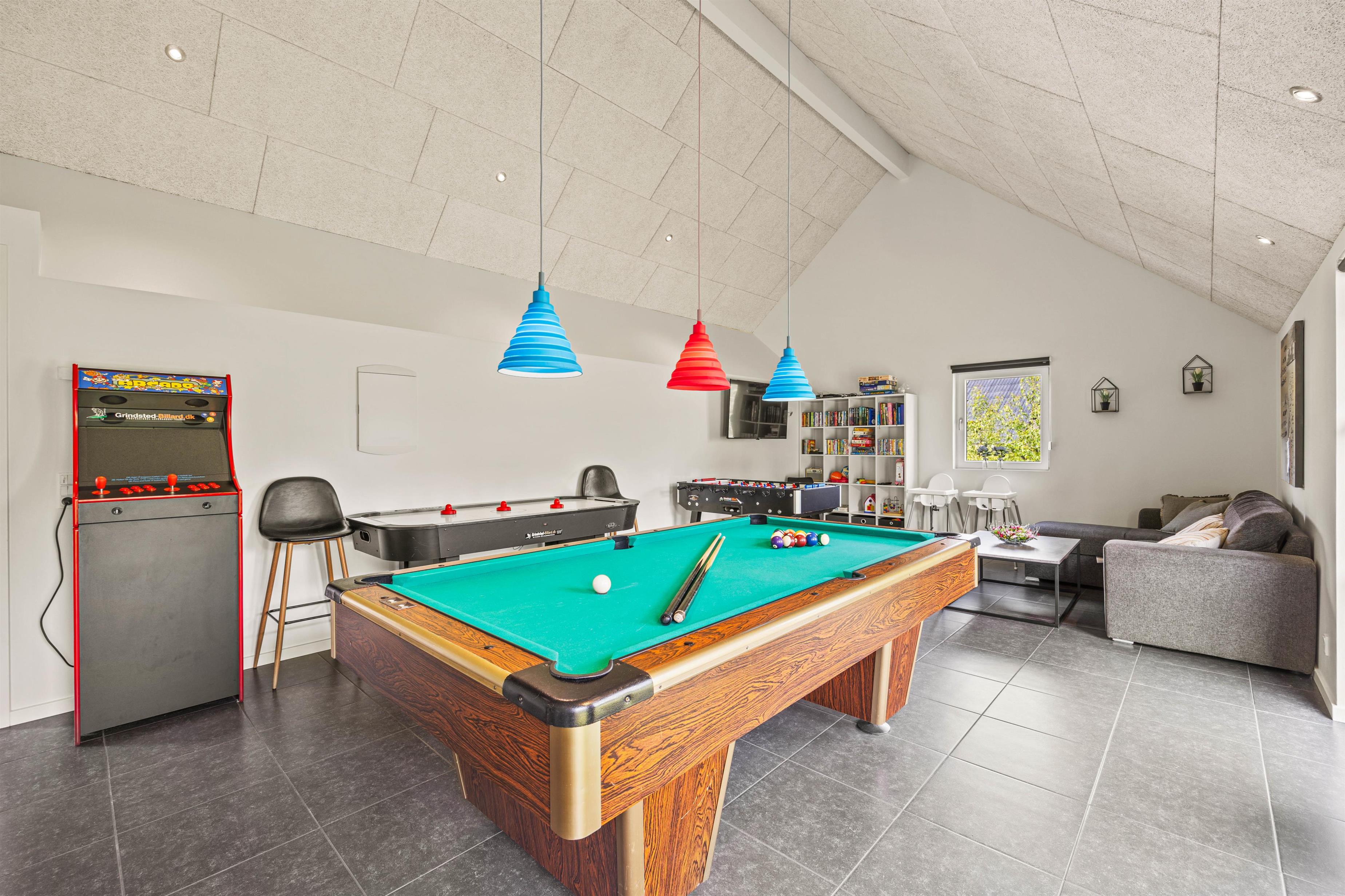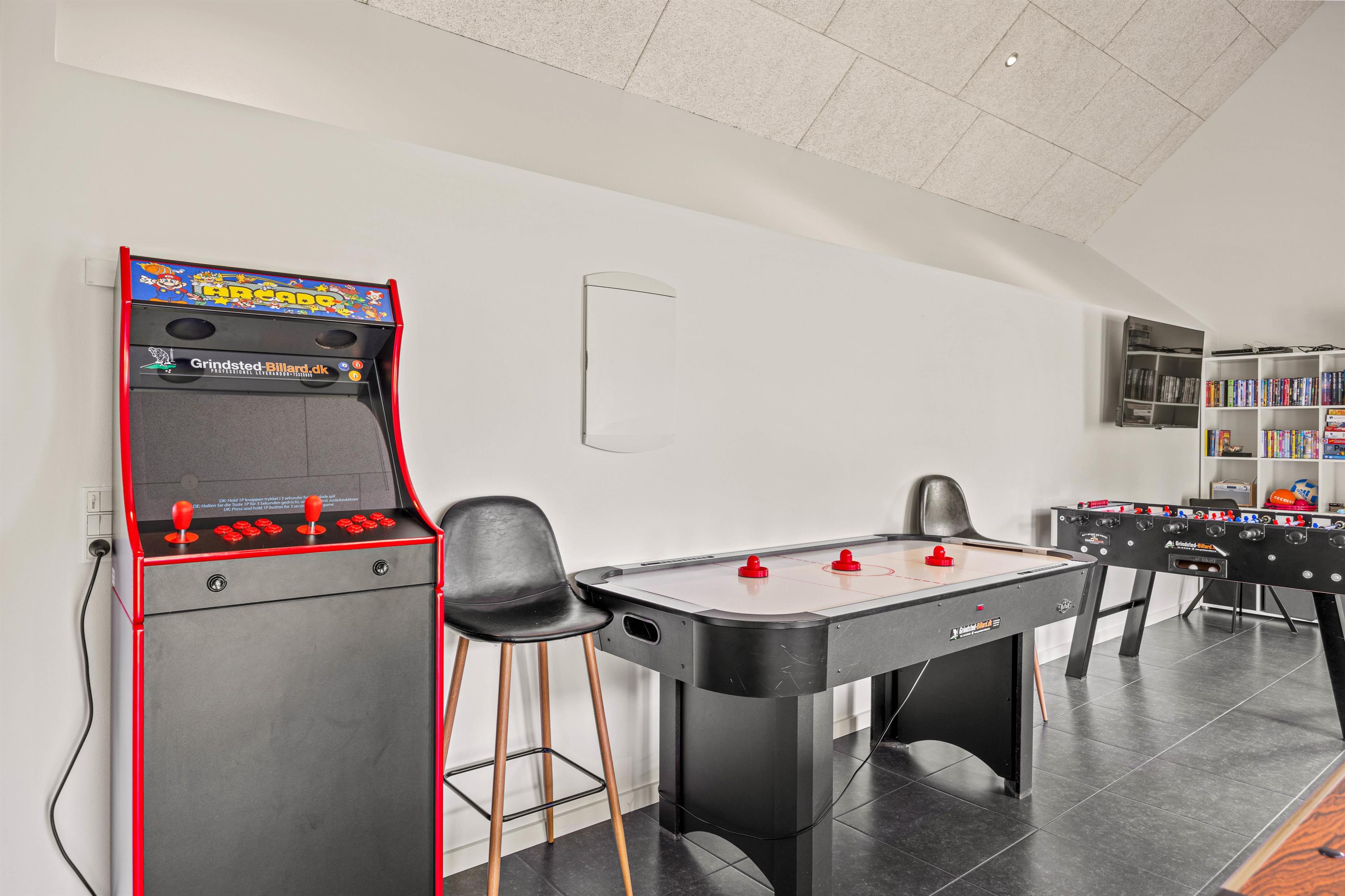 Til de mere underholdende og sjove feriestunder kan I rykke ind i feriehusets aktivitetsrum, hvor der kan spilles poolbillard, airhockey og bordfodbold. Måske I vil arrangere en aften med turnering? Ydermere er der en Arcade spillemaskine, som I kan prøve jeres held med.