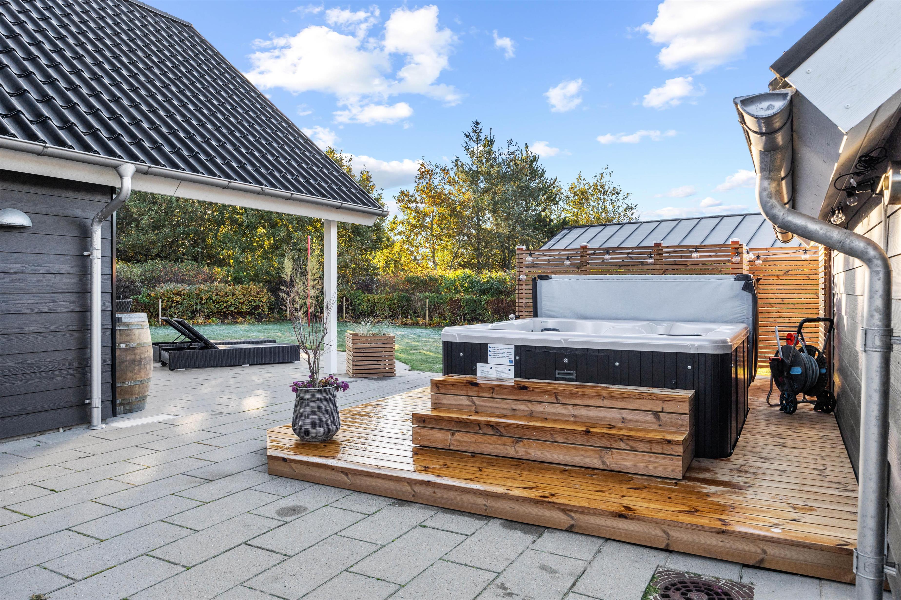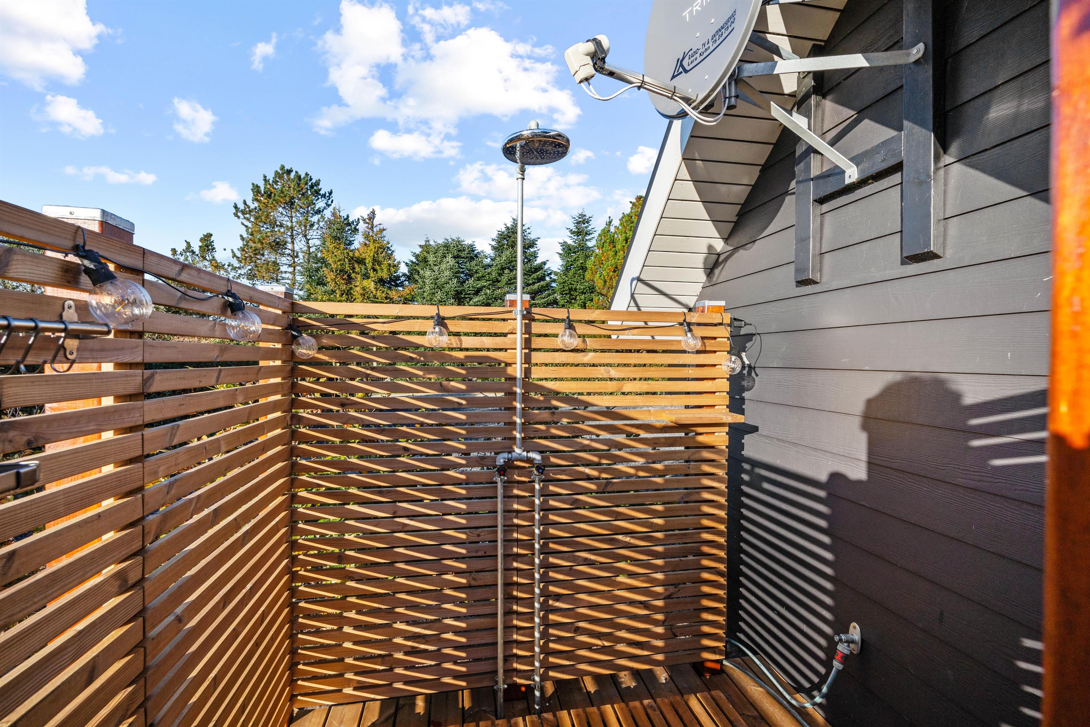 På feriehusets udeområde kan I se frem til at nyde masser af afslapning. Her venter jer nemlig en udebruser*, en udespa – til 6 personer - og en infrarød sauna i saunahuset, der er placeret i forlængelse af terrassen.