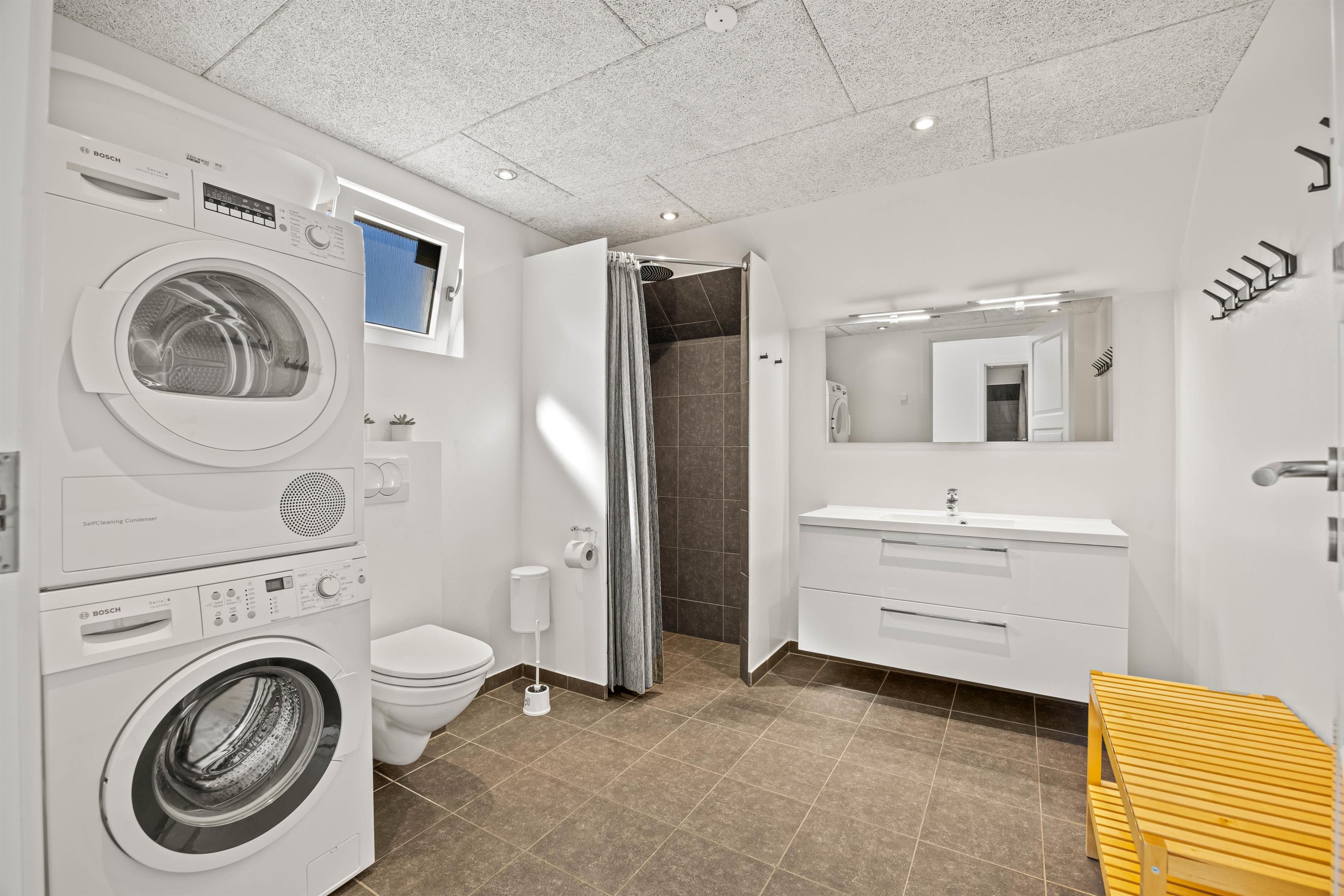Om morgenen vil I ikke stå i kø, da der er 2 badeværelser i dette feriehus. Det ene badeværelse er endda udstyret med både vaskemaskine og tørretumbler, som kan være jer behjælpelig med at få vasket jeres vasketøj.