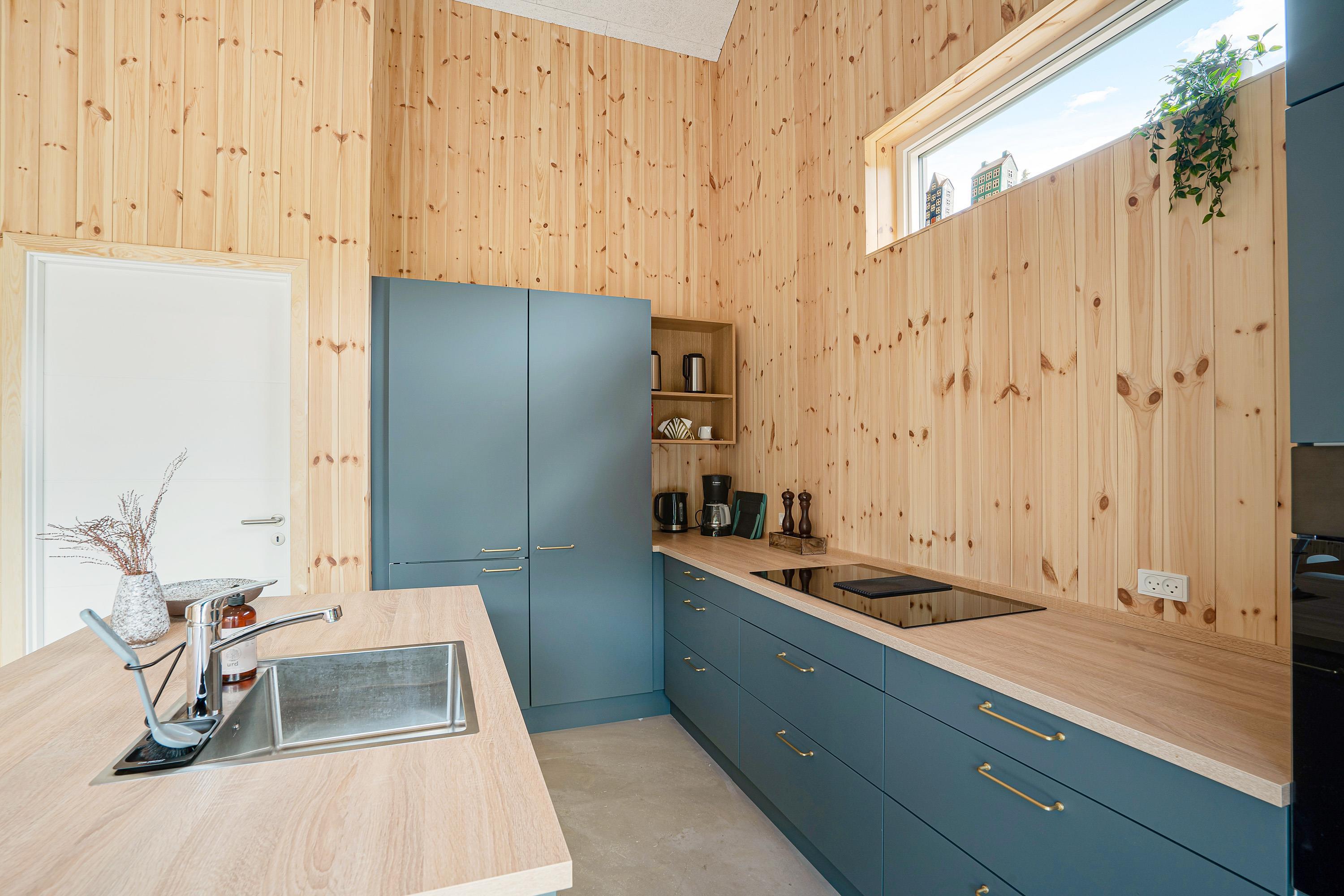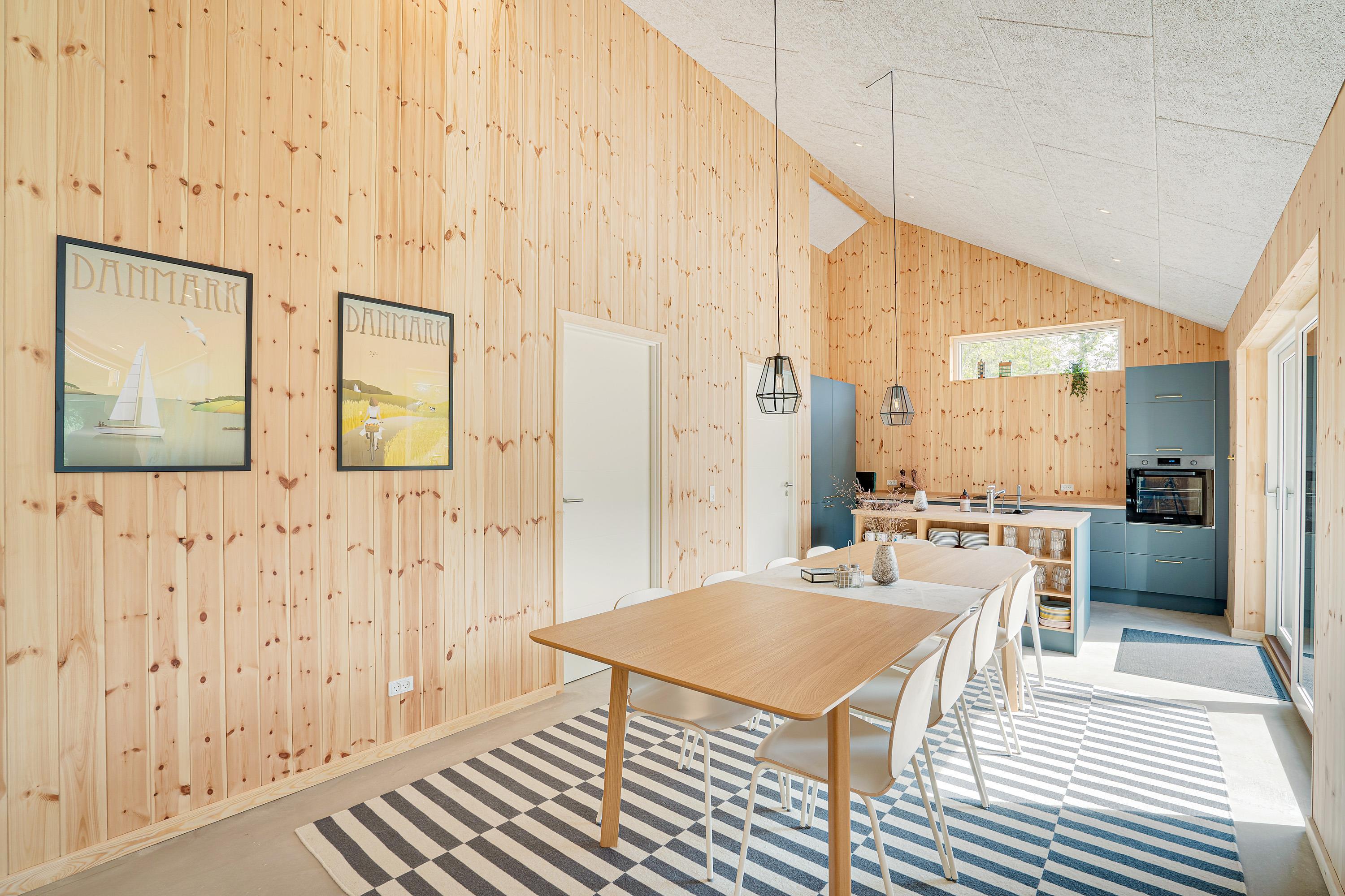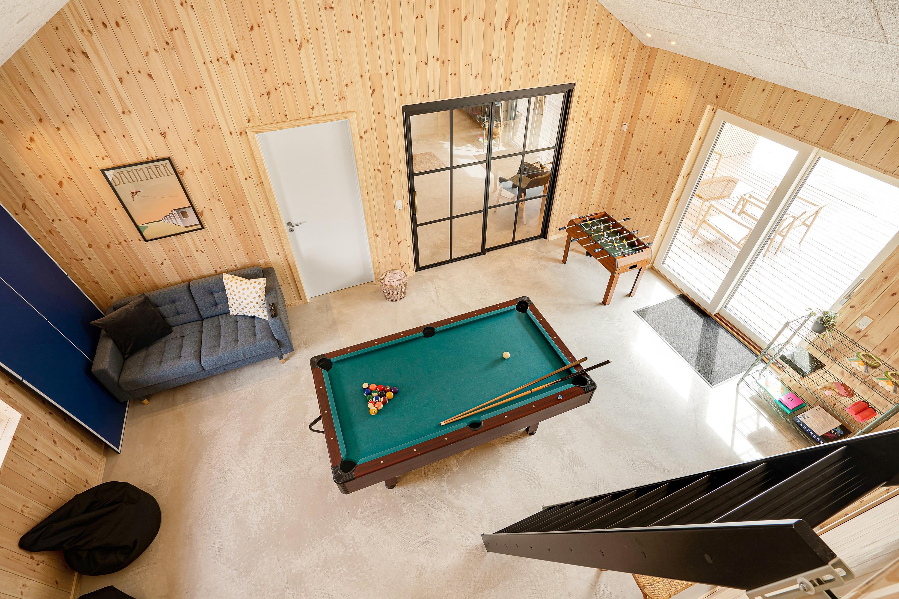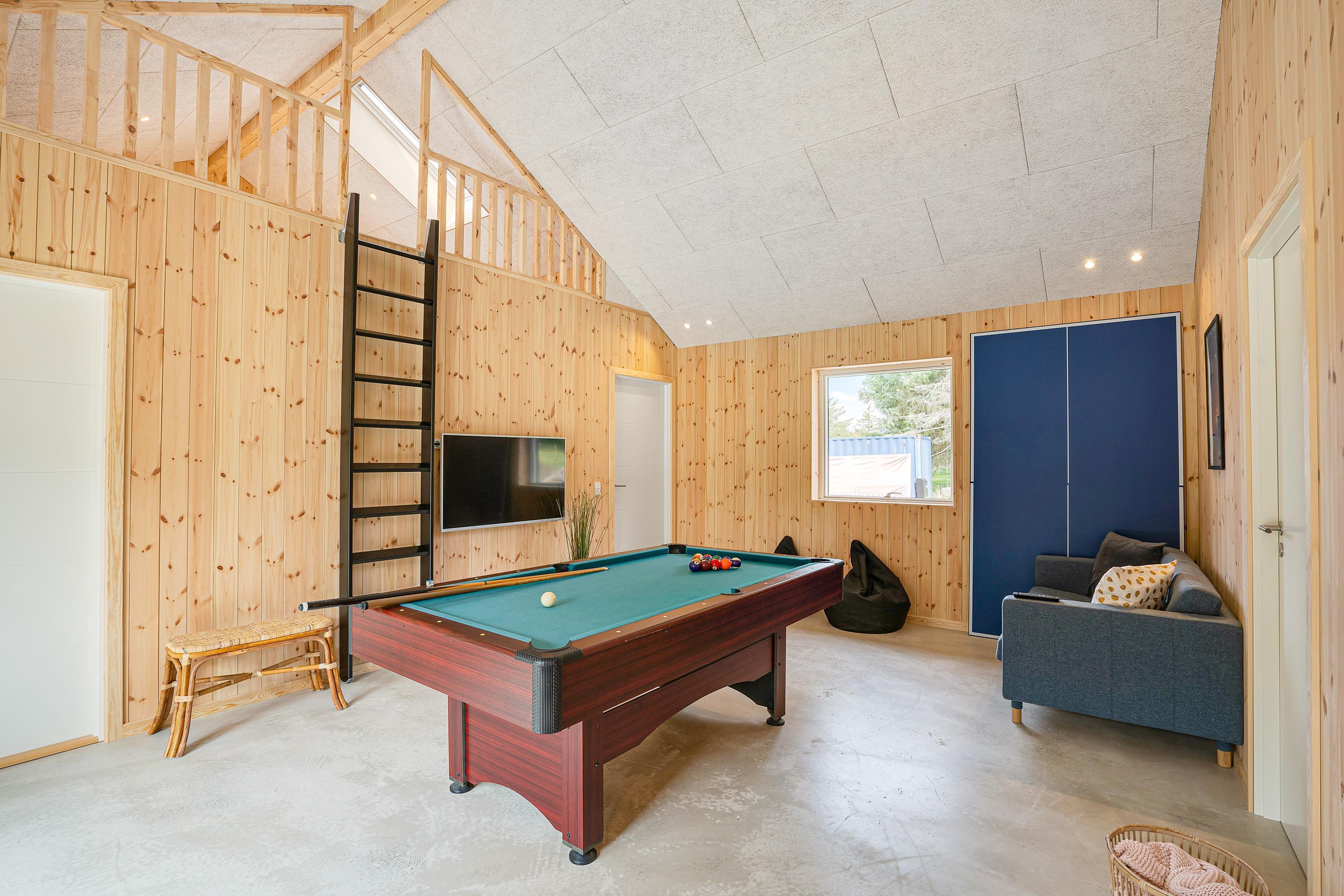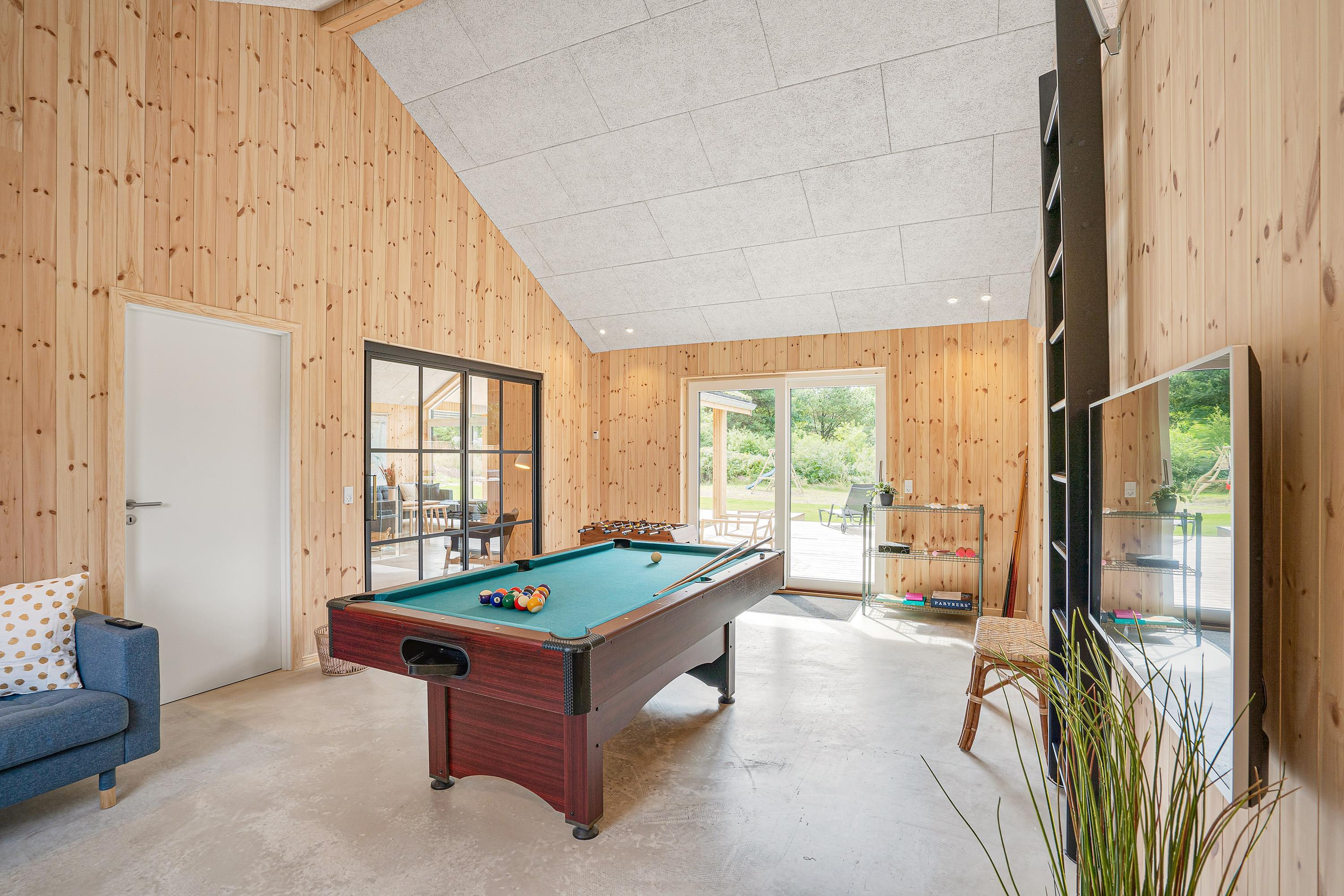 Sommerhusets hjerte er aktivitetsrummet med et aktivitetsbord, hvor I kan spille billard, airhockey eller bordtennis. I det rummelige køkkenalrum finder I køkkenet, hvor I kan tilberede feriens måltider. Køkkenet går i et med stuen, hvor I kan læne jer tilbage i sofaen og se en god film sammen.