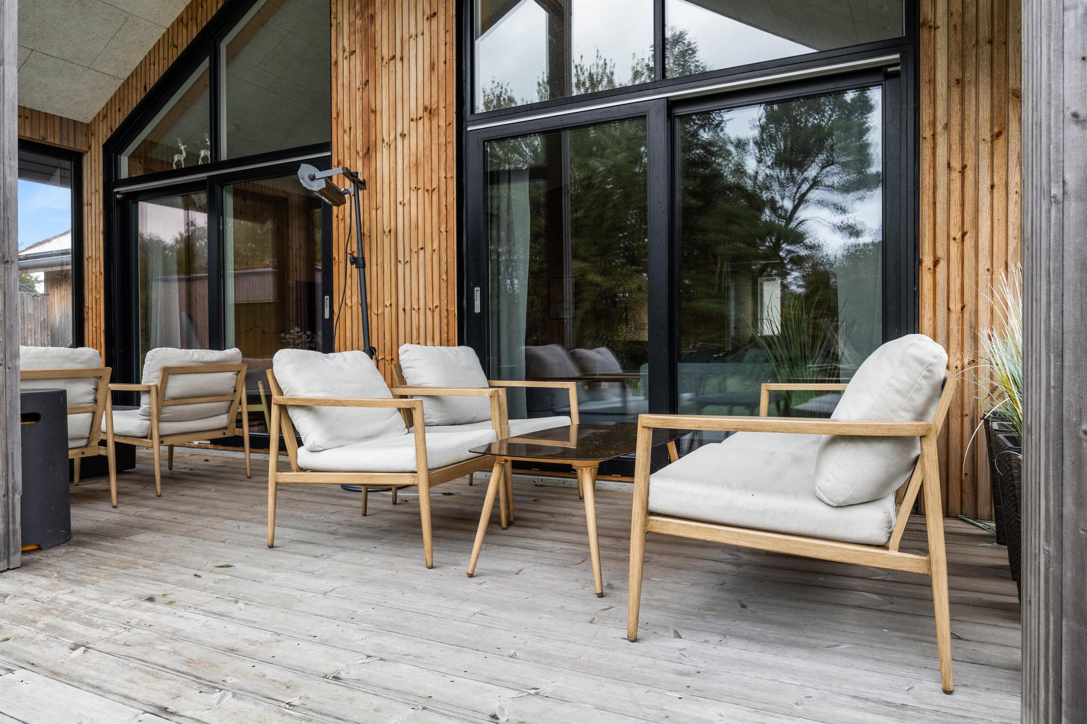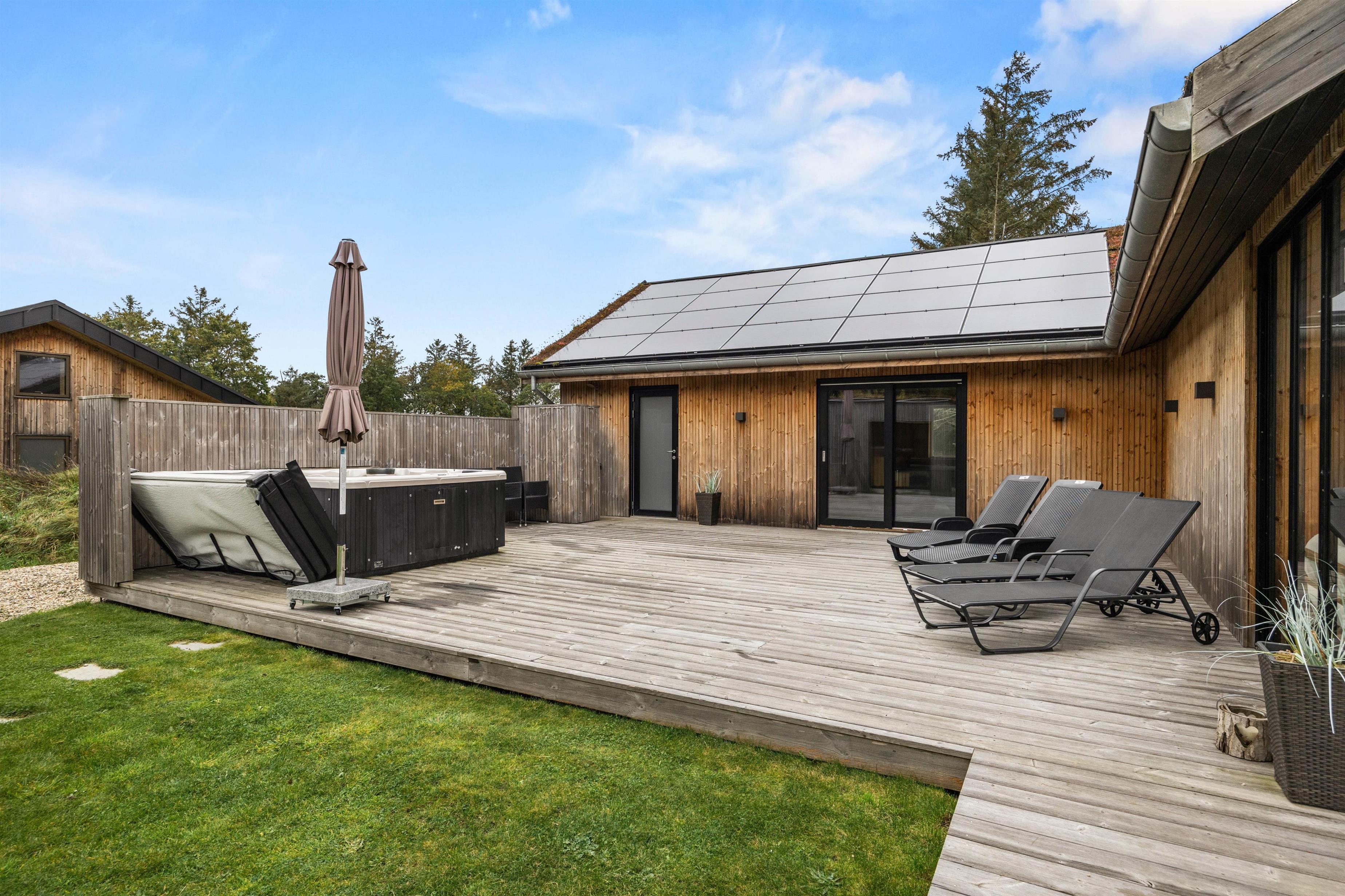 I sommerhusets baghave finder I terrassen og udekøkkenet. Her kan I lave mad under åben himmel og benytte jer af sommerhusets grill. Der er både havemøbler og solvogne, og kan I slappe af i solen - eller finde et sted i læ. En udendørs bruser sørger for, at I kan få et forfriskende skyl under åben himmel.