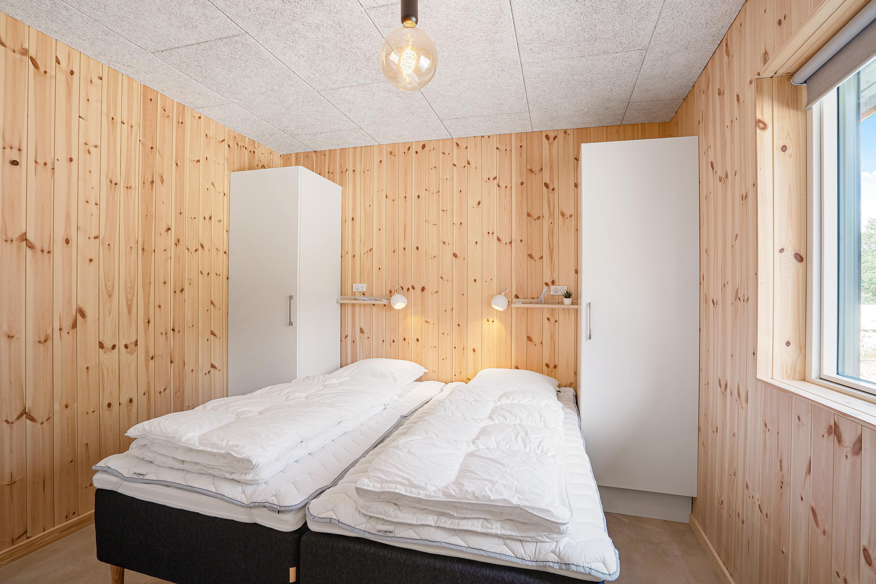 Det 172 kvadratmeter store aktivitetshus blev bygget i 2021, og her er der 4 soverum, som alle er udstyret med dobbeltsenge. Oppe på den hyggelige hems er der enkeltsenge. Hele sommerhuset har gulvvarme, så I skal ikke være bekymret for, at I kommer til at fryse fødderne.