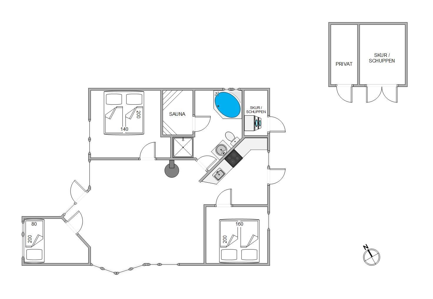 Sommerhuset er 70 kvadratmeter stort, og her er der 3 gode soveværelser. 2 af soveværelserne er indrettet med en dobbeltseng hver, mens det tredje soveværelse er indrettet med 1 enkeltseng.