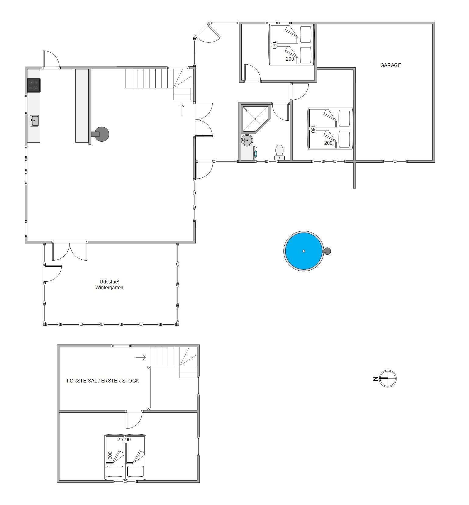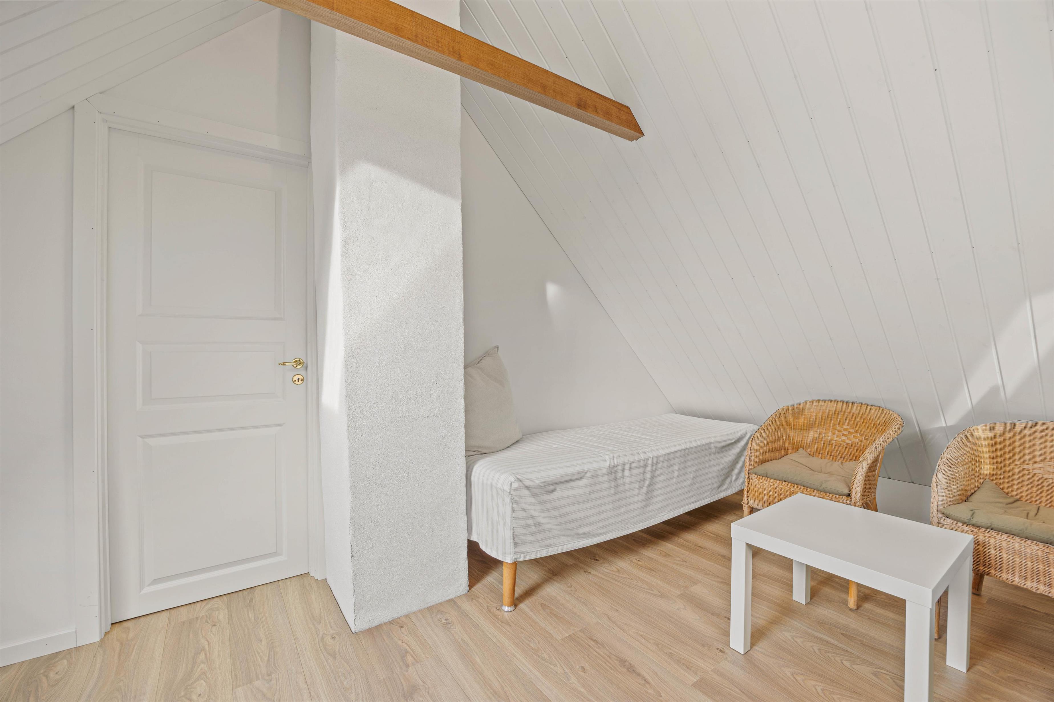 3 lyse soveværelser, alle med dobbeltsenge, er at finde i sommerhuset, hvoraf 2 af dem befinder sig i stueetagen og det tredje ligger på førstesalen. I stueetagen er også badeværelset, der er udstyret med gulvvarme.