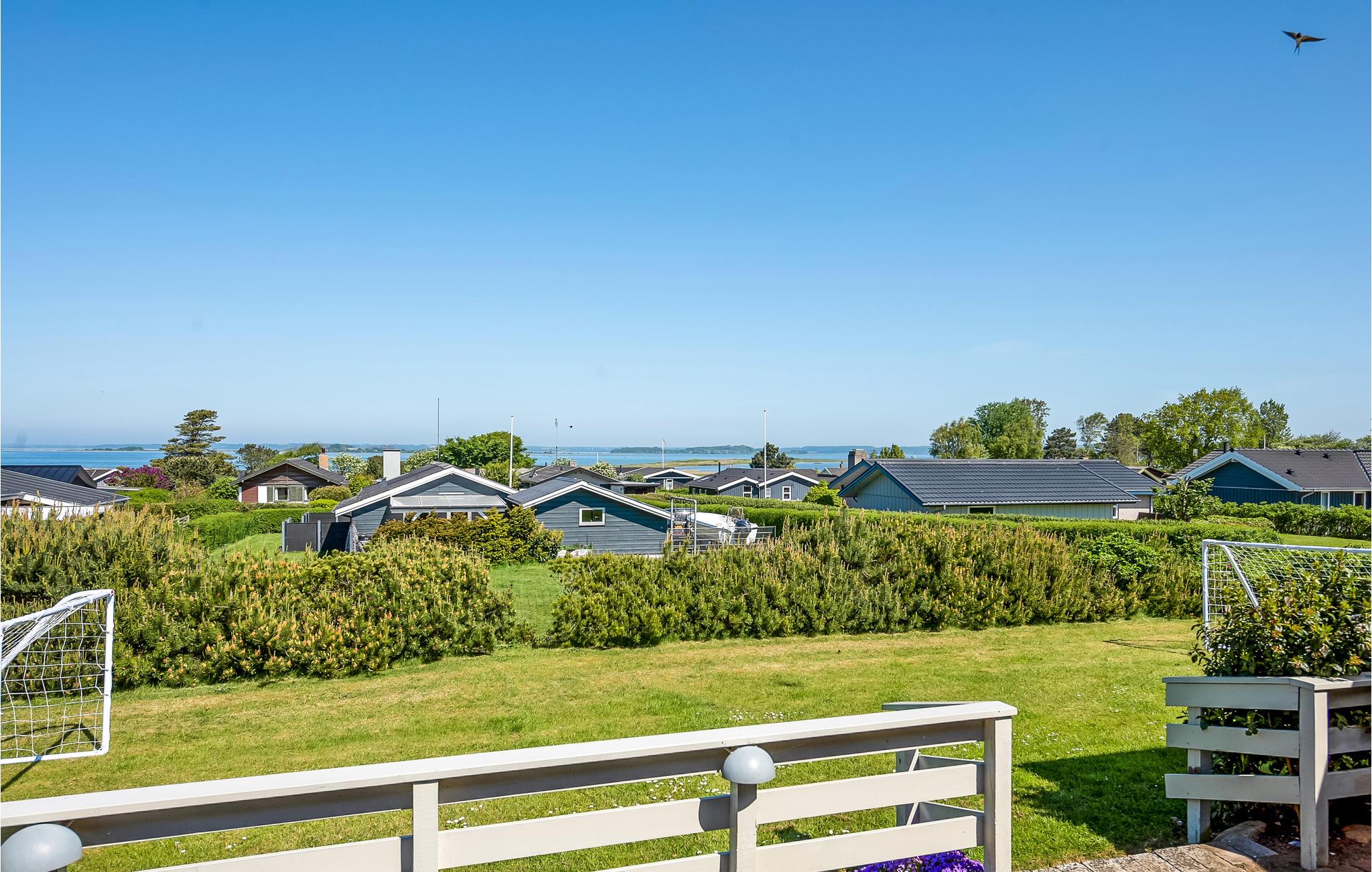 Lyst og moderne sommerhus med terrasser og delvis havudsigt nær stranden ved Faaborg.