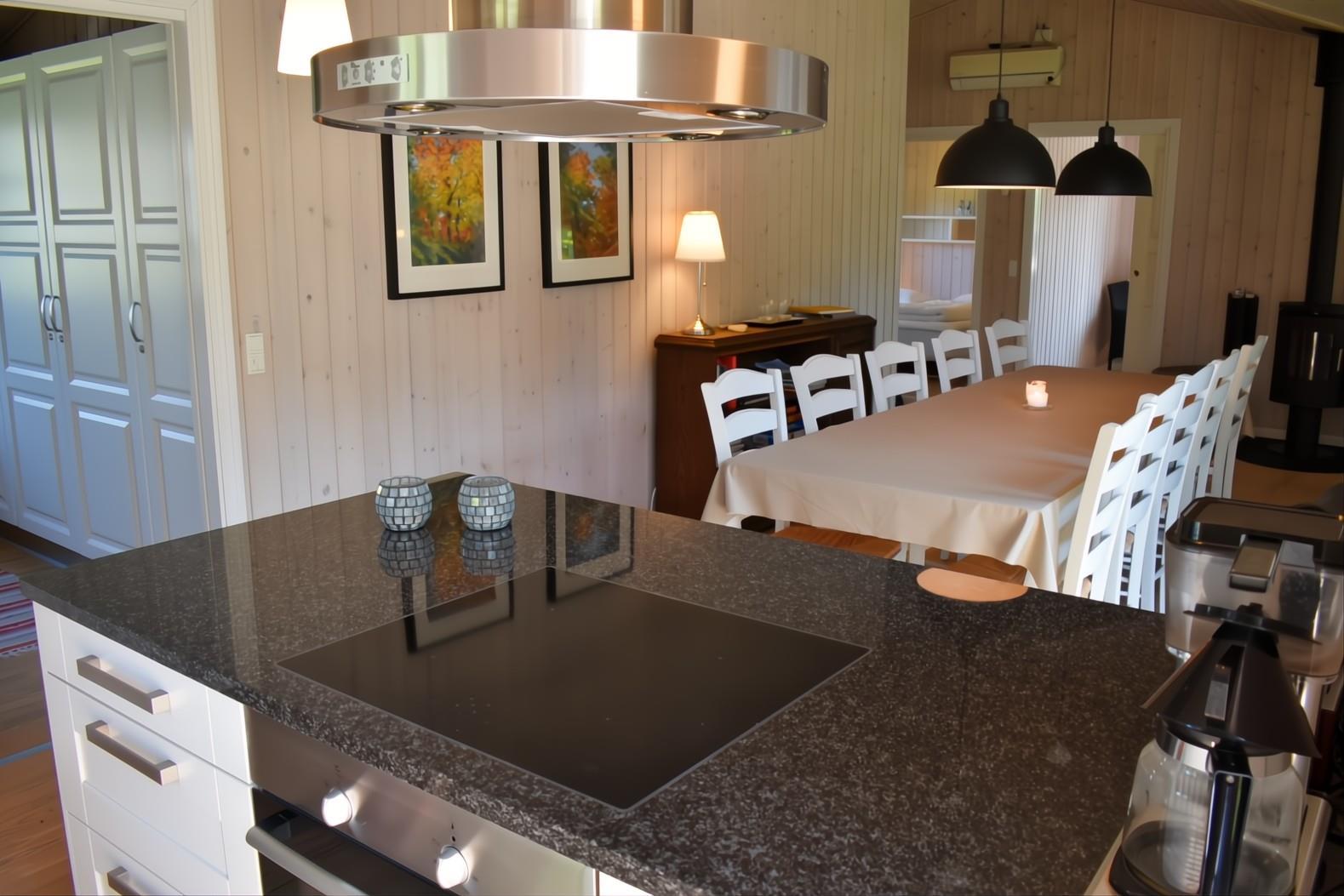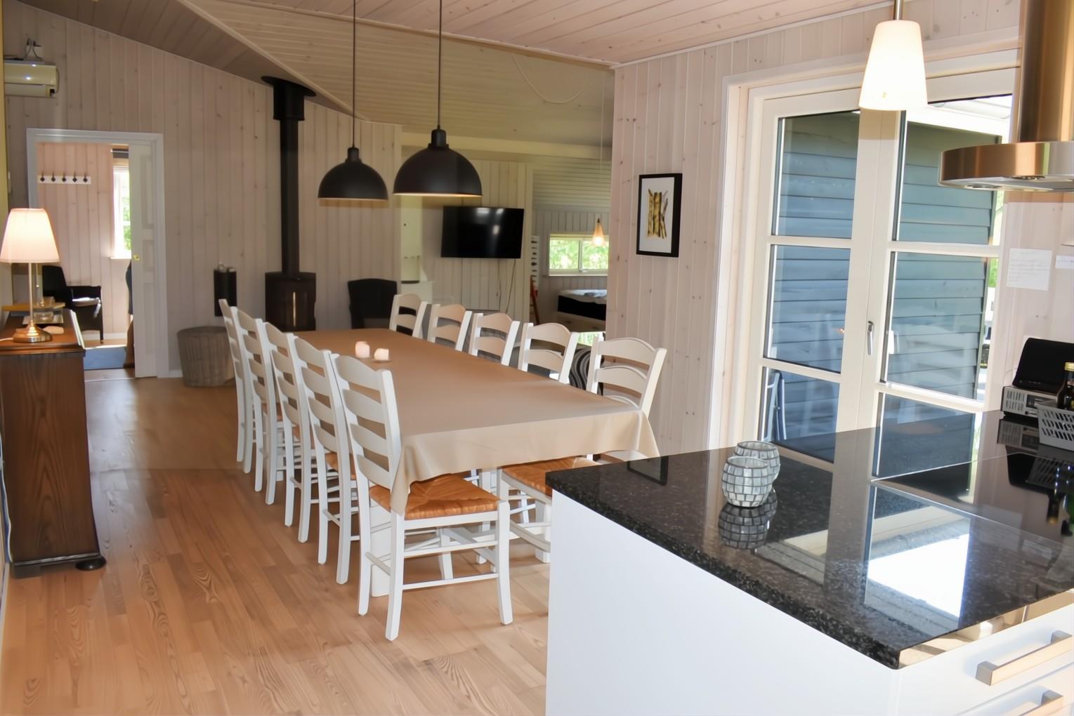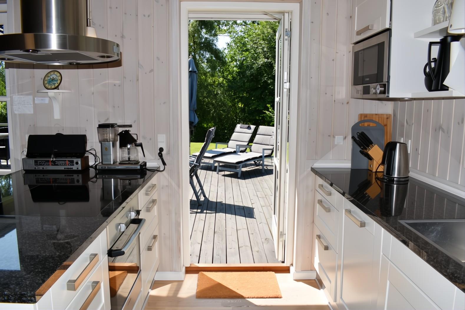 Sommerhuset er indrettet med et rummeligt og moderne køkken i åben forbindelse med stuen, hvor brændeovnen spreder varme og hygge. I stuen finder du også en hyggelig alkove, der giver ekstra soveplads. De tre store soveværelser er alle udstyret med dobbeltsenge og god skabsplads.