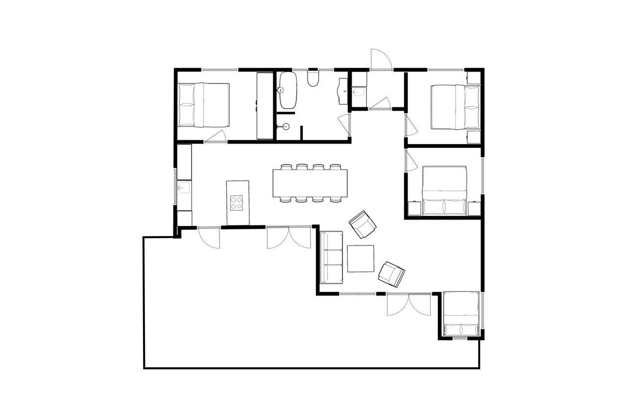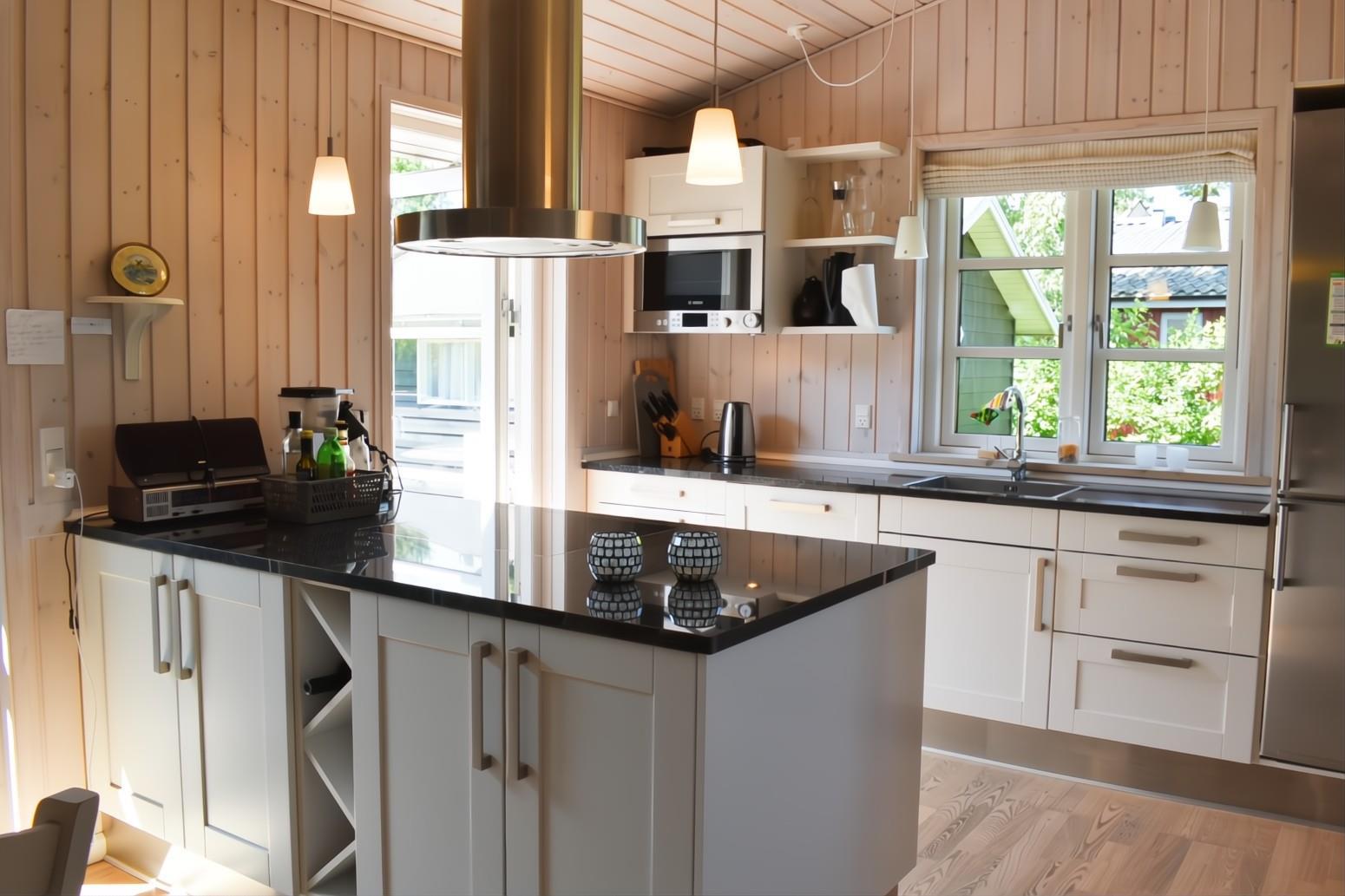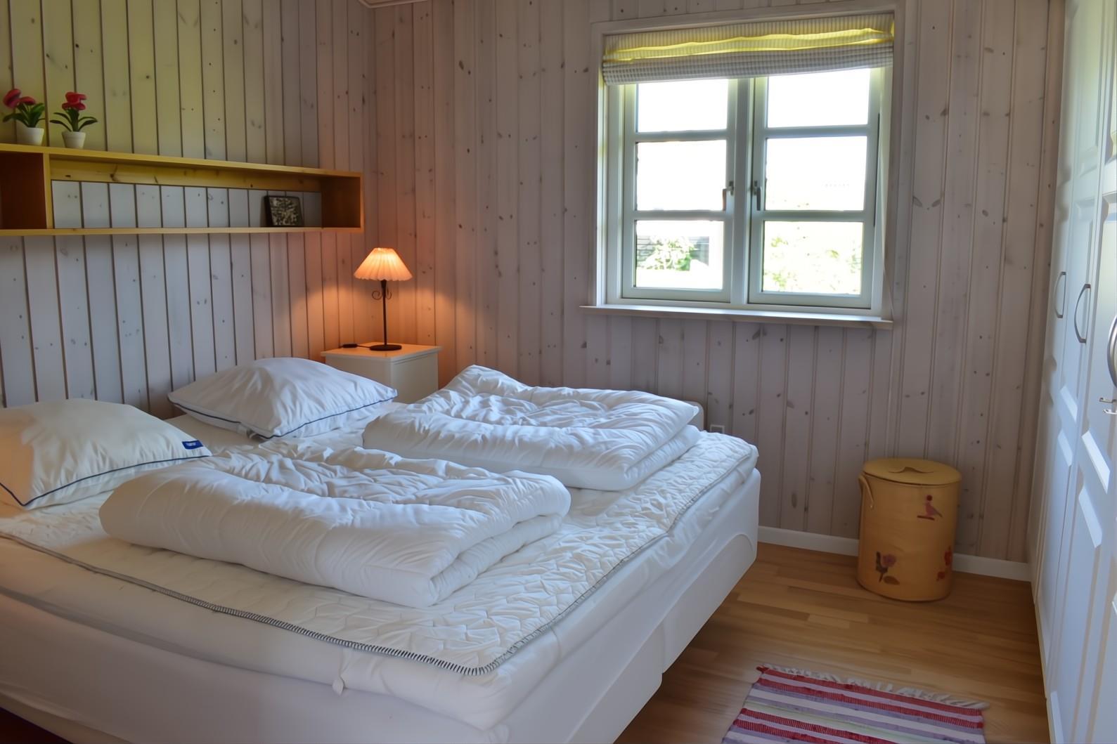 Sommerhuset er indrettet med et rummeligt og moderne køkken i åben forbindelse med stuen, hvor brændeovnen spreder varme og hygge. I stuen finder du også en hyggelig alkove, der giver ekstra soveplads. De tre store soveværelser er alle udstyret med dobbeltsenge og god skabsplads.