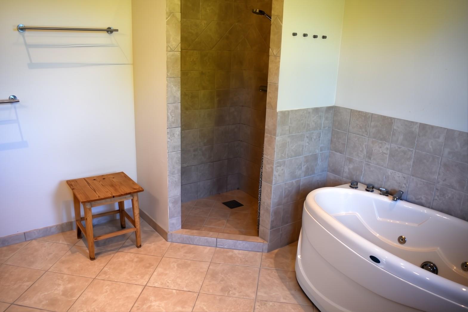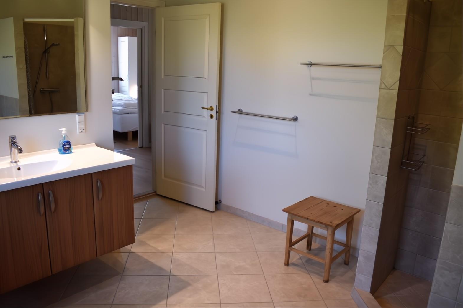 Badeværelset er indrettet med lækre detaljer som gulvvarme og spa til to personer – ideelt til afslapning efter en dag i naturen eller på stranden.
