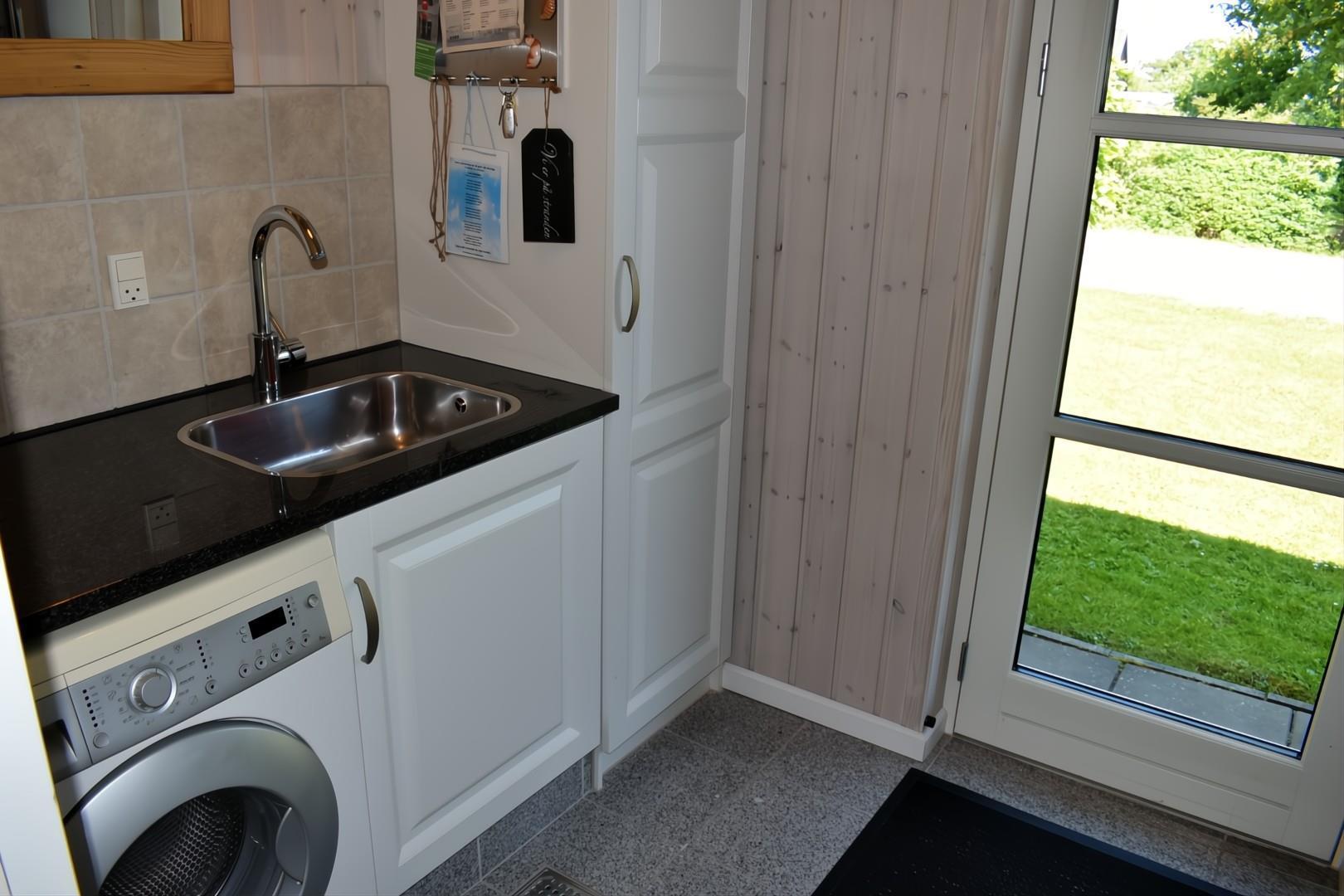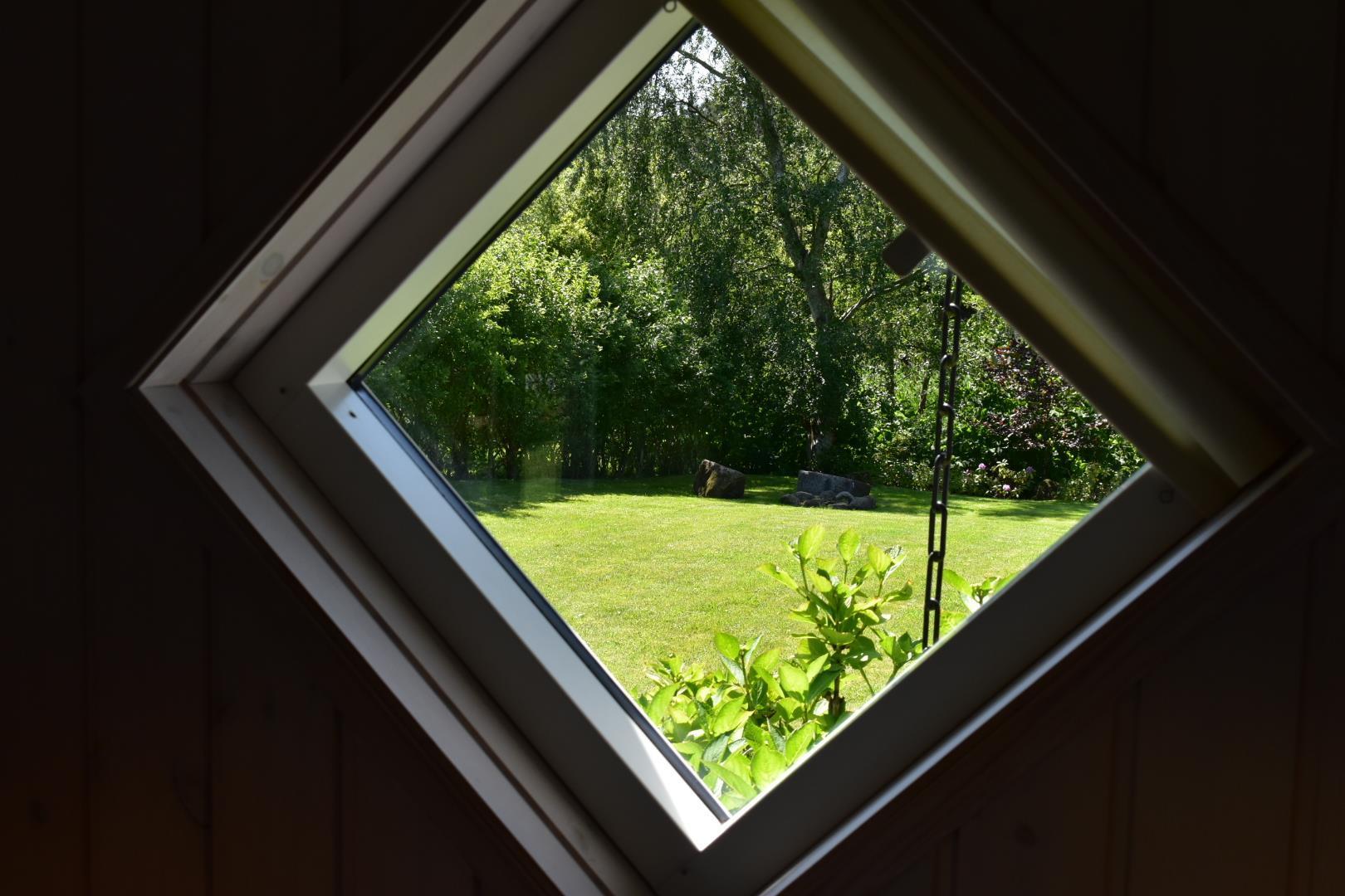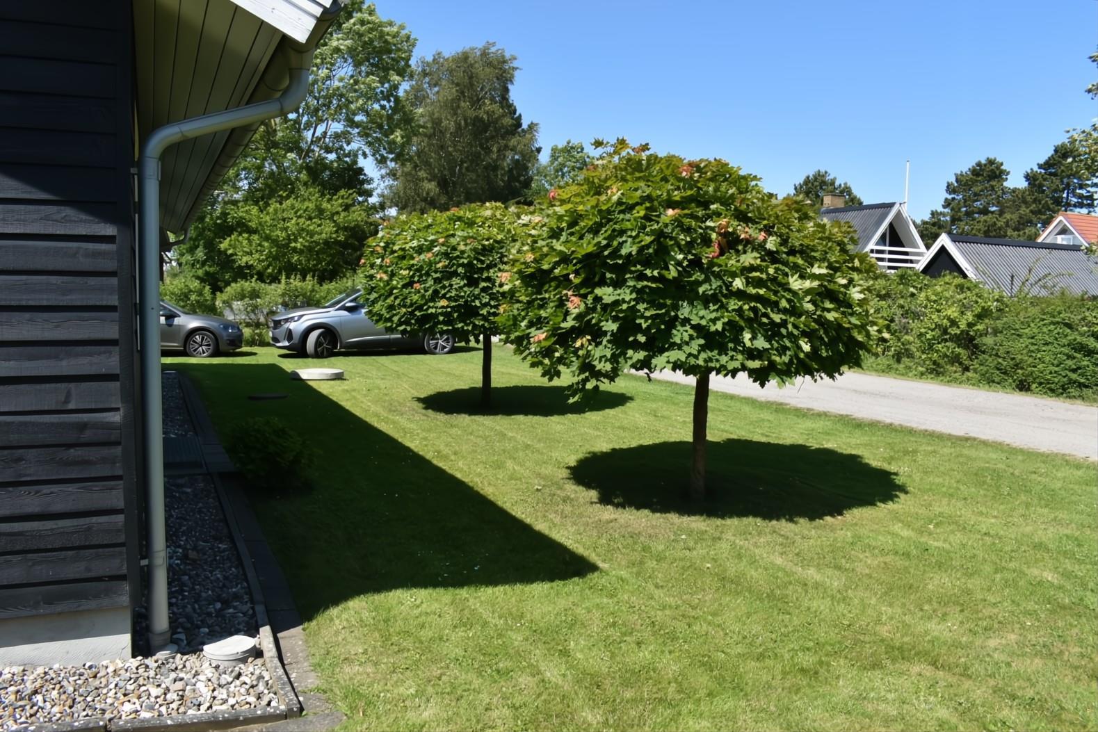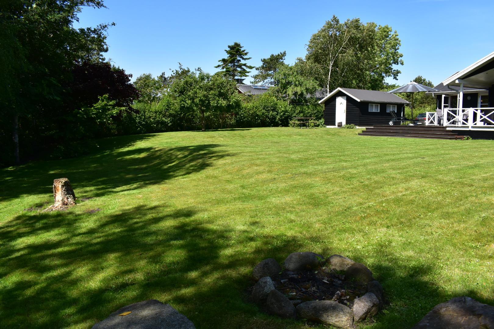 Fra stuen er der direkte udgang til en stor, delvist overdækket træterrasse, hvor du kan nyde solrige dage og lange sommeraftener med udsigt til den smukke have og det lille skovområde, som grunden grænser op til. I haven finder du også et bålsted, som indbyder til snobrød, stjernekig og feriestemning i særklasse.