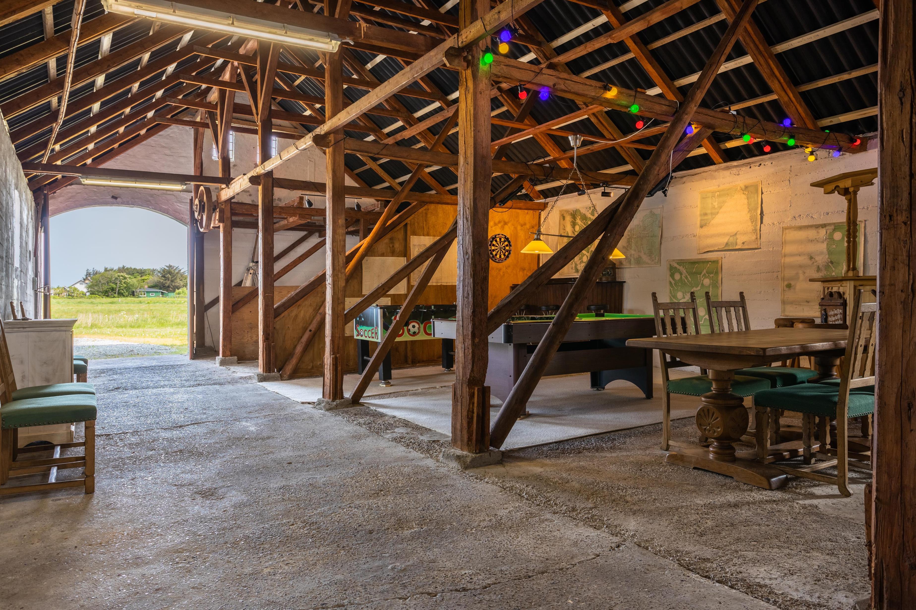 Med til feriehuset hører den originalt bevarede stald fra 1904, hvor der er mulighed for mange timers fantasifuld leg. Vil man hygge sig med bordtennis, bordfodbold og poolbord er laden indrettet til dette formål. Der findes desuden en hems på 50 m2 i laden (høloft), som er et oplagt sted til (u)hyggelige fortællinger og røverhistorier.