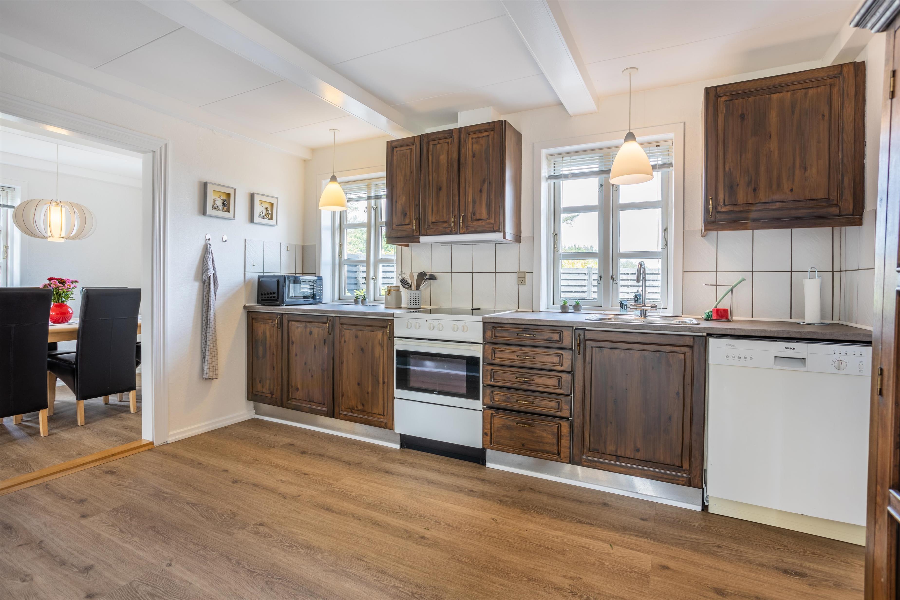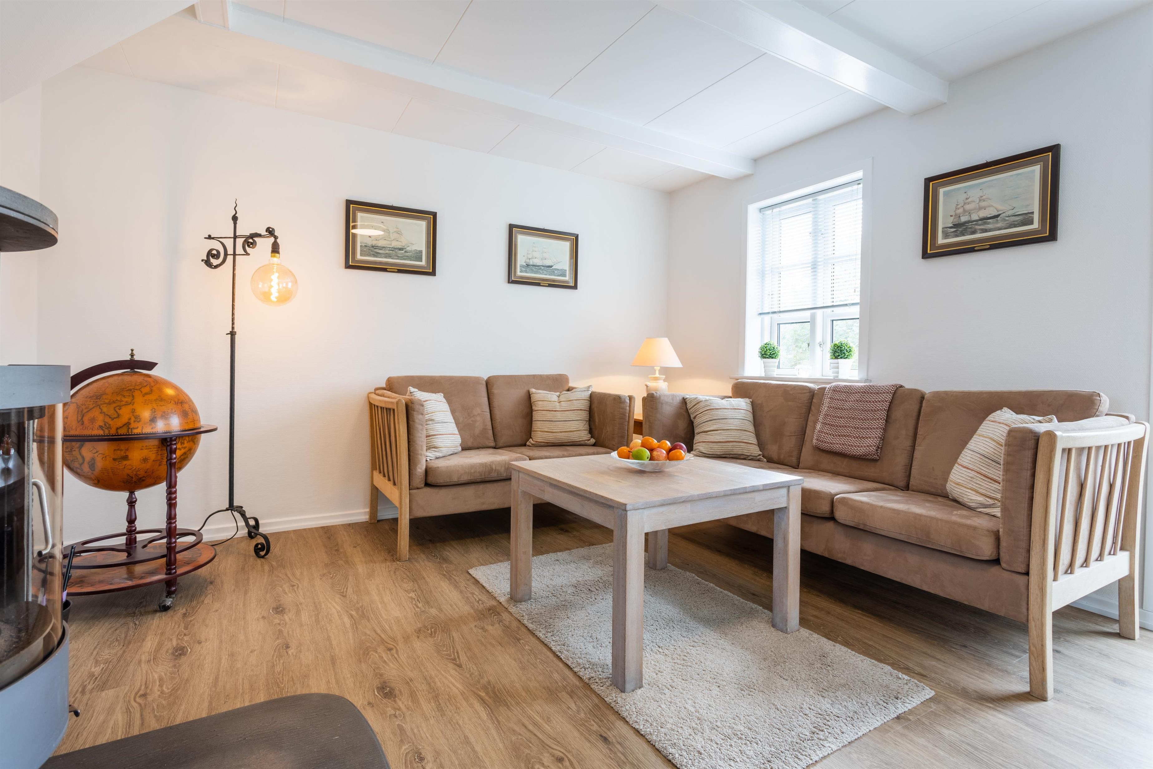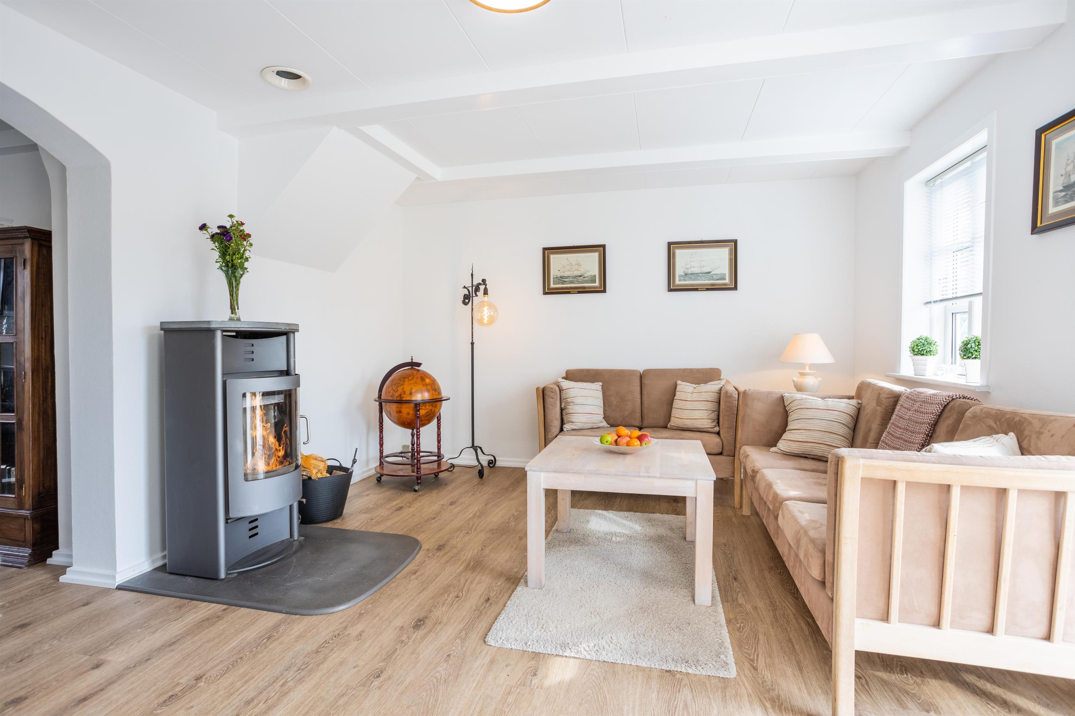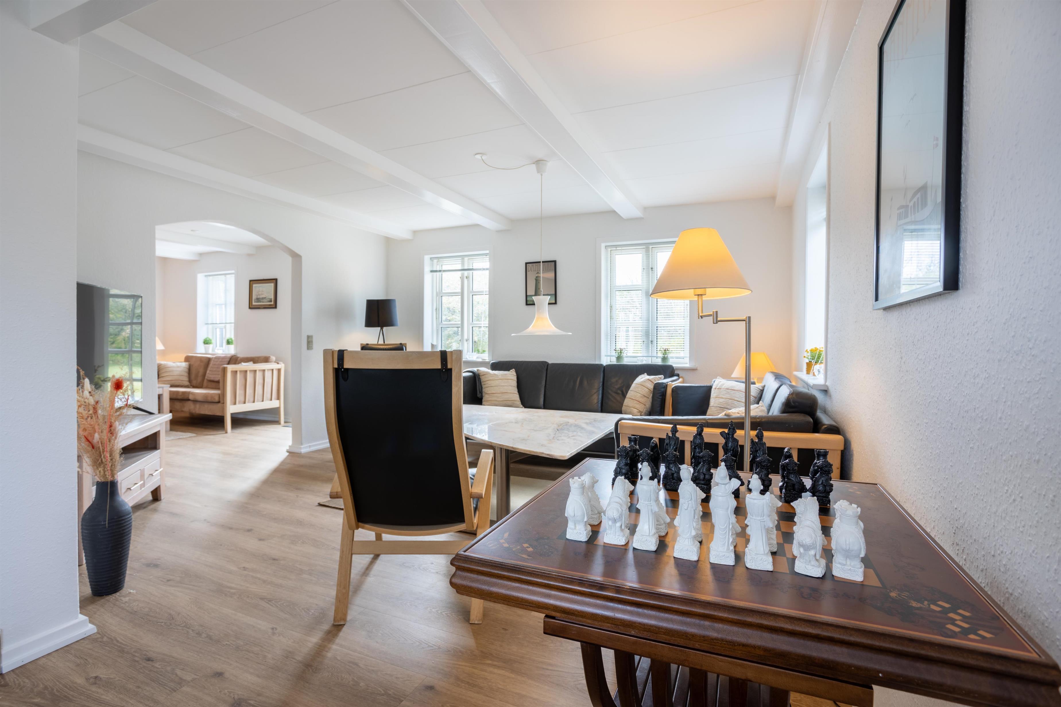 Feriehusets stueplan byder på en entré med opgang til førstesalen, et stort bryggers samt et lyst badeværelse med bruseniche. Køkkenet er med halvåben forbindelse til pejsestuen, hvorfra der er udgang til dejlig sydvendt terrasse på 40m2. Her er desuden en skøn, lys opholdsstue med spiseplads.