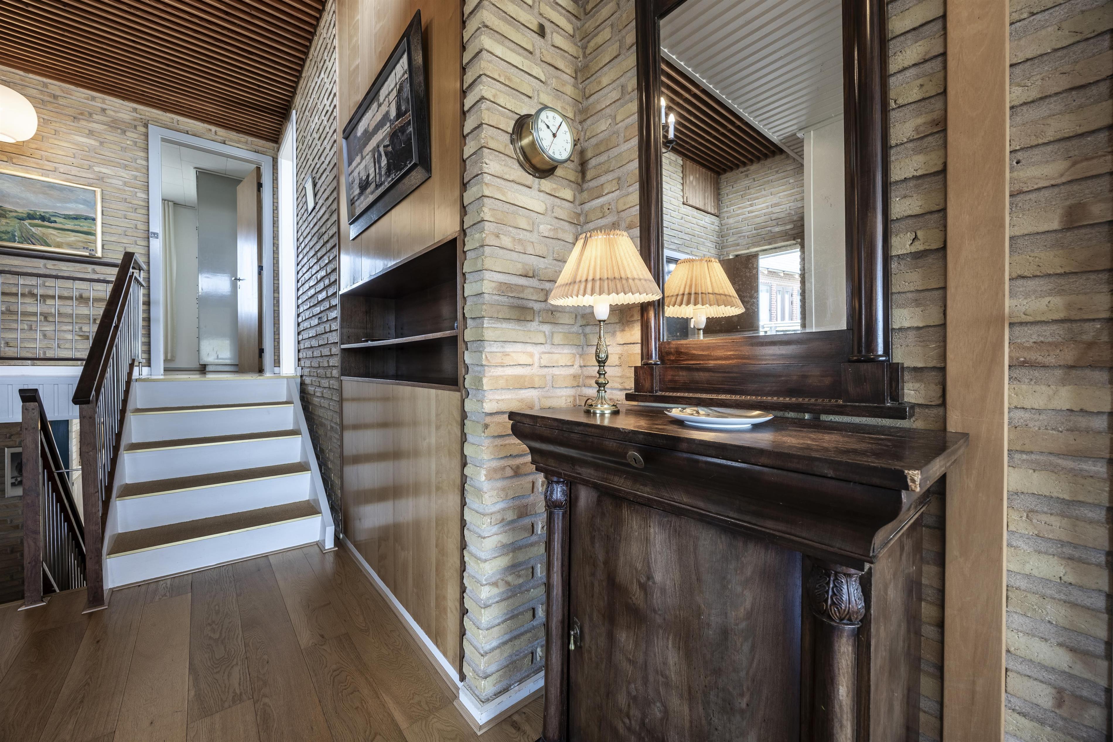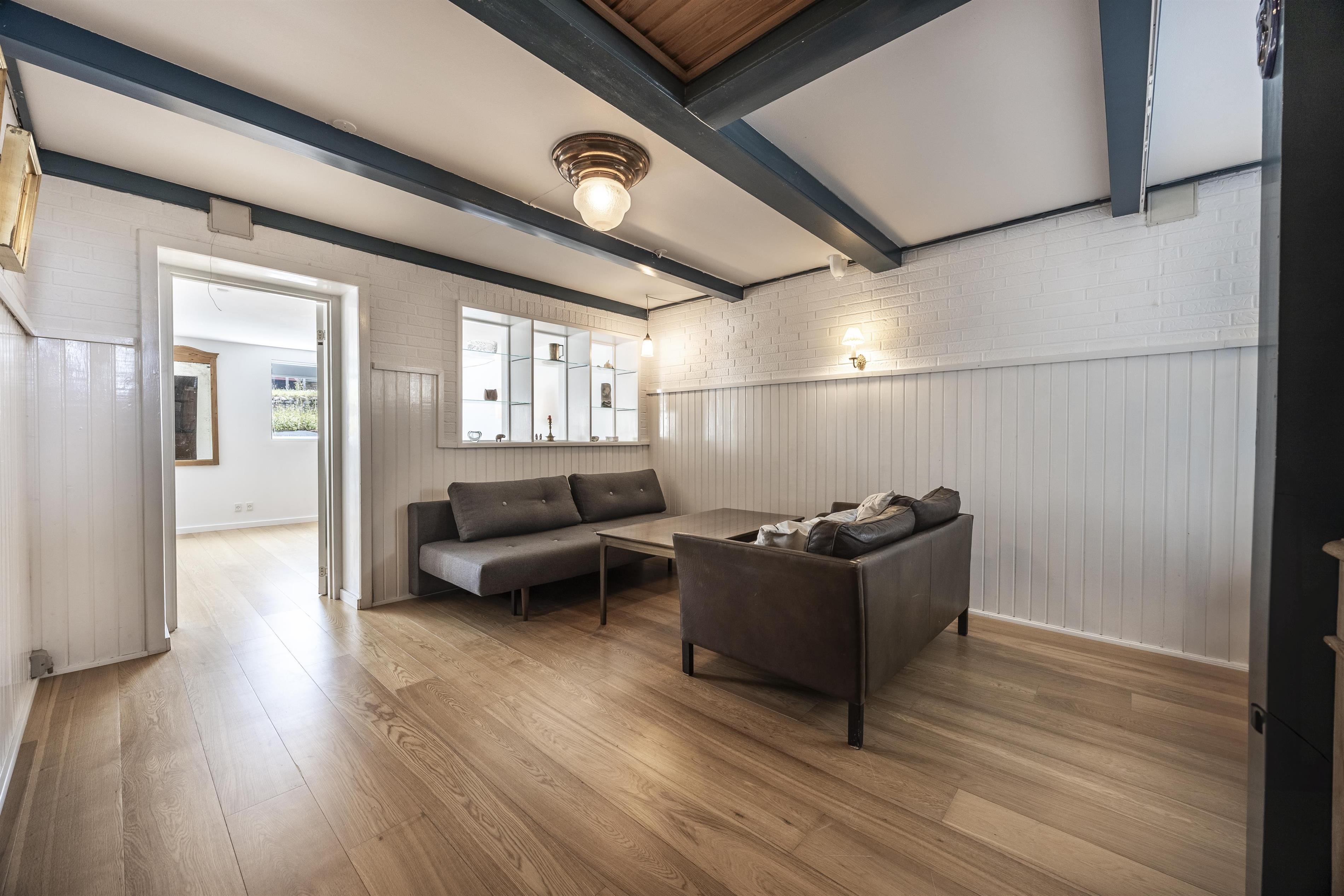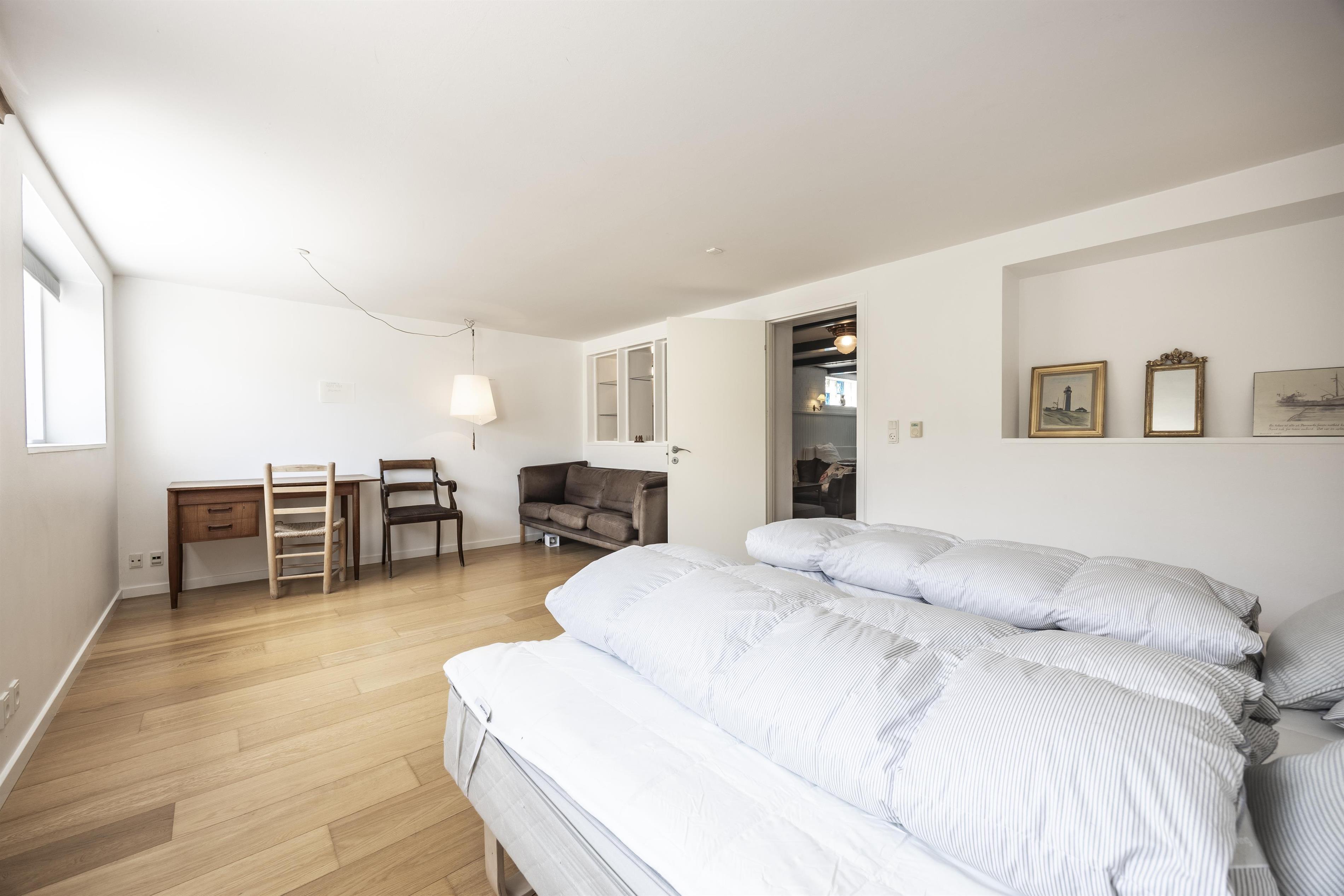 En trappe fører op til øverste niveau, hvor to lyse soveværelser og et badeværelse med badekar venter. I kælderetagen finder I endnu et soveværelse, et vaskerum og et ekstra opholdsrum med sofaer og en hyggelig niche med dobbeltseng – perfekt som en lille privat afdeling.