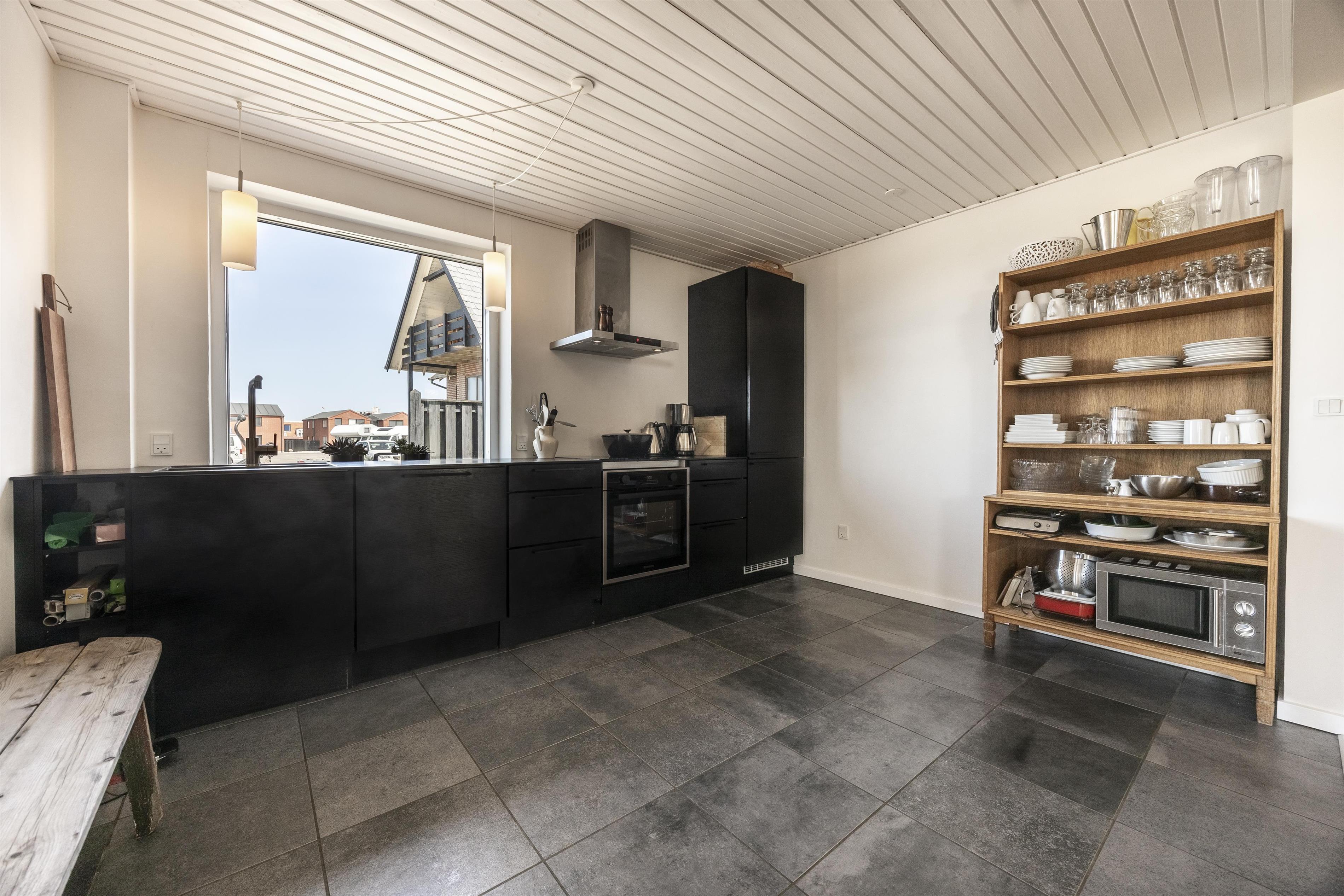 I stueplan finder I et stort, lyst opholdsrum med store vinduer og udsigt til klitterne. Her inviterer sofaarrangementet og den indbyggede pejs til hyggelige aftener med spil, snak og afslapning. Det moderne køkken ligger i åben forbindelse med stuen og har alt, hvad I behøver til feriemåltiderne. Et gæstetoilet fuldender denne etage.