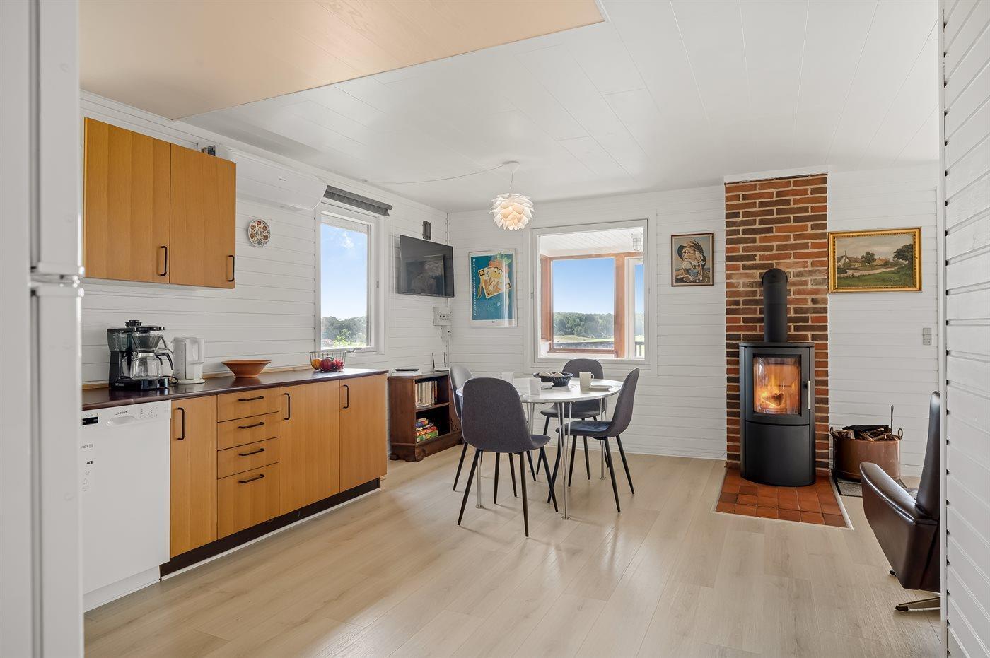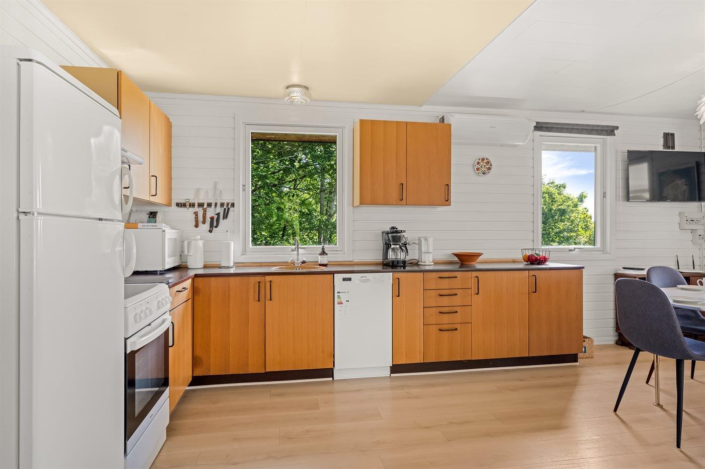 Køkkenet er udstyret med 1 køleskab. Der er 4 keramiske kogeplader, bageovn, mikrobølgeovn samt opvaskemaskine.