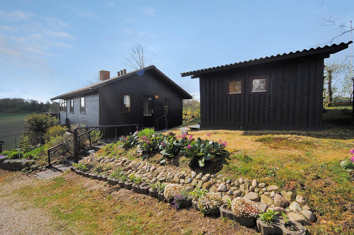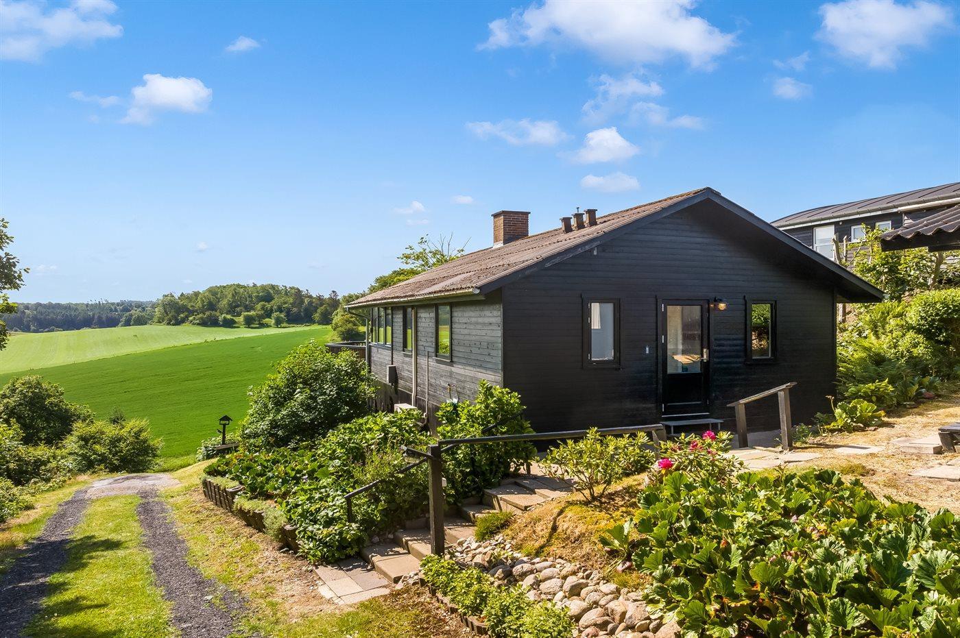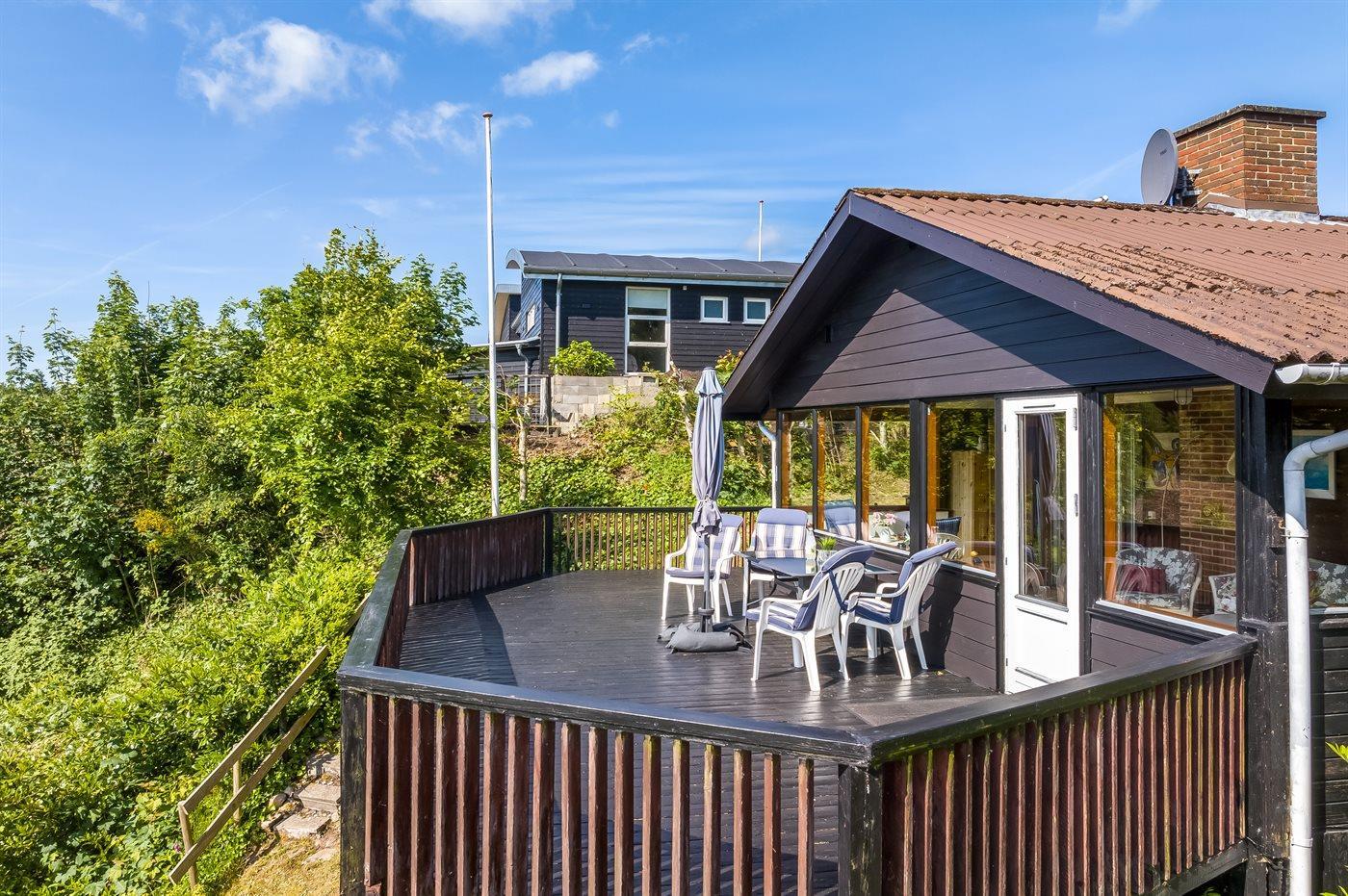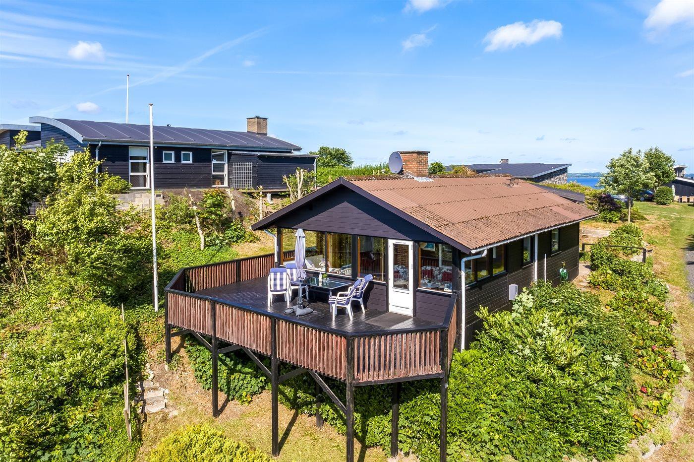 På en ugenert beliggende og kuperet skovgrund, kun 200 m fra fjorden, ligger dette sommerhus, hvor der fra grunden og den store skønne balkon er udsigt over åbne arealer og kig til fjorden. Bemærk: En stejl opkørsel og trapper fører op til huset.