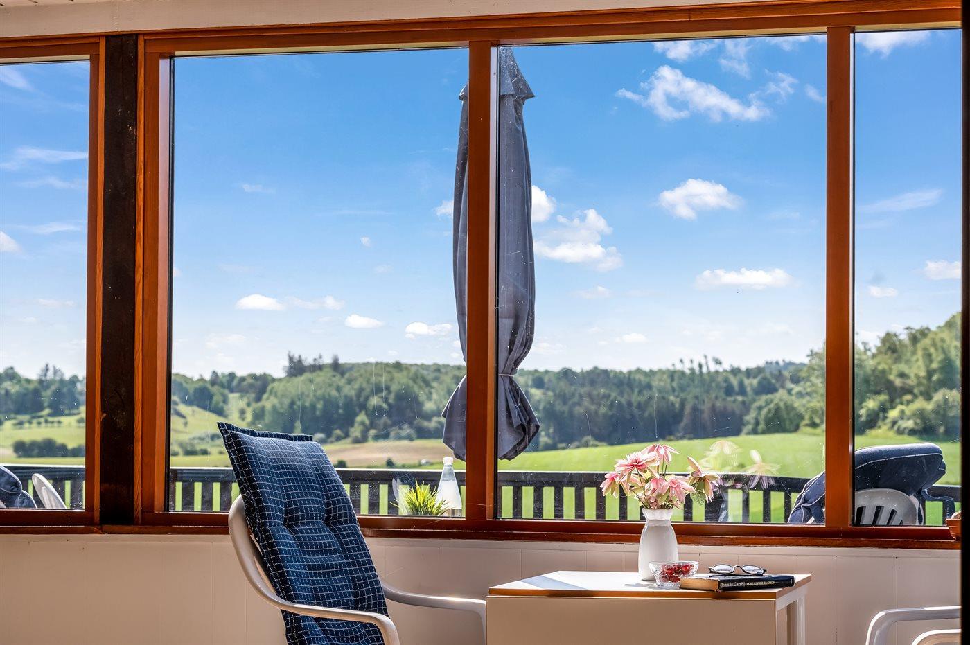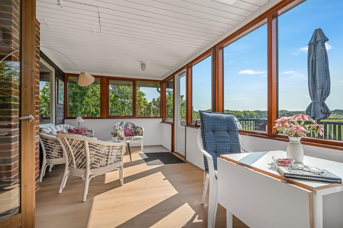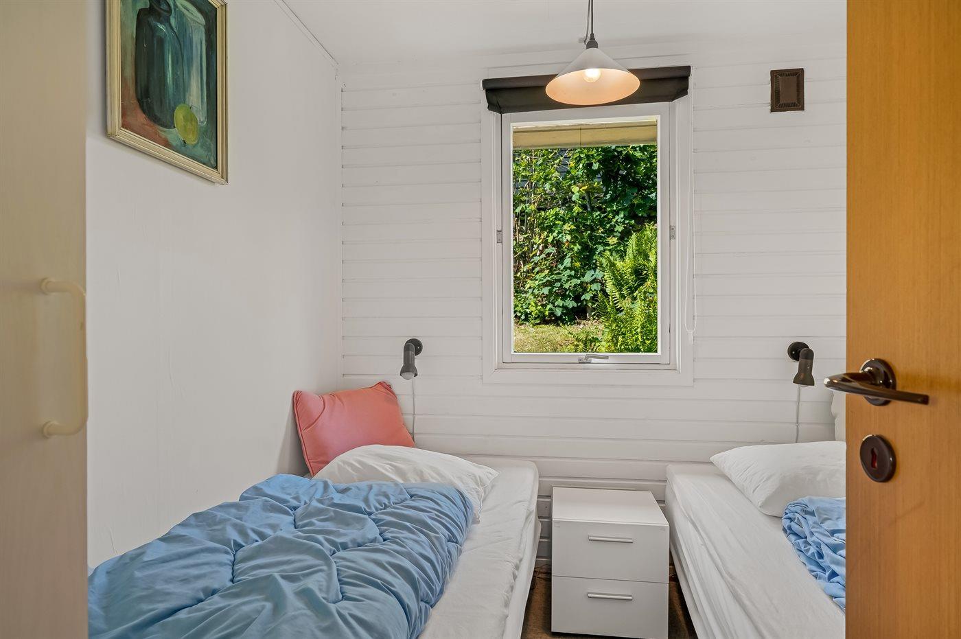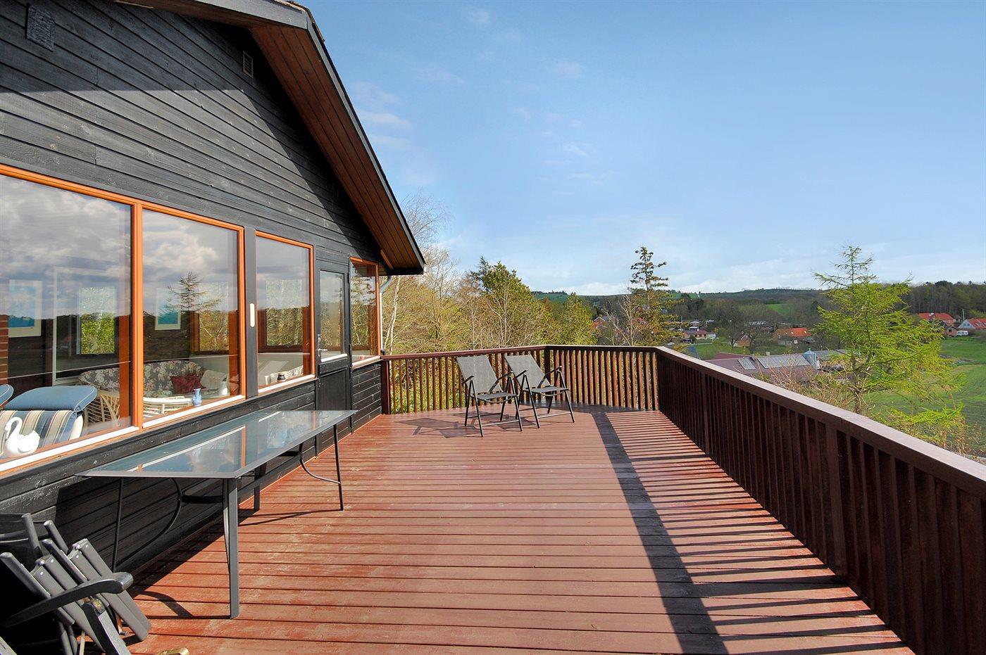 På en ugenert beliggende og kuperet skovgrund, kun 200 m fra fjorden, ligger dette sommerhus, hvor der fra grunden og den store skønne balkon er udsigt over åbne arealer og kig til fjorden. Bemærk: En stejl opkørsel og trapper fører op til huset.