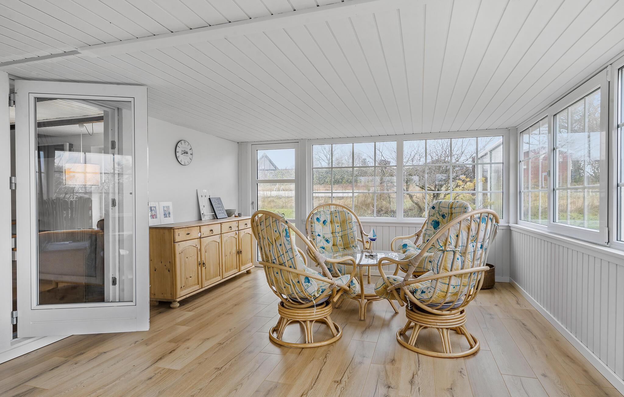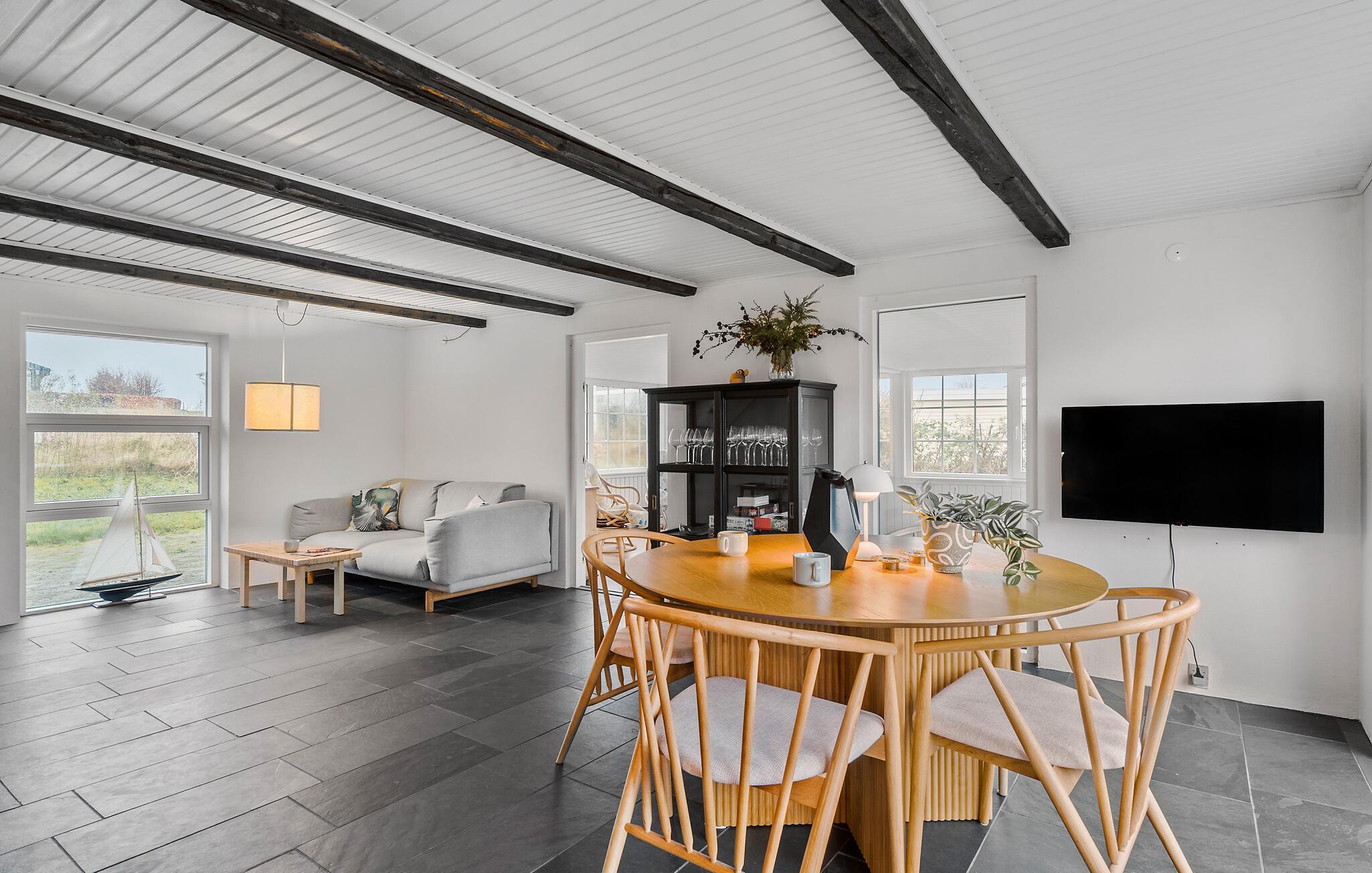 Lad jer inspirere af den særlige atmosfære i dette hyggelige sommerhus og nyd en afslappende ferie nær Hjarbæk Fjord. Så snart I kommer ind, vil I blive overrasket over den lyse og smagfulde indretning. Det åbne opholdsrum med synlige loftsbjælker og store vinduer skaber en indbydende, venlig atmosfære. Find jer godt til rette i de komfortable sofaer og nyd den hyggelige varme fra brændeovnen på kølige aftener. Det moderne køkken lægger op til at tilberede lækre ferieretter sammen, mens den hyggelige spiseafdeling i træ byder på perfekte betingelser for fælles måltider.