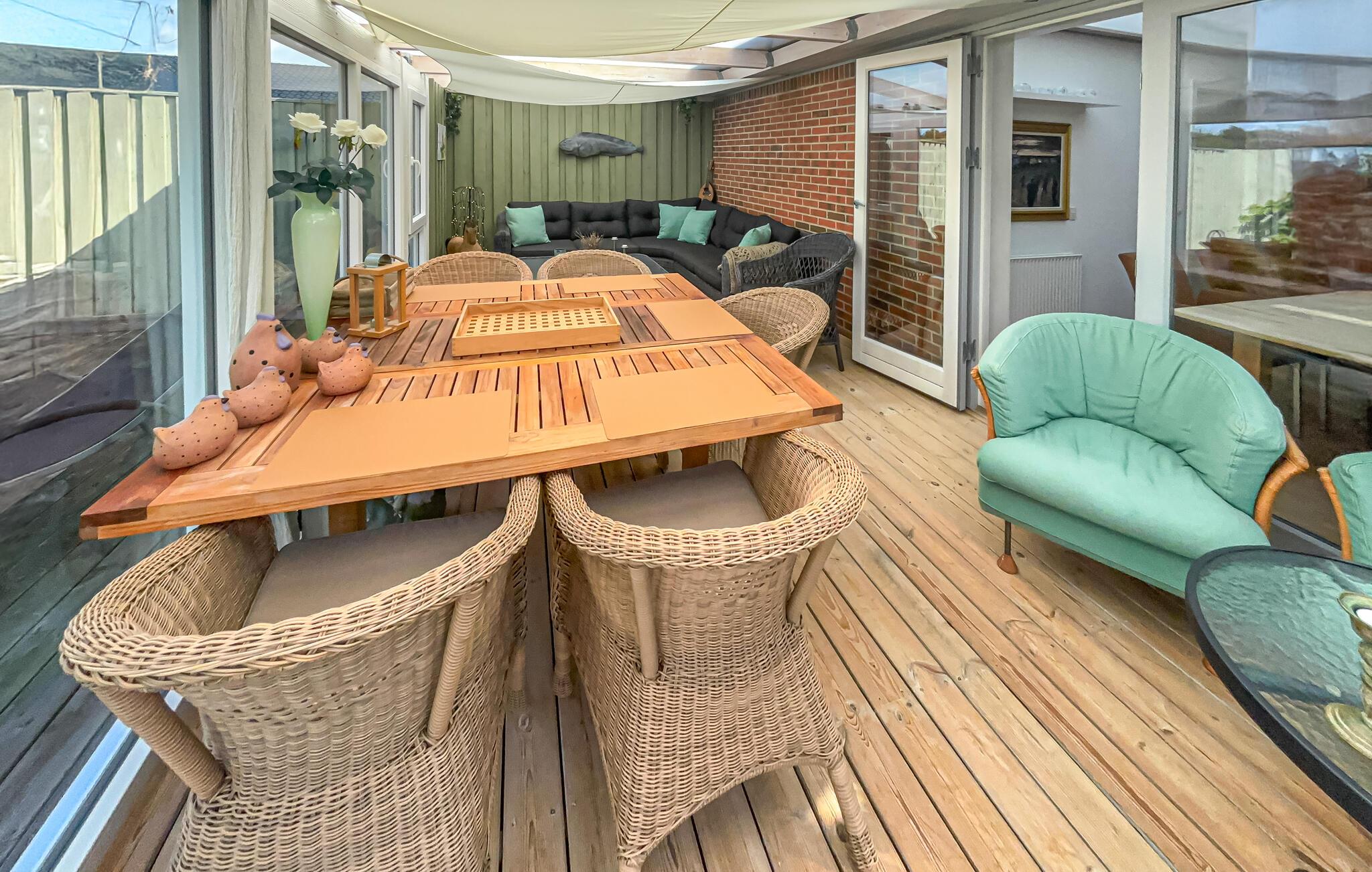 Træd ud i den indbydende udestue med masser af plads til at slappe af. Åbn de store glasdøre og nyd den problemfri overgang til solterrassen. Sæt jer på de komfortable havemøbler, spis udendørs eller læn jer tilbage med en bog, mens solen filtrerer gennem haven.