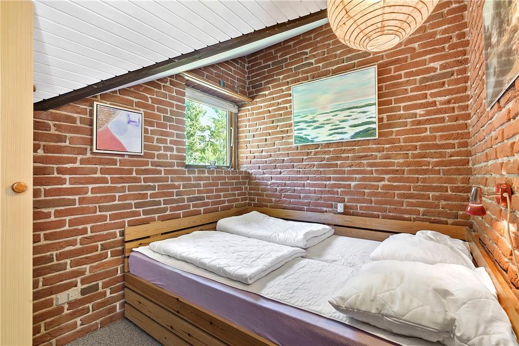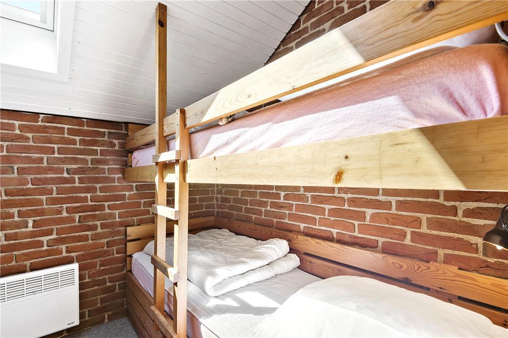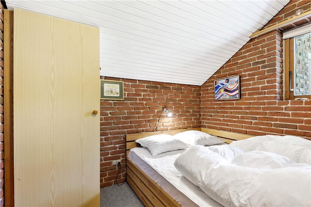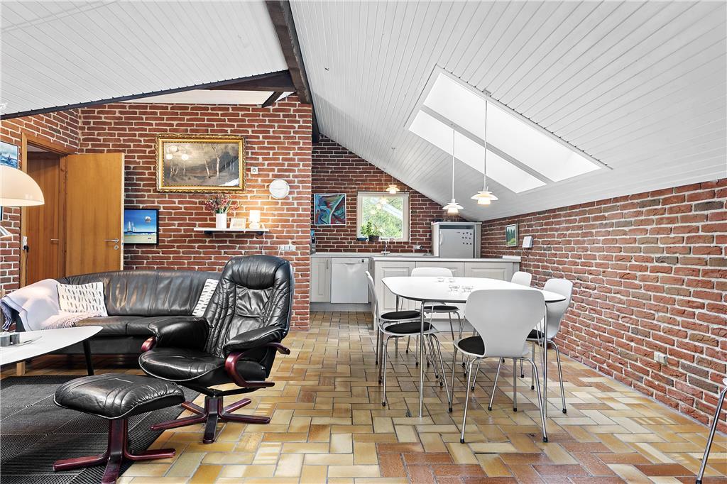 De røde mursten, klinkegulvet og lyse trælofter i stue og køkken giver en rigtig god stemning. Der er masser af plads til 6 personer i den hyggelige sofagruppe eller rundt om spisebordet. Køkkenet er i lyse farver og moderne hvidevarer. I badeværelset er der gulvvarme og en god bruseniche. Der er fire mindre værelser, tre med dobbelt senge og et med køjeseng.