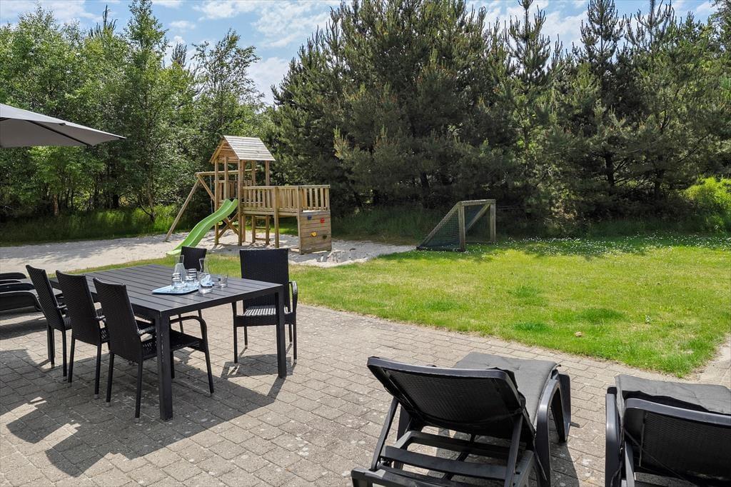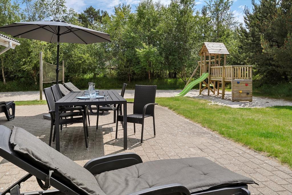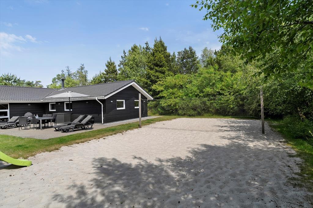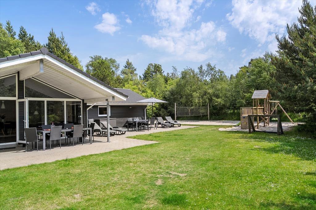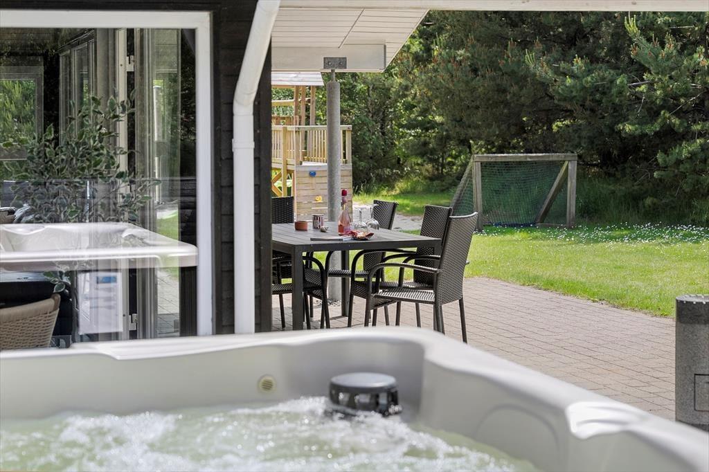 Den 1500 m2 store naturgrund giver jer et væld af udfoldelsesmuligheder: De yngste feriegæster kan gynge og lege i sandkassen, mens de lidt ældre kan dyste på volleybanen, og både store og små kan drible med fodbolde på græsplænen og se, om de kan få den i mål. I kan også tage en stille stund på terrassen – der er flere opholdspladser at vælge imellem, alt efter om I vil sidde i solen eller i skygge under overdækningen. En grill og et havebord er til rådighed, hvis I vil spise ude i det fri, og det udendørs spabad tilbyder jer en perfekt form for udendørs livsnyderi.