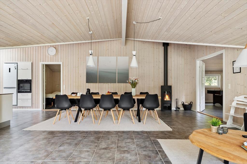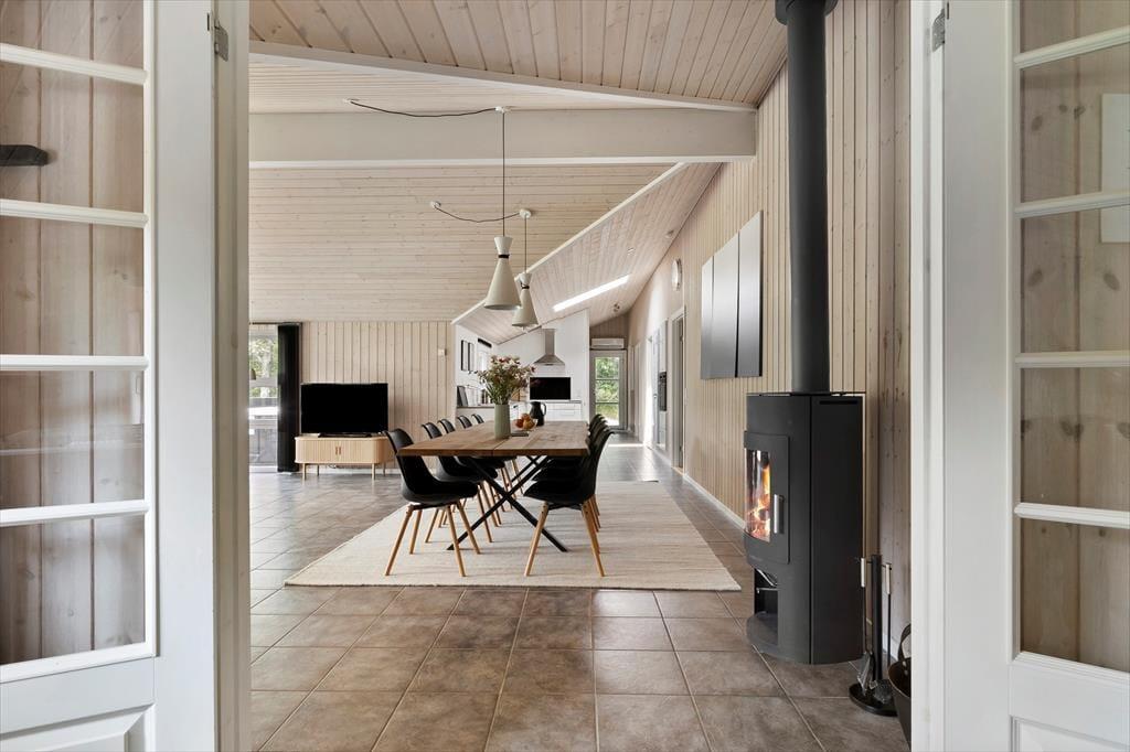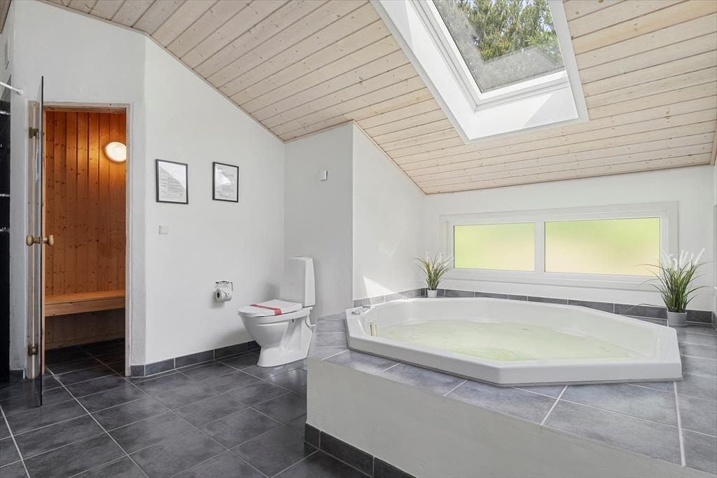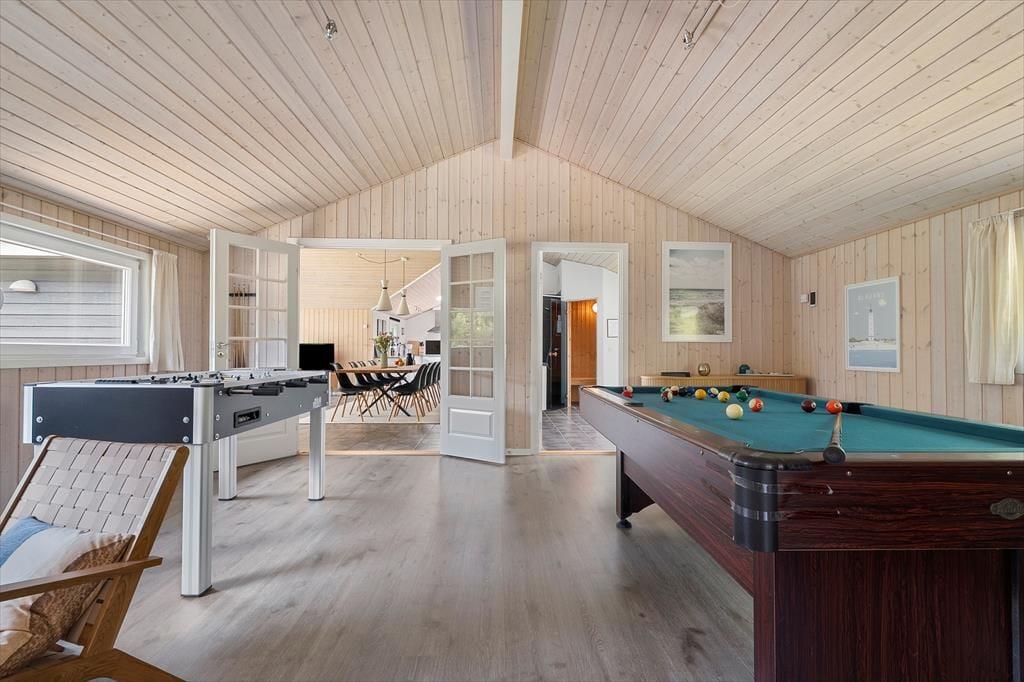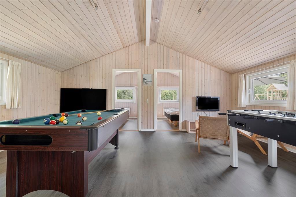 Fra sommerhusets entré har I direkte adgang til opholdsrummet, hvor stue og køkken er forenet. Det er et stort og indbydende rum med langbord, sofaarrangement og brændeovn, så det er et skønt sted at samles, uanset om I skal spise eller slappe af. I aktivitetsrummet kan I lave turneringer i bordfodbold, bordtennis og pool, og hvis dele af selskabet hellere vil koble helt af, kan de gøre brug af husets flotte spabad og sauna. Wellnessfaciliteterne finder I på det største af de to badeværelser, der for øvrigt begge er med bruseniche. Som en skøn detalje er der gulvvarme i størstedelen af huset.