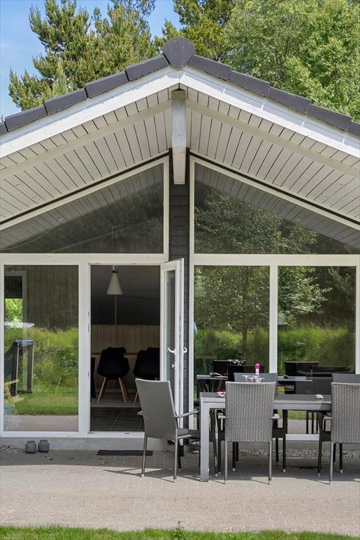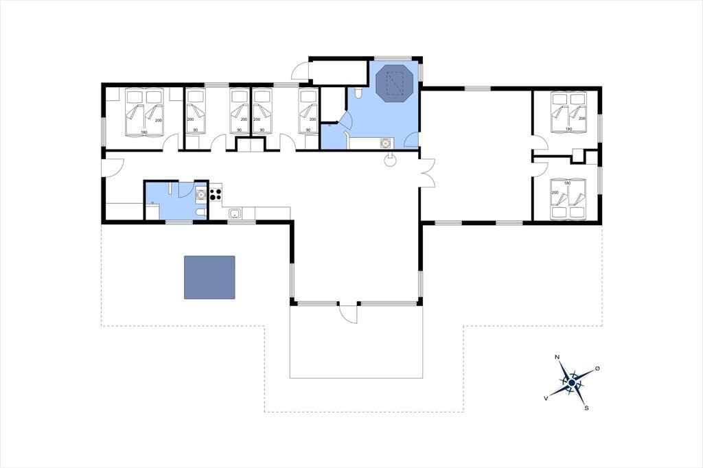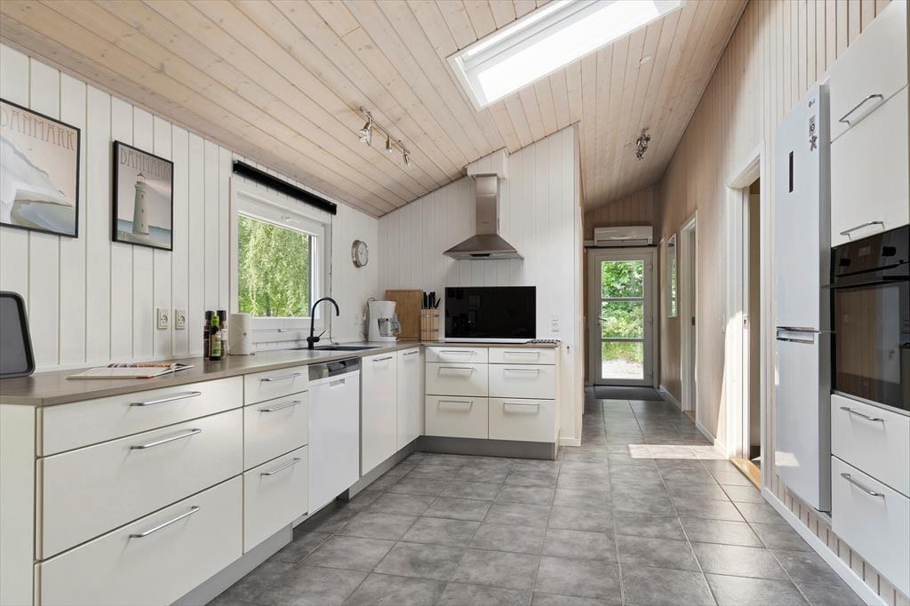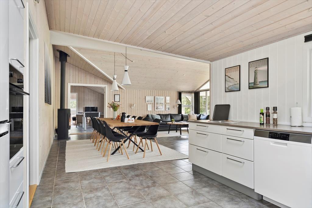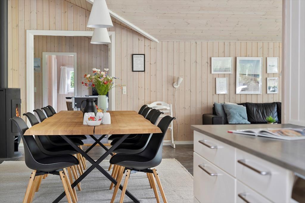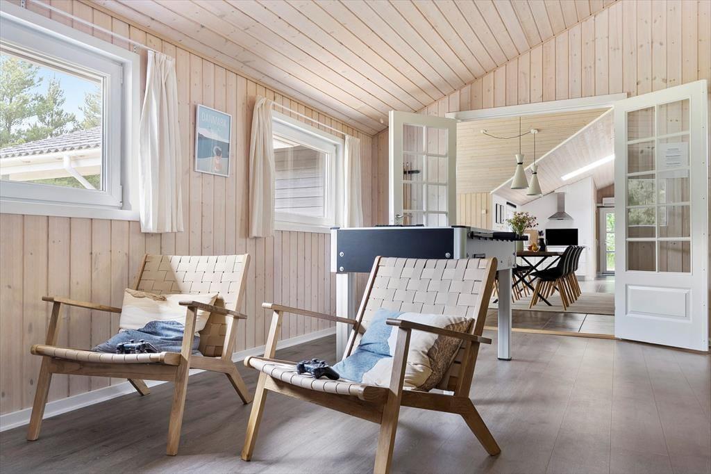 Fra sommerhusets entré har I direkte adgang til opholdsrummet, hvor stue og køkken er forenet. Det er et stort og indbydende rum med langbord, sofaarrangement og brændeovn, så det er et skønt sted at samles, uanset om I skal spise eller slappe af. I aktivitetsrummet kan I lave turneringer i bordfodbold, bordtennis og pool, og hvis dele af selskabet hellere vil koble helt af, kan de gøre brug af husets flotte spabad og sauna. Wellnessfaciliteterne finder I på det største af de to badeværelser, der for øvrigt begge er med bruseniche. Som en skøn detalje er der gulvvarme i størstedelen af huset.