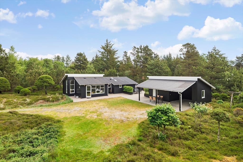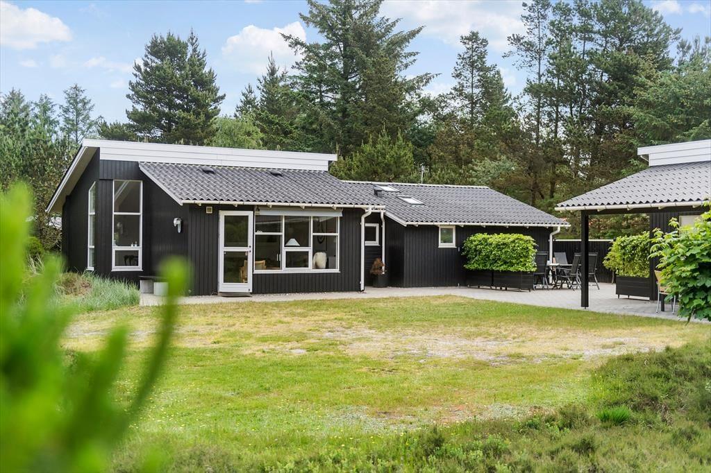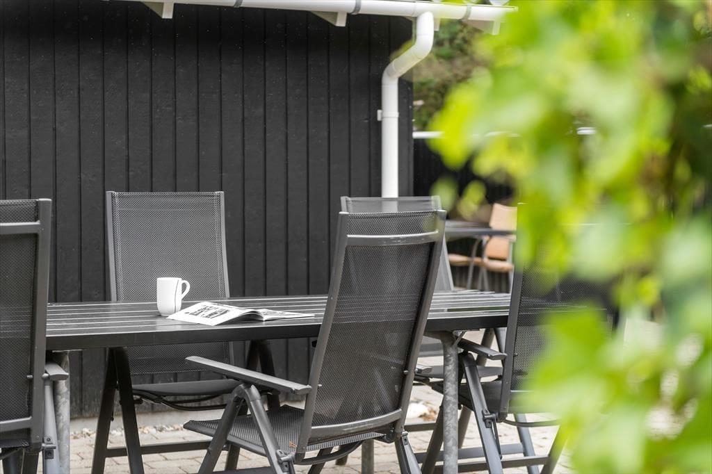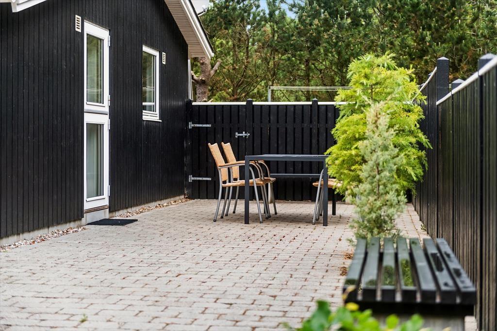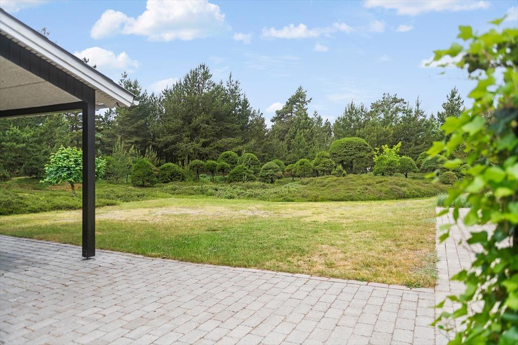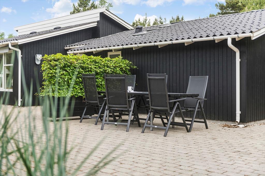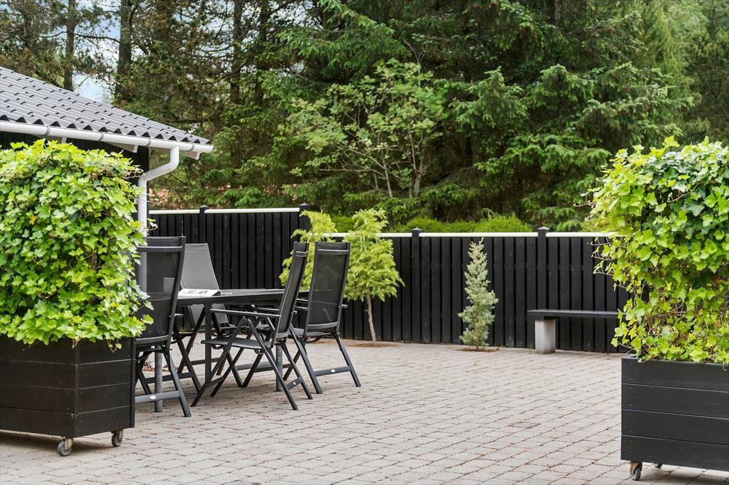 Mens sommerhusets indre er klædt i lyse farvetoner, er det grøn i alle nuancer, der pryder naturgrunden. I sæsonen lyser lyngen op med sin klare lilla farve, og med frit udsyn til den høje blå himmel, bliver det ikke meget smukkere end her i de fredelige omgivelser. På det flisebelagte og dejligt ugenrede terrassemiljø har du rig mulighed for at finde både sol og læ– og skygge, hvis det er det, du går efter – og så kan du endda se frem til at sidde komfortabelt i havemøblerne. Til børnene er der magien at gå på opdagelse eller lege fangeleg i de smukke naturomgivelser.