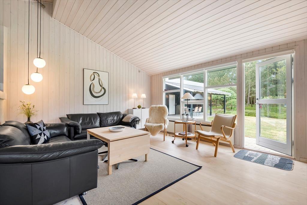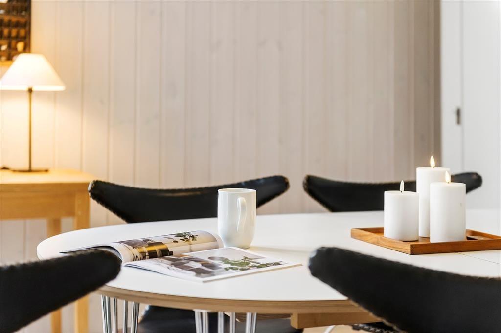 Sommerhusets stue vil sikkert være der, hvor de fleste af indelivets vågne stunder bliver tilbragt. Her kan du nyde det smukke lysindfald og udsigten til naturgrunden gennem de store vinduer, og hvis du vil drikke kaffe, mens du sidder der og kigger ud, kan du hurtigt smutte hen til det åbne køkken for at brygge en kop eller en hel kande. Spisebordet er et rart sted at samles, uanset om I vil spise, spille brætspil eller bare hyggesnakke om alt mellem himmel og jord. Og når det er tid til at sige godnat, kan du og dit selskab fordele jer på husets tre gode soveværelser – selvfølgelig efter at I lige har rundet badeværelset for at børste tænder.