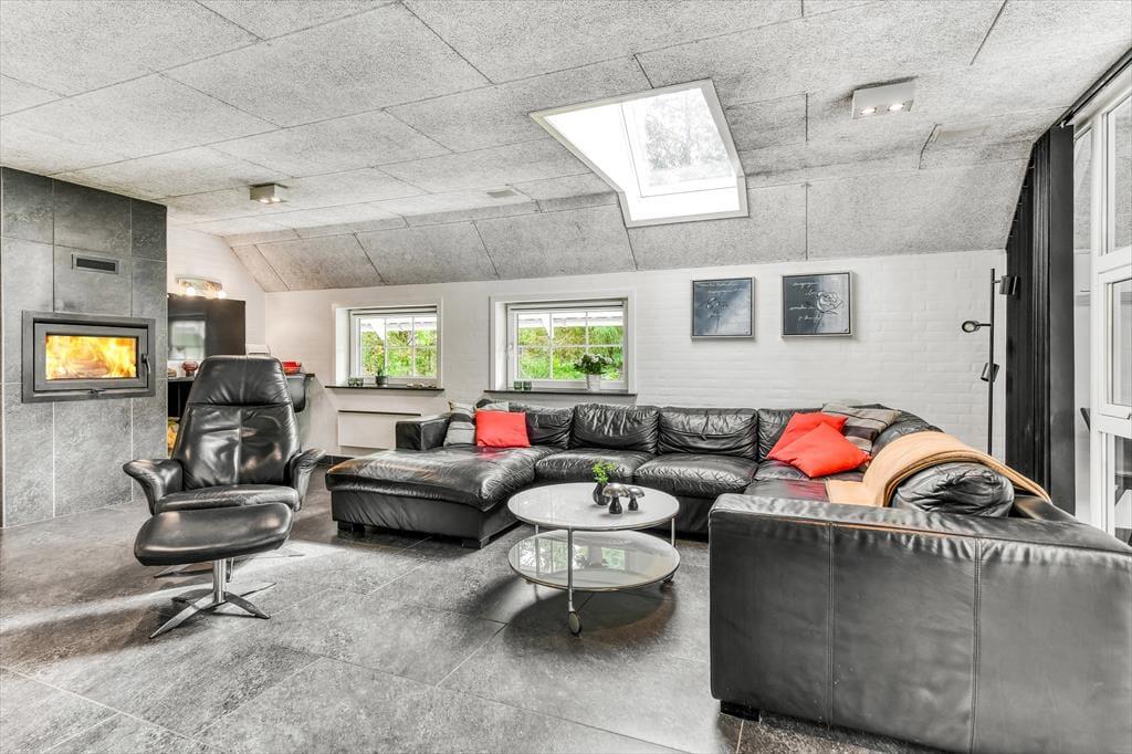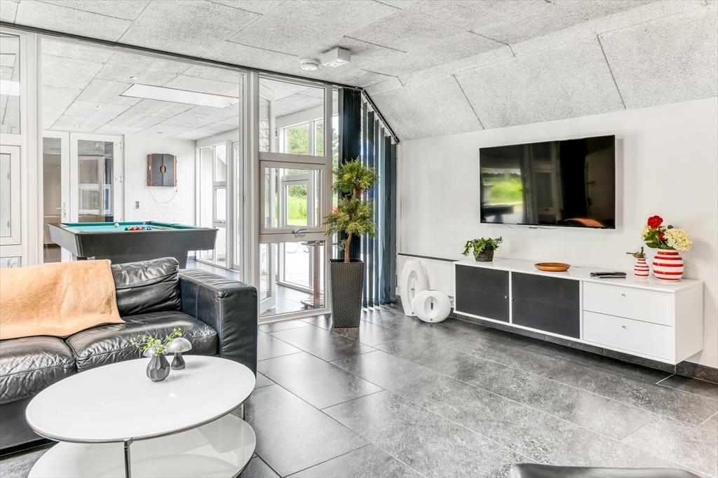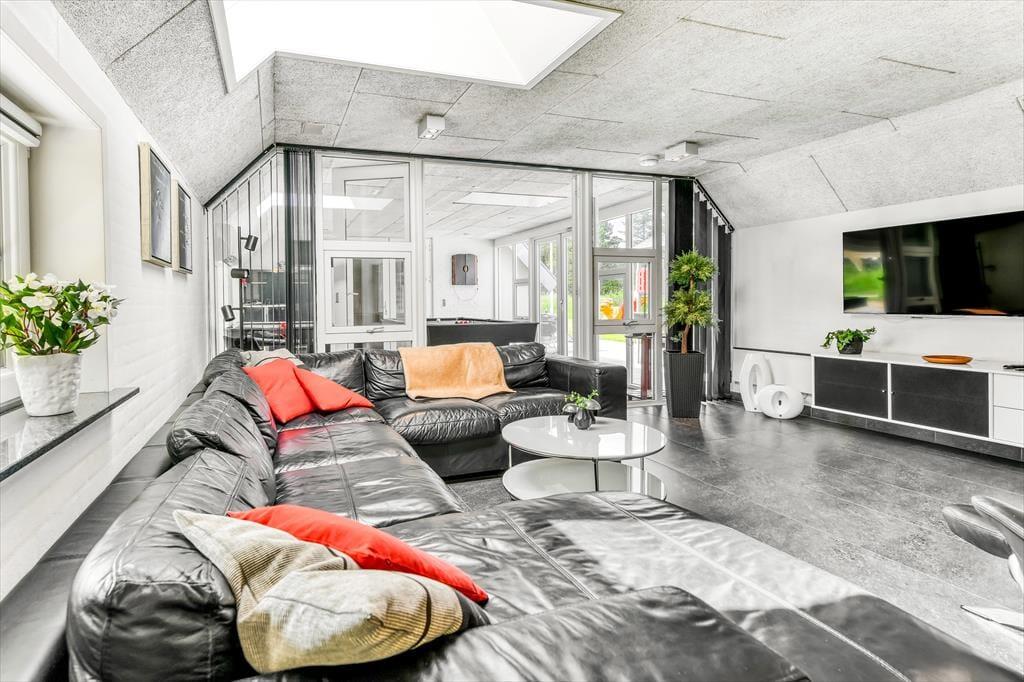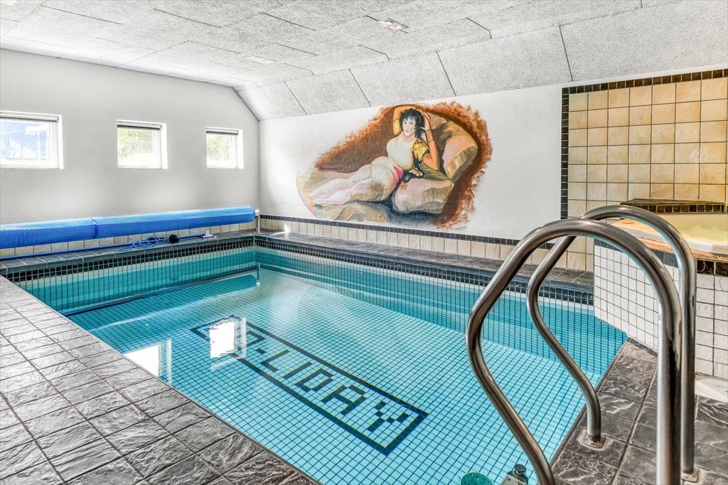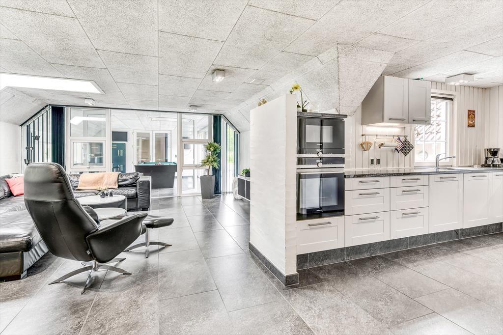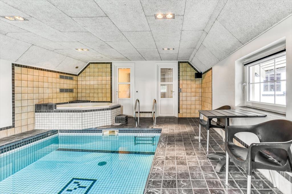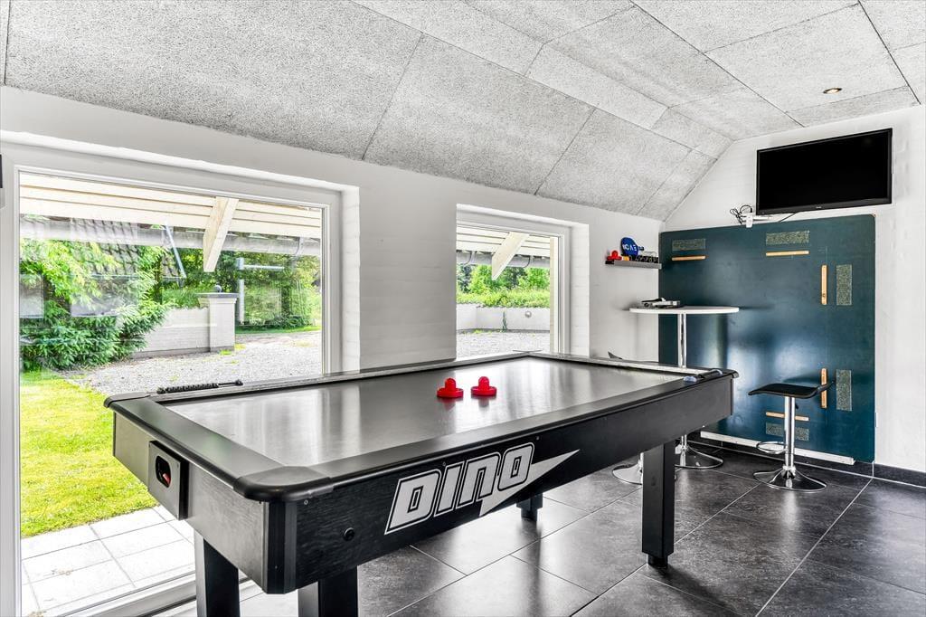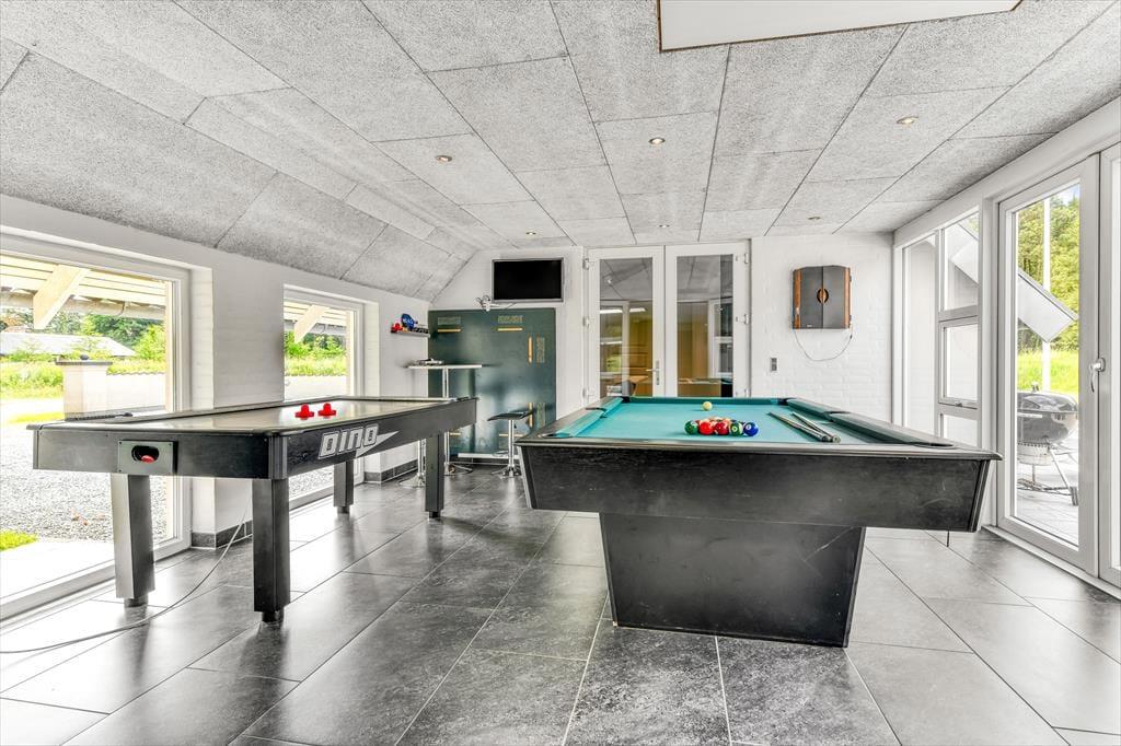 Kort fortalt er sommerhuset et velindrettet eksemplar på hele 210 m2, og hvis du vil holde ferie med både familie og venner, kan det fint lade sig gøre. Med fire soveværelser og hele tre badeværelser kan der nemlig være op til ni personer inden døre. En energivenlig varmepumpe står klar til at opvarme både swimmingpoolens vand såvel som rummene – og hvis det er køligt udenfor, kan du tænde op i stuens indbygningspejs for at sprede ekstra varme og hyggestemning. Et veludstyret køkken er integreret med stuen, og glasdøre gør det muligt at kigge lige ind i aktivitetsrummet, hvor du kan udfordre de andre i billard, bordtennis, airhockey eller dart. Stuens arbejdskrog er perfekt, hvis du skulle få brug for at tjekke din computer, og hvis ungerne vil game, er der en hyggelig krog med spillekonsol i huset. Det er dog sandsynligt, at både du og dem hellere vil bruge tiden i den lækre wellnessafdeling, der byder på både swimmingpool, spabad og sauna.