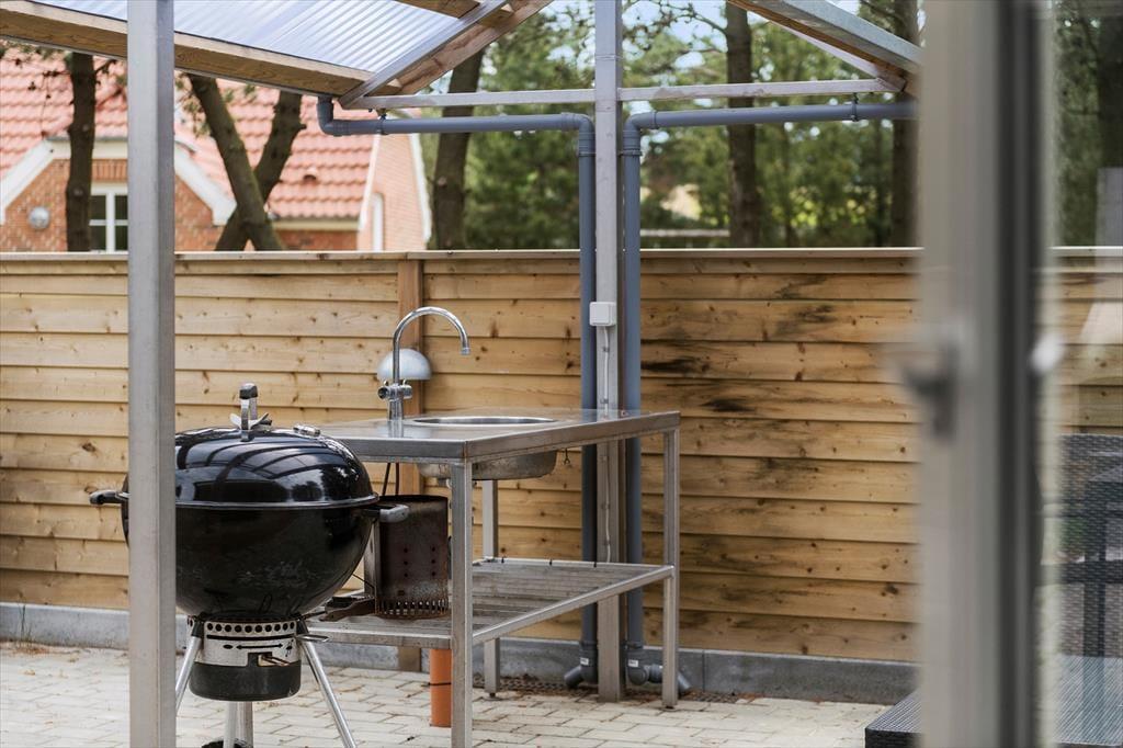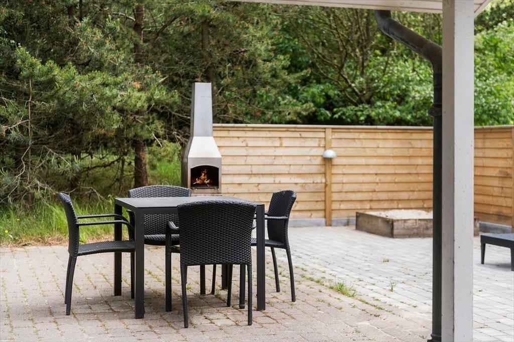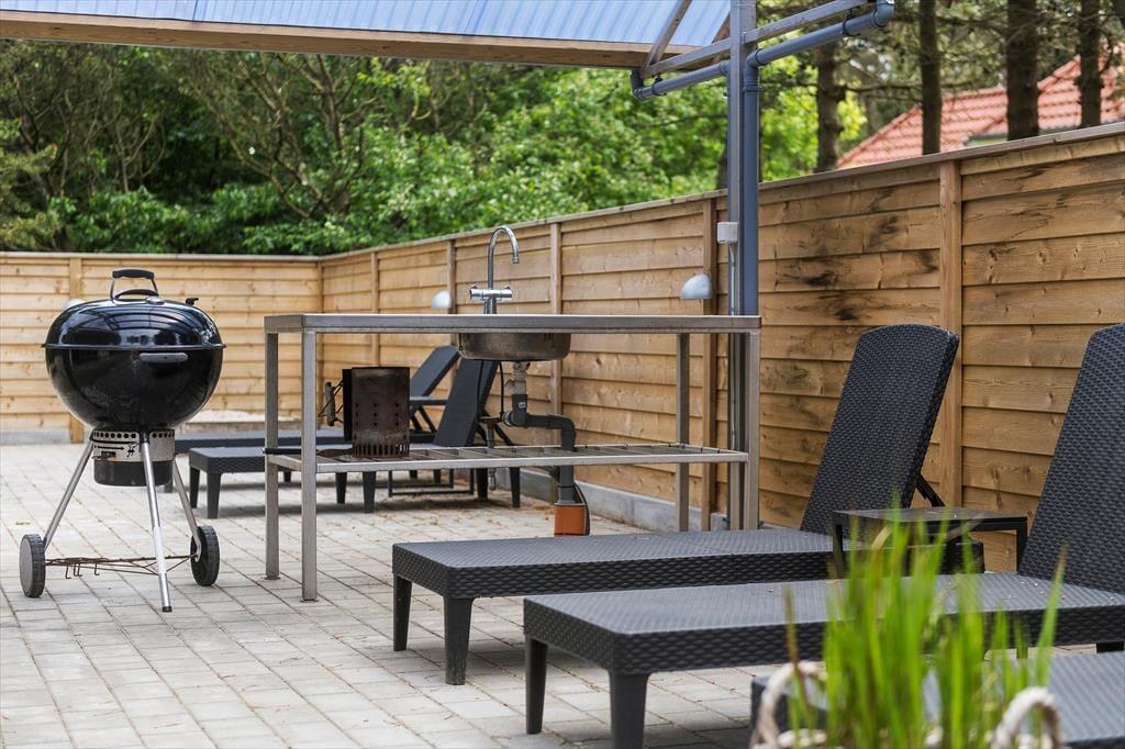 Terrassen er det perfekte sted, hvis du vil fordybe dig i en spændende krimi, drikke en kop kaffe til lyden af fuglesang eller bare slappe af og lade tankerne flyve. Et plankeværk skærmer opholdsmiljøet godt af, og der er både solrige og skyggefulde opholdspladser at vælge imellem. Under halvtaget er der etableret et simpelt udekøkken, som du kan benytte, når du vil forkæle familien med et nygrillet aftensmåltid – og hvis du har været ude på fisketur, er det måske også her, du skal rense din fangst. Omgivelserne er rolige og ugenerede, og også når du leger med børnene, er det herligt at være omgivet af naturgrundens smukke træer.