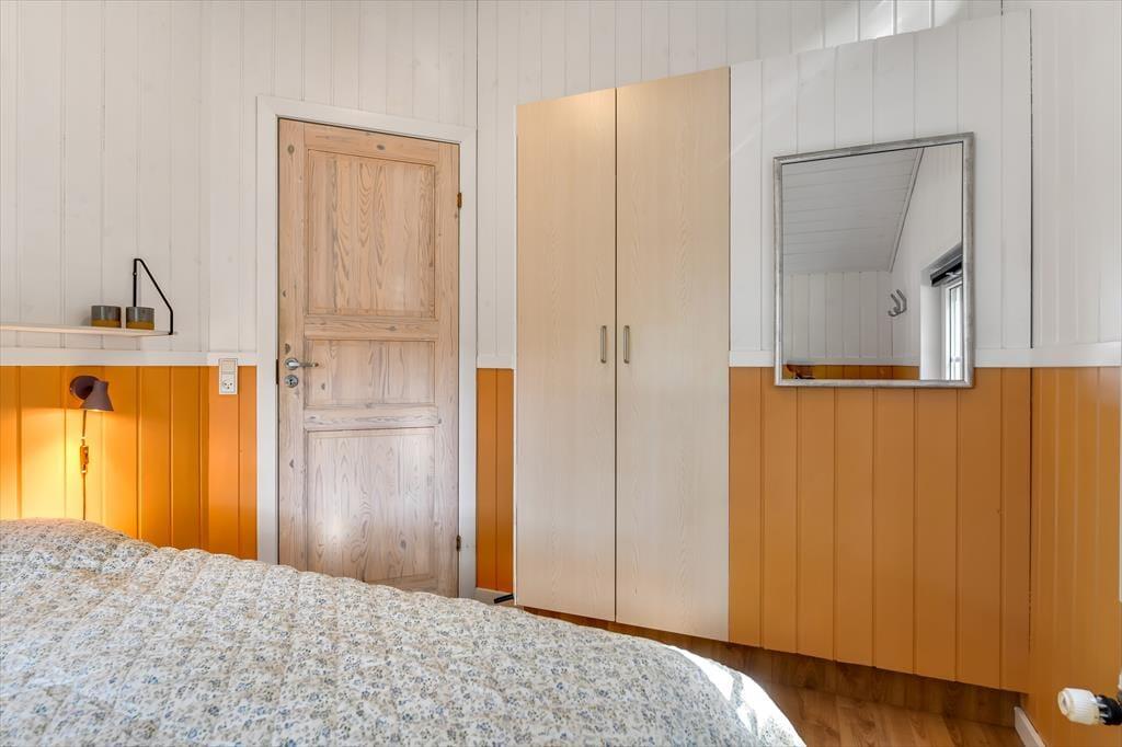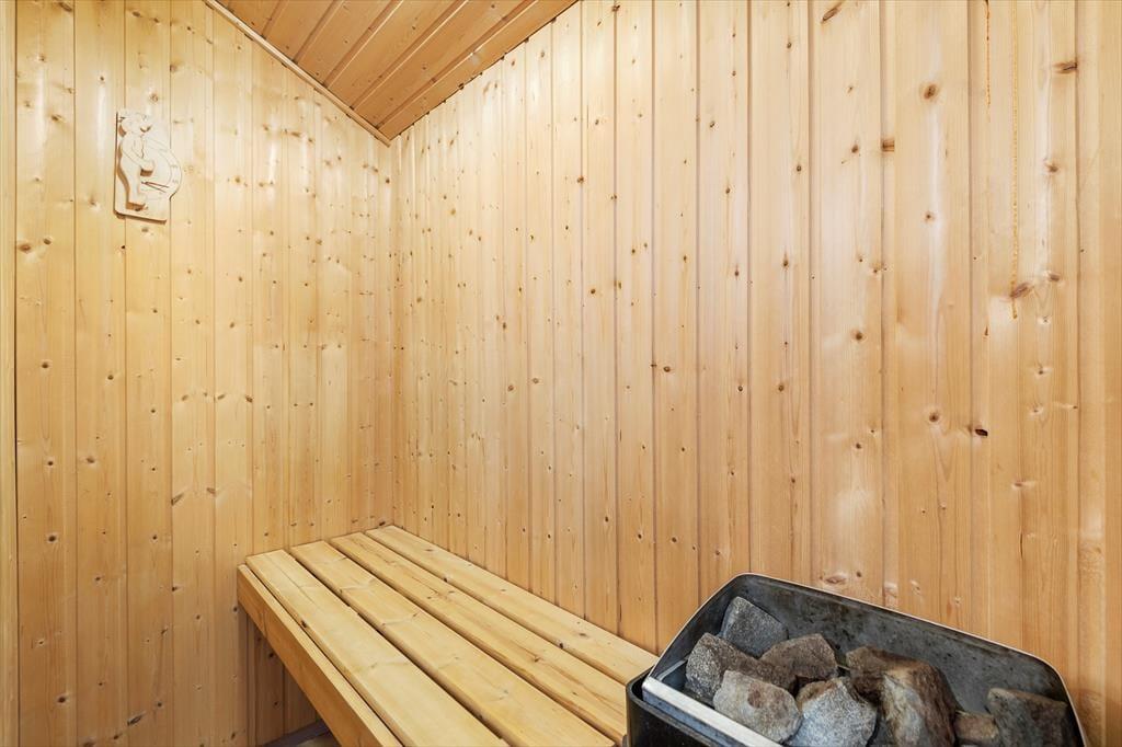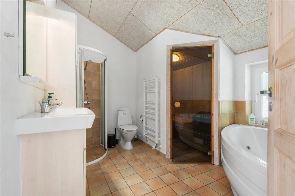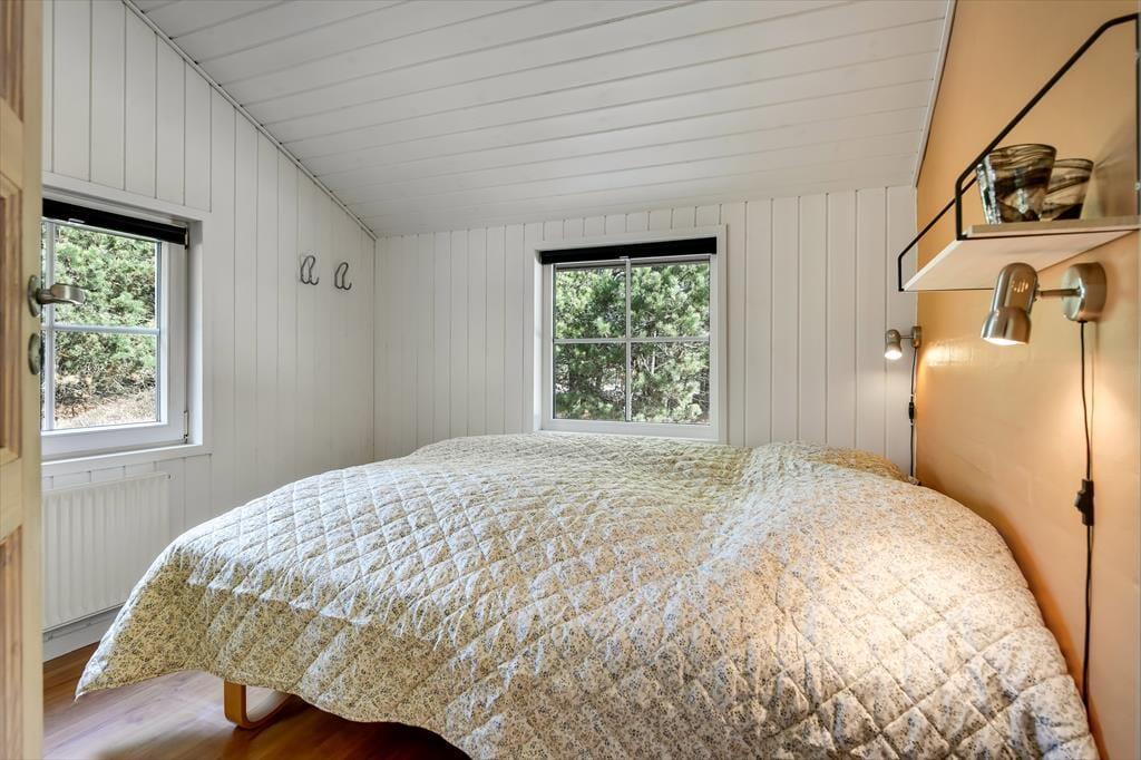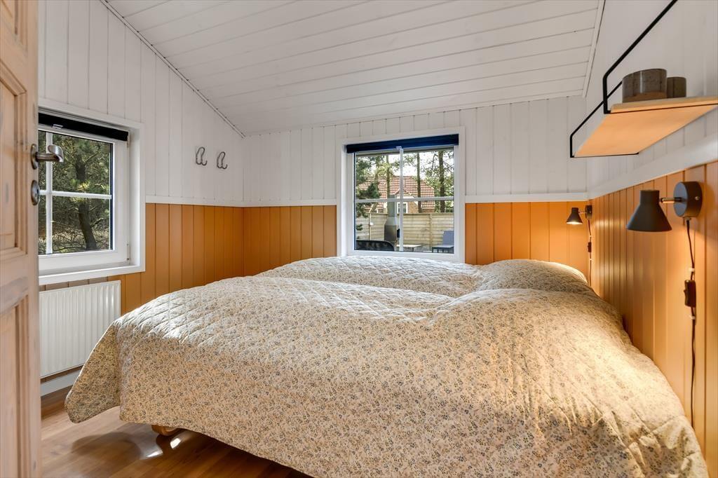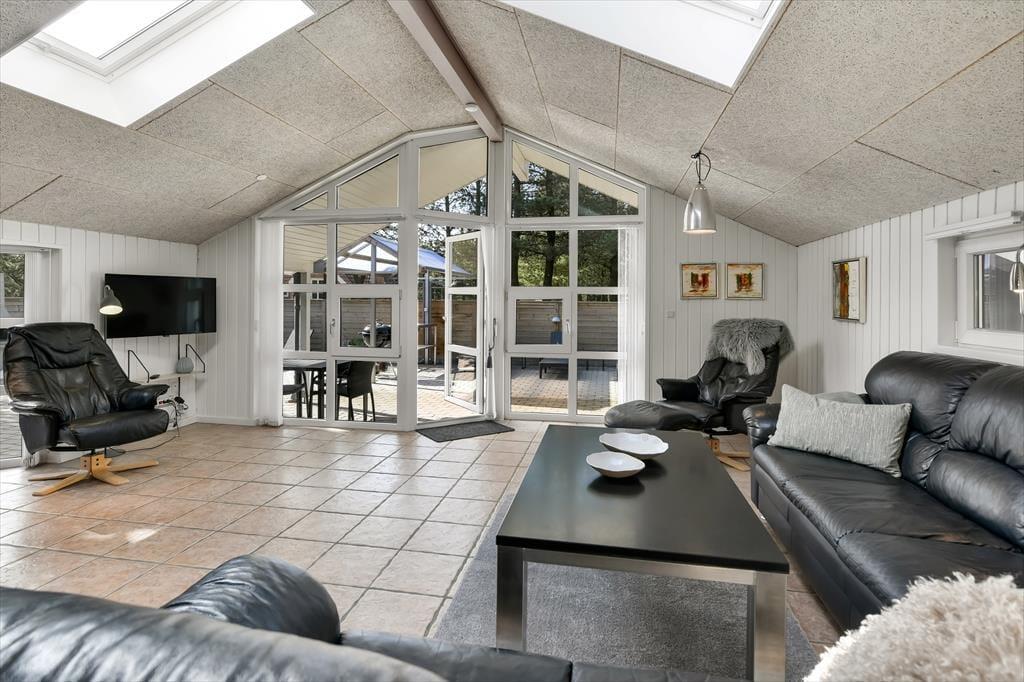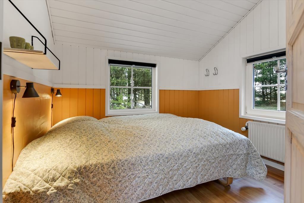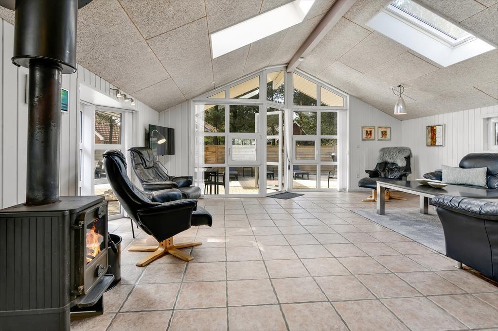 Sommerhusets hjerte og hyggelige samlingspunkt er stuen, der har loft til kip med ovenlysvinduer og akustikplader – og det er bare lidt af de detaljer, der er med til at give det store rum en særligt skøn atmosfære. Sofaerne og det øvrige komfortable møblement sørger for, at du kan sidde rart, og selv når du står i det åbne køkken, har du en lys og veludstyret ramme om madlavningen. Det er muligt at være otte personer, ikke bare her i opholdsafdelingen, men også på de fire soveværelser, når det er ved at være sengetid. Værelserne er for øvrigt smart fordelt i begge ender af huset, og begge afsnit er udstyret med et badeværelse, så huset passer ideelt til for eksempel to børnefamilier. På det største badeværelse er der skruet op for wellnessfornemmelsen, for her finder du både et spabad og en sauna.