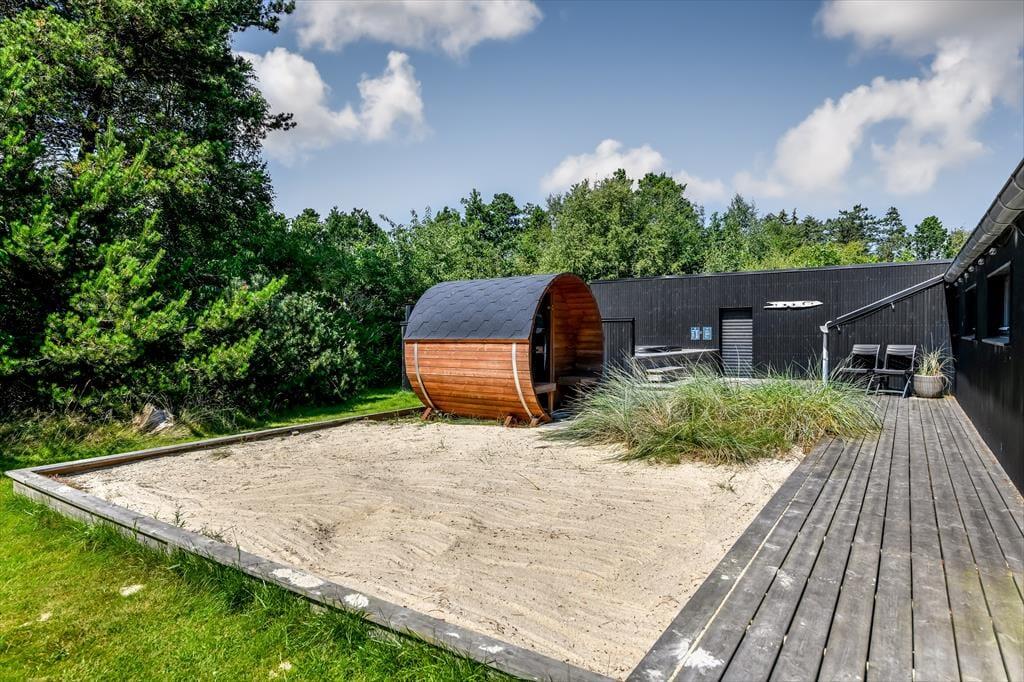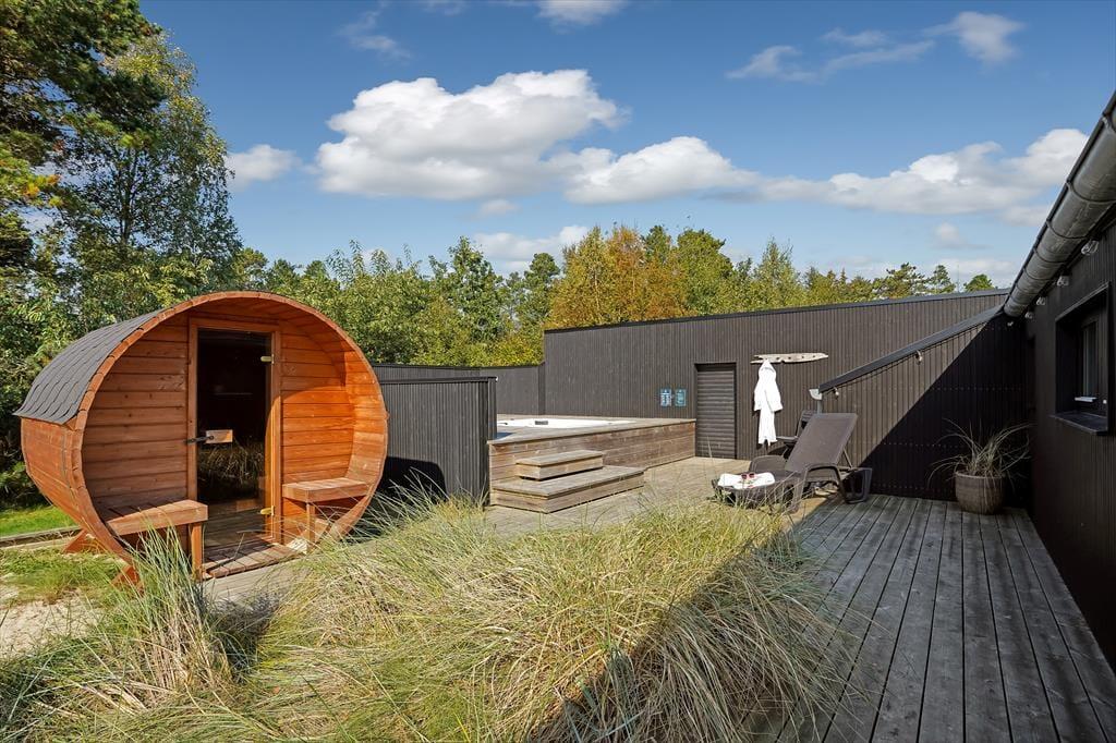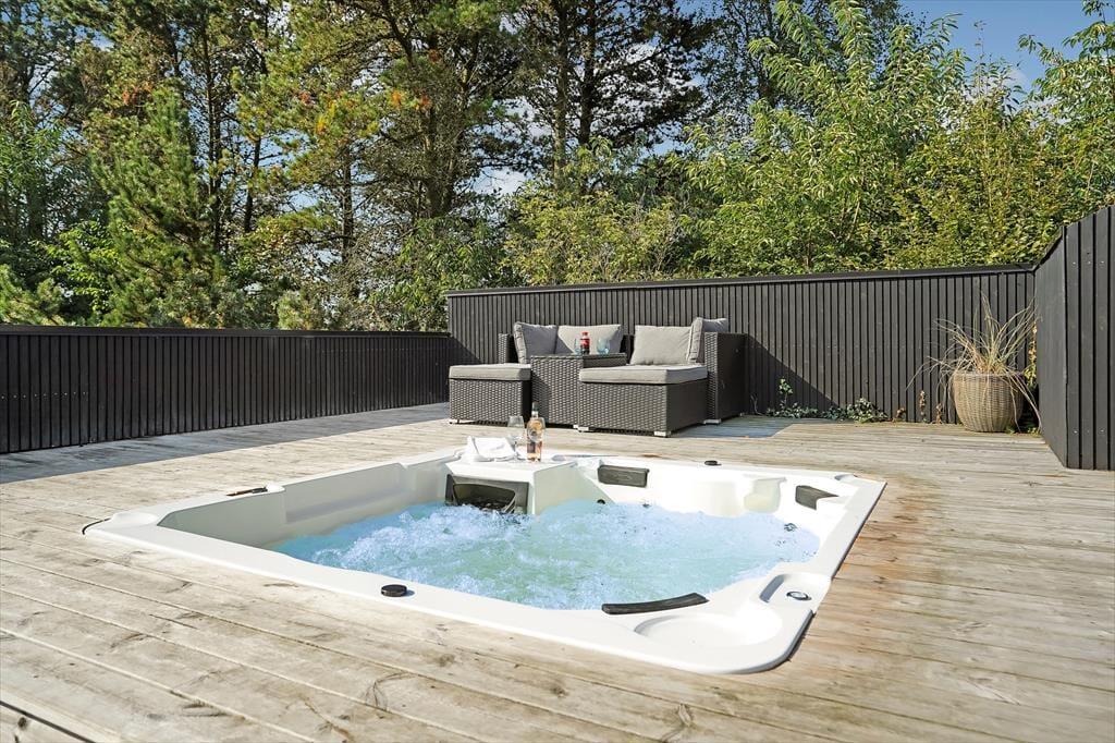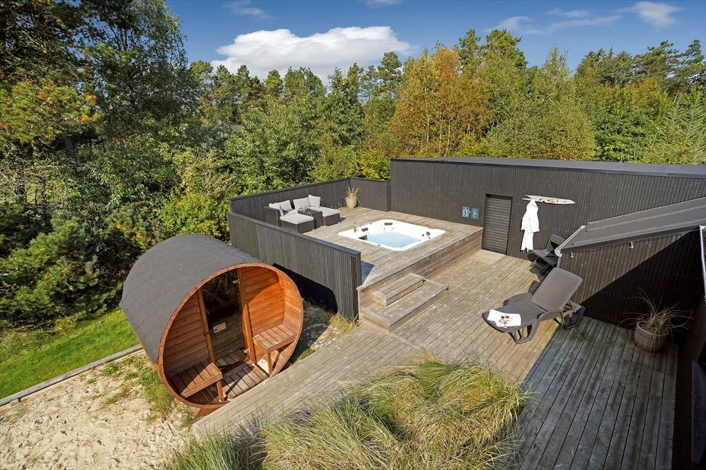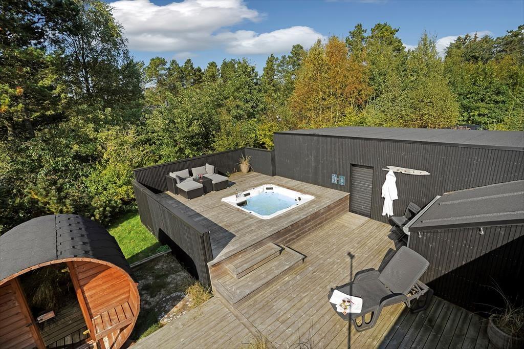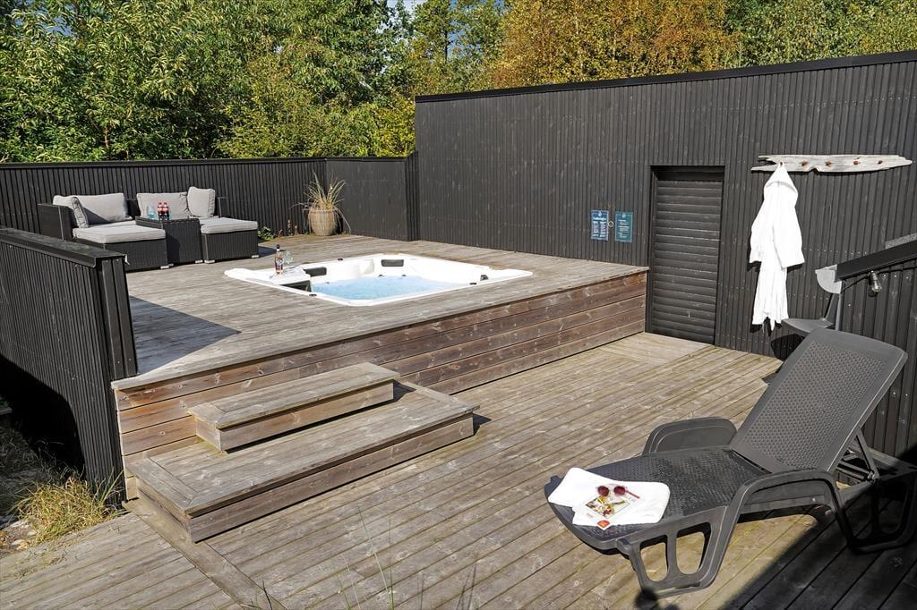 Den lukkede grund omkring sommerhuset skaber en privat oase, hvor du kan nyde udendørs livet i fulde drag. Det udendørs wellnessområde er en ægte perle, hvor du kan forkæle dig selv i det varme udespa og få en afslappende saunaoplevelse, alt imens du nyder udsigten til den omkringliggende natur. Den store terrasse er ideel til lange, solrige dage, hvor du kan slappe af i loungemøblerne, grille lækre måltider eller bare lade feriefreden sænke sig over dig. Børnene kan lege frit i klatretårnet, eller på den velholdte græsplæne, som er perfekt til både leg og afslapning.