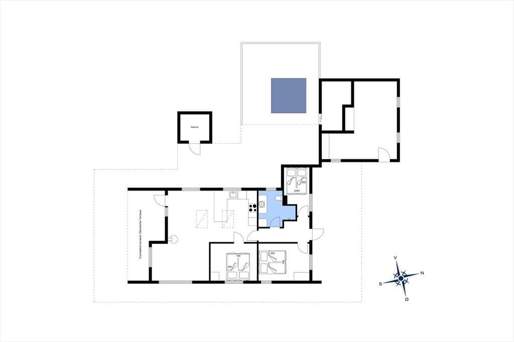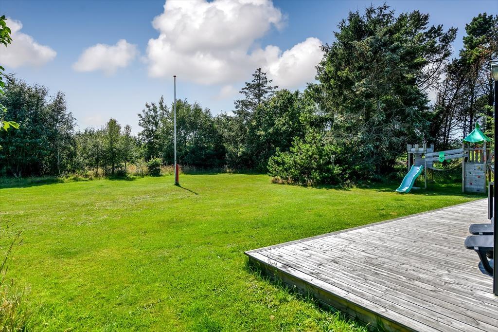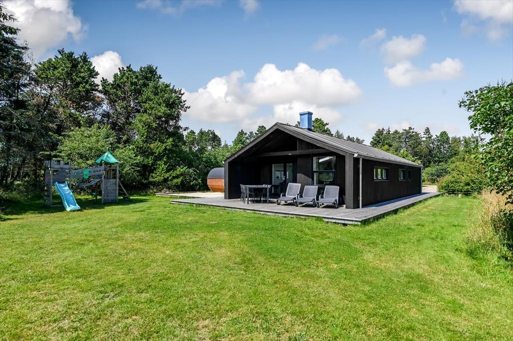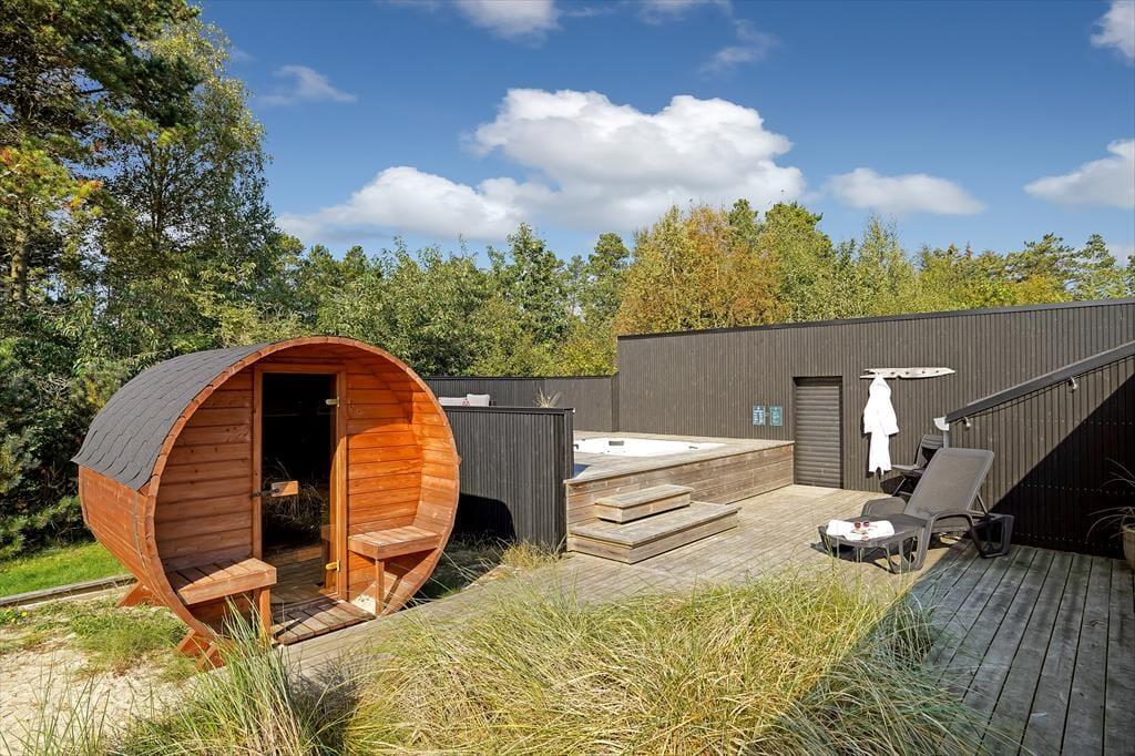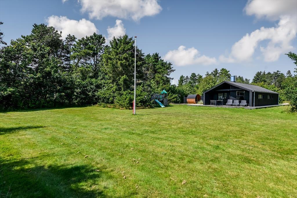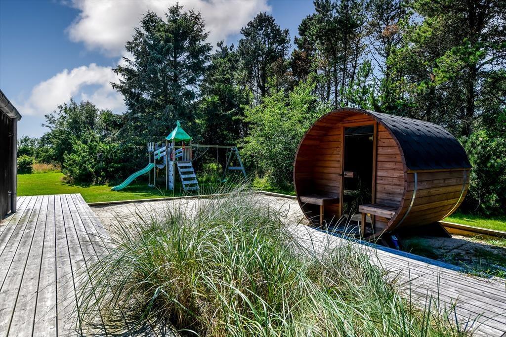 Den lukkede grund omkring sommerhuset skaber en privat oase, hvor du kan nyde udendørs livet i fulde drag. Det udendørs wellnessområde er en ægte perle, hvor du kan forkæle dig selv i det varme udespa og få en afslappende saunaoplevelse, alt imens du nyder udsigten til den omkringliggende natur. Den store terrasse er ideel til lange, solrige dage, hvor du kan slappe af i loungemøblerne, grille lækre måltider eller bare lade feriefreden sænke sig over dig. Børnene kan lege frit i klatretårnet, eller på den velholdte græsplæne, som er perfekt til både leg og afslapning.