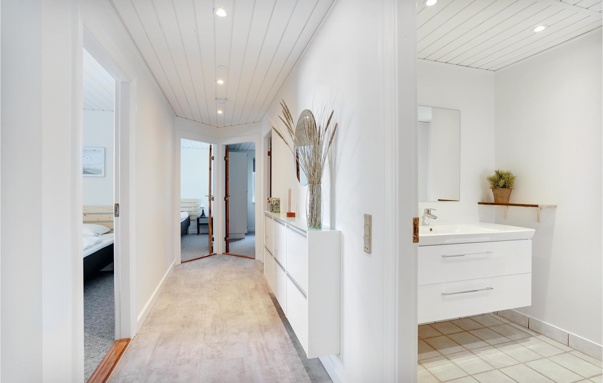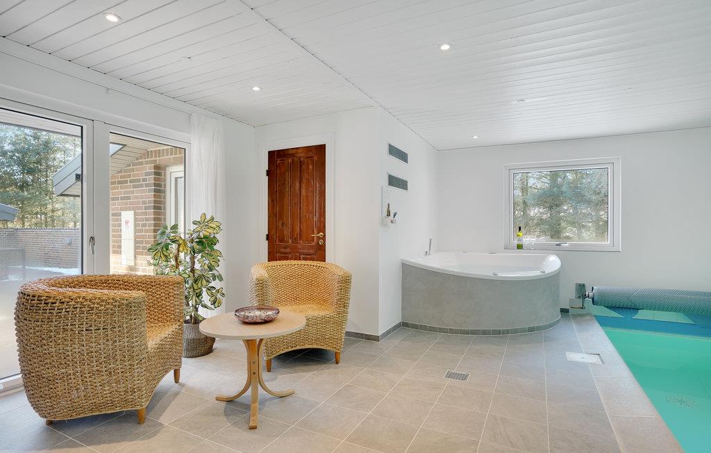 Ud over swimmingpoolen kan I også nyde såvel spabadet som saunaen, efter en frisk gåtur langs havet eller de skønne skovområder lige uden for døren. Ud over de fem soveværelser giver husets indgang og bryggers lidt ekstra plads, så ferien fungerer optimalt. Fra stuen har I nem adgang til den dejlige terrasse med gode læmuligheder, hvor I både kan nyde solen og hygge med lækker mad om aftenen. Haven byder også på et legetårn til børnene, og fra huset er der desuden udsigt til den flotte golfbane.